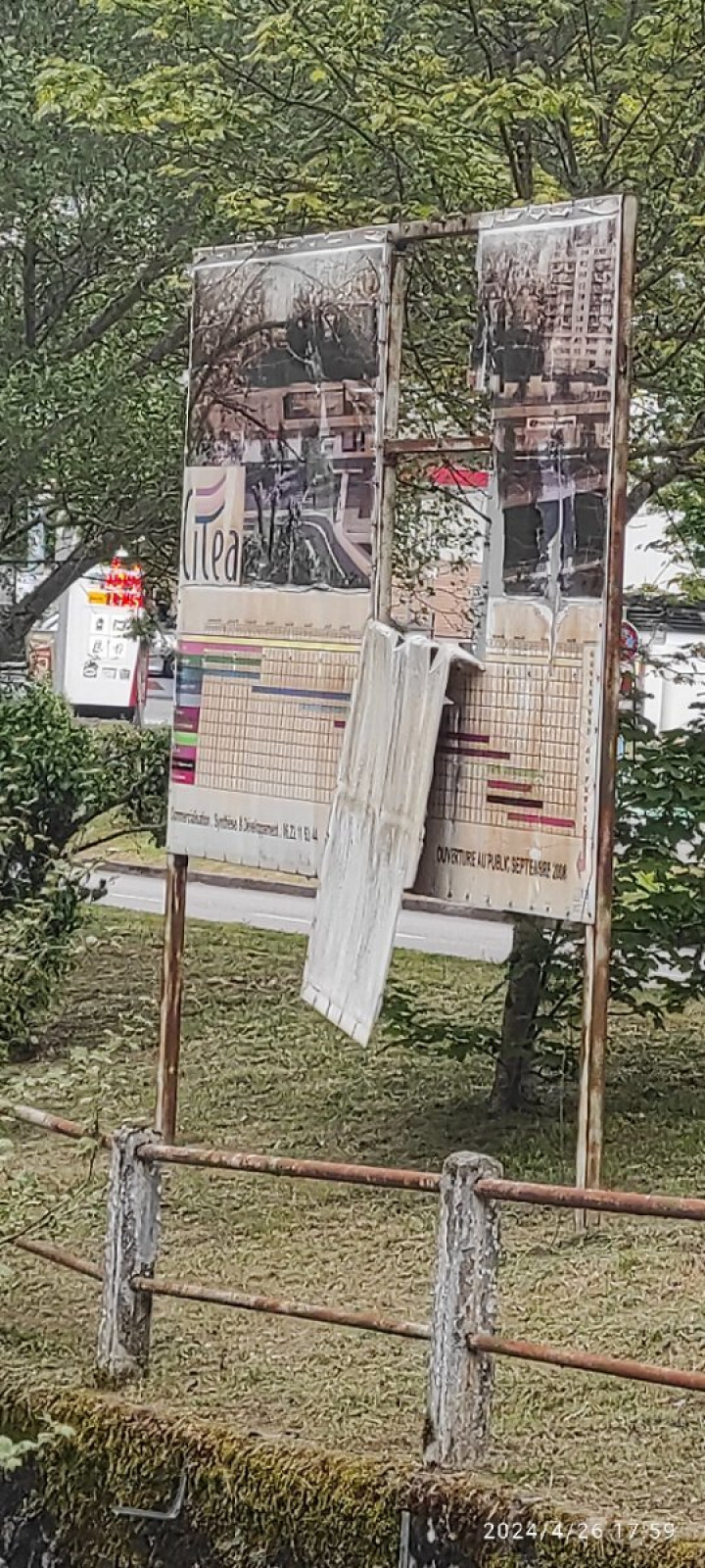 panneau publicitaire dégradé à proximité de la rivière Corrèze et dans la zone commerciale.