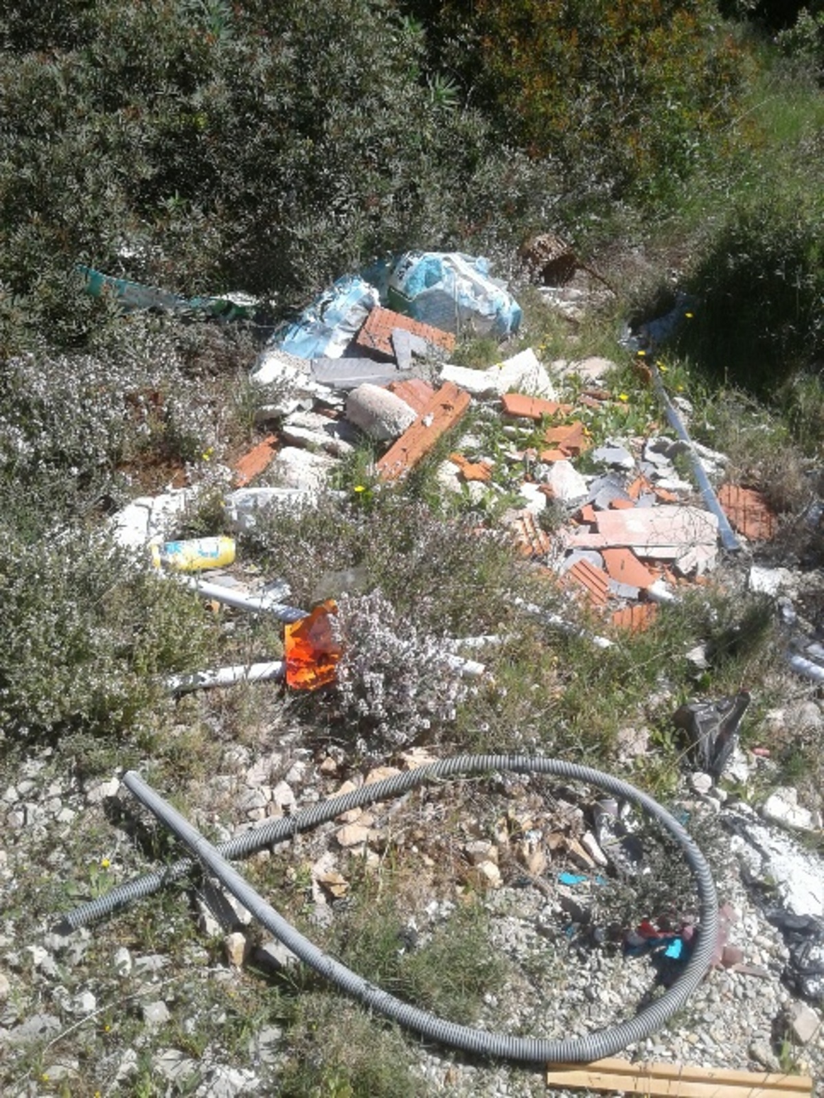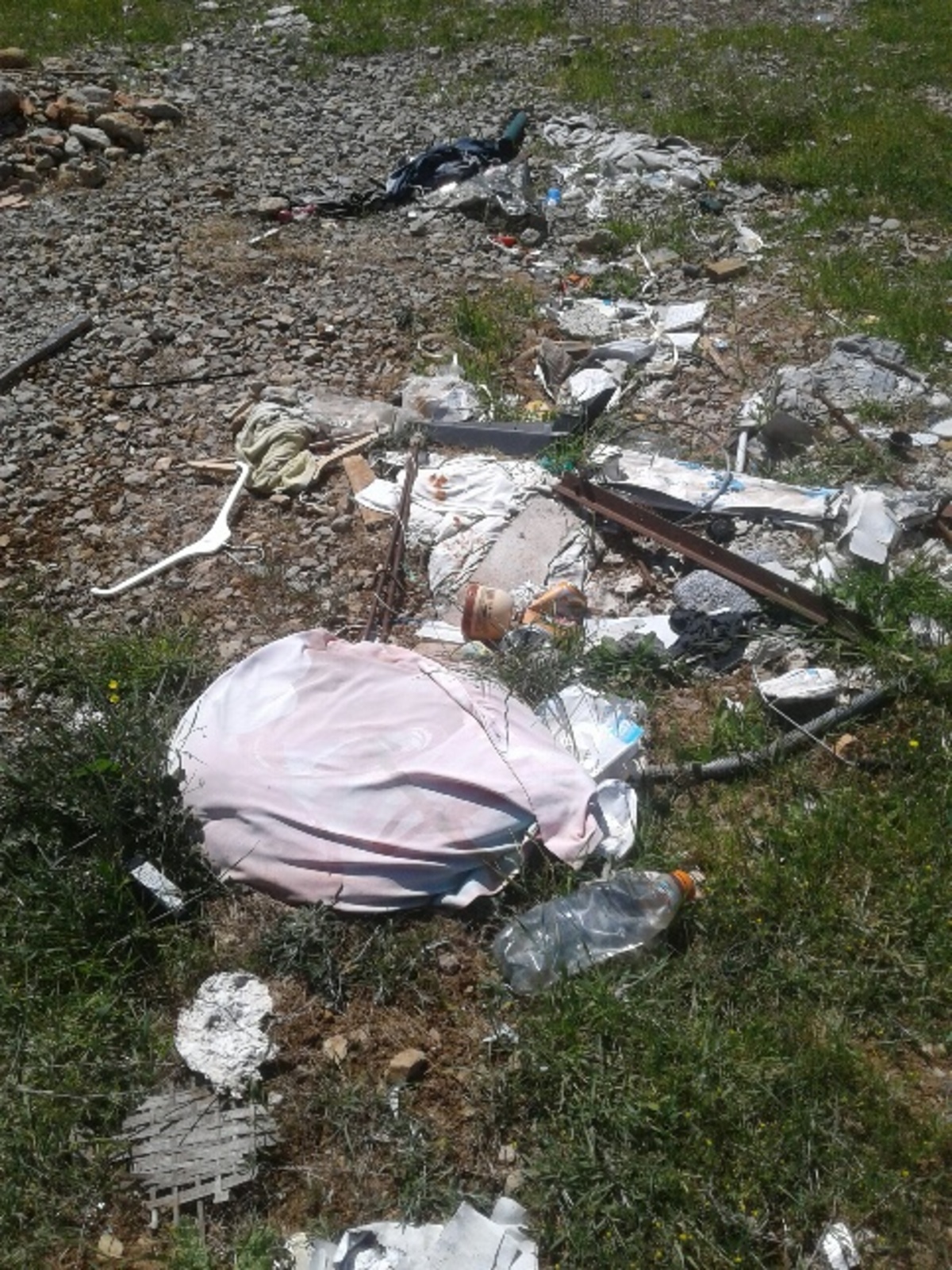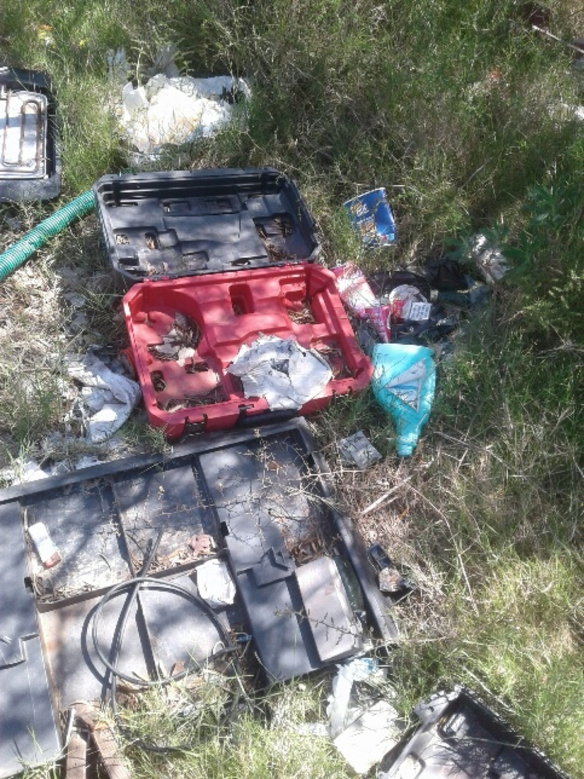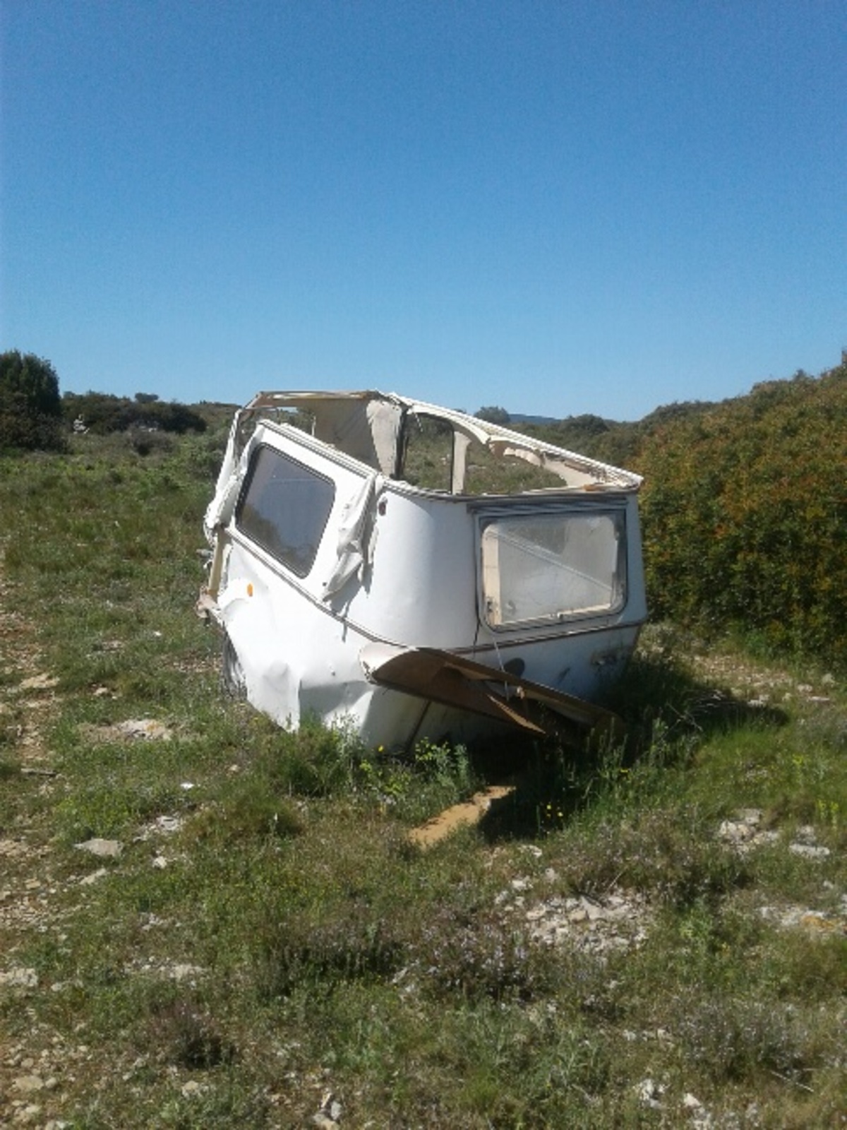 Dépôt sauvage de reste de véhicule, de débris de plastique et de gravas en zone naturelle.