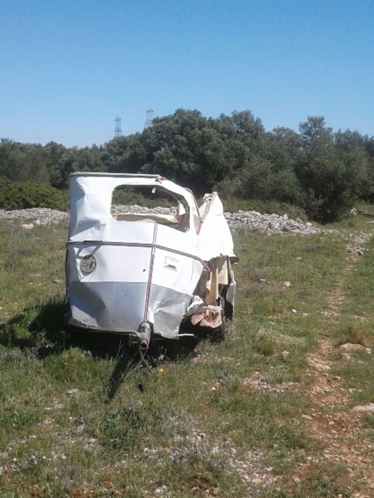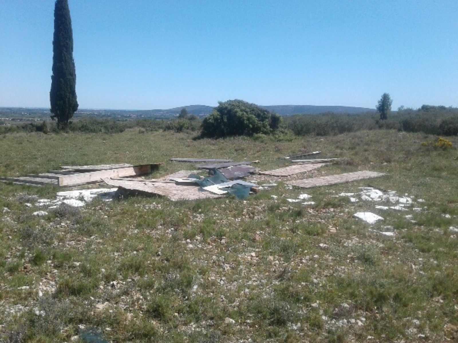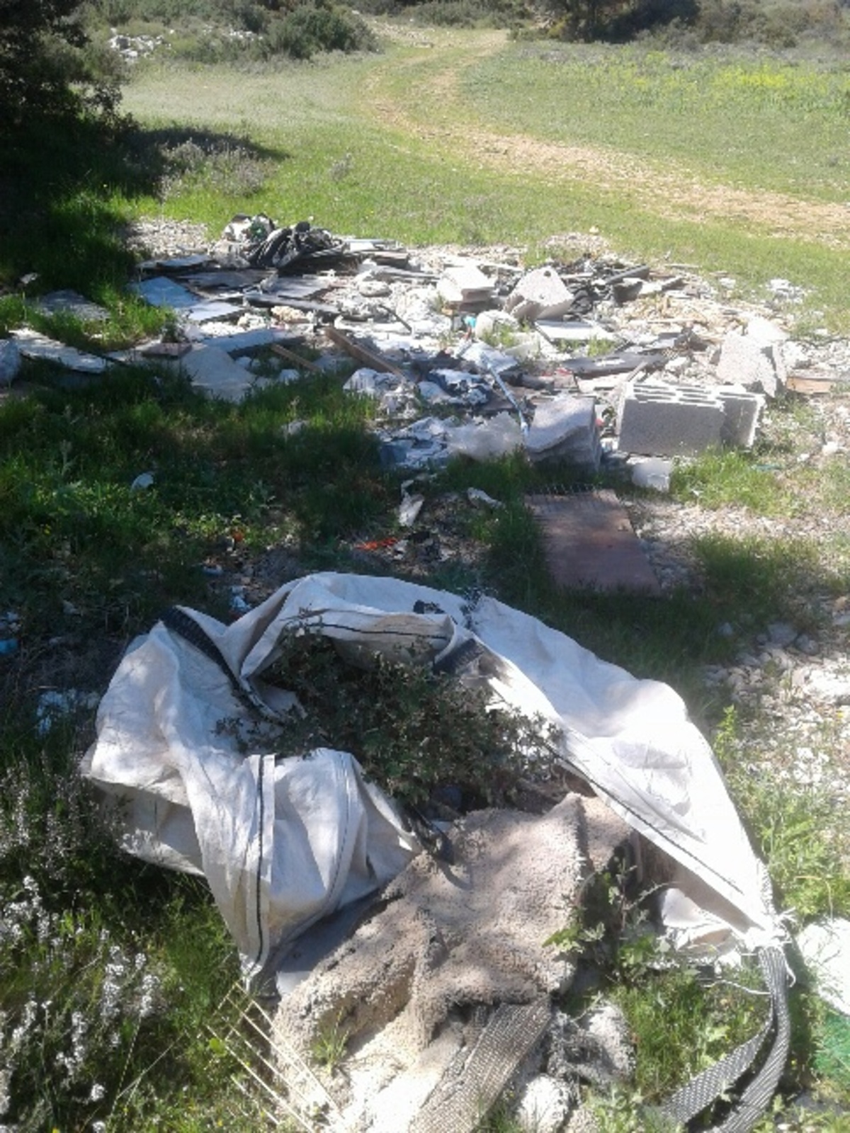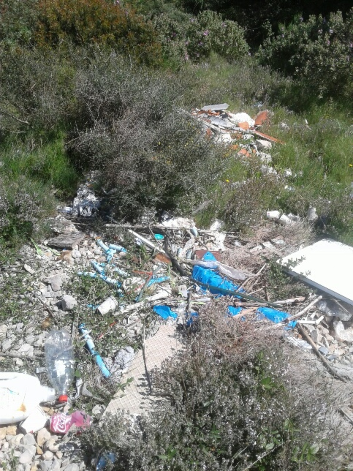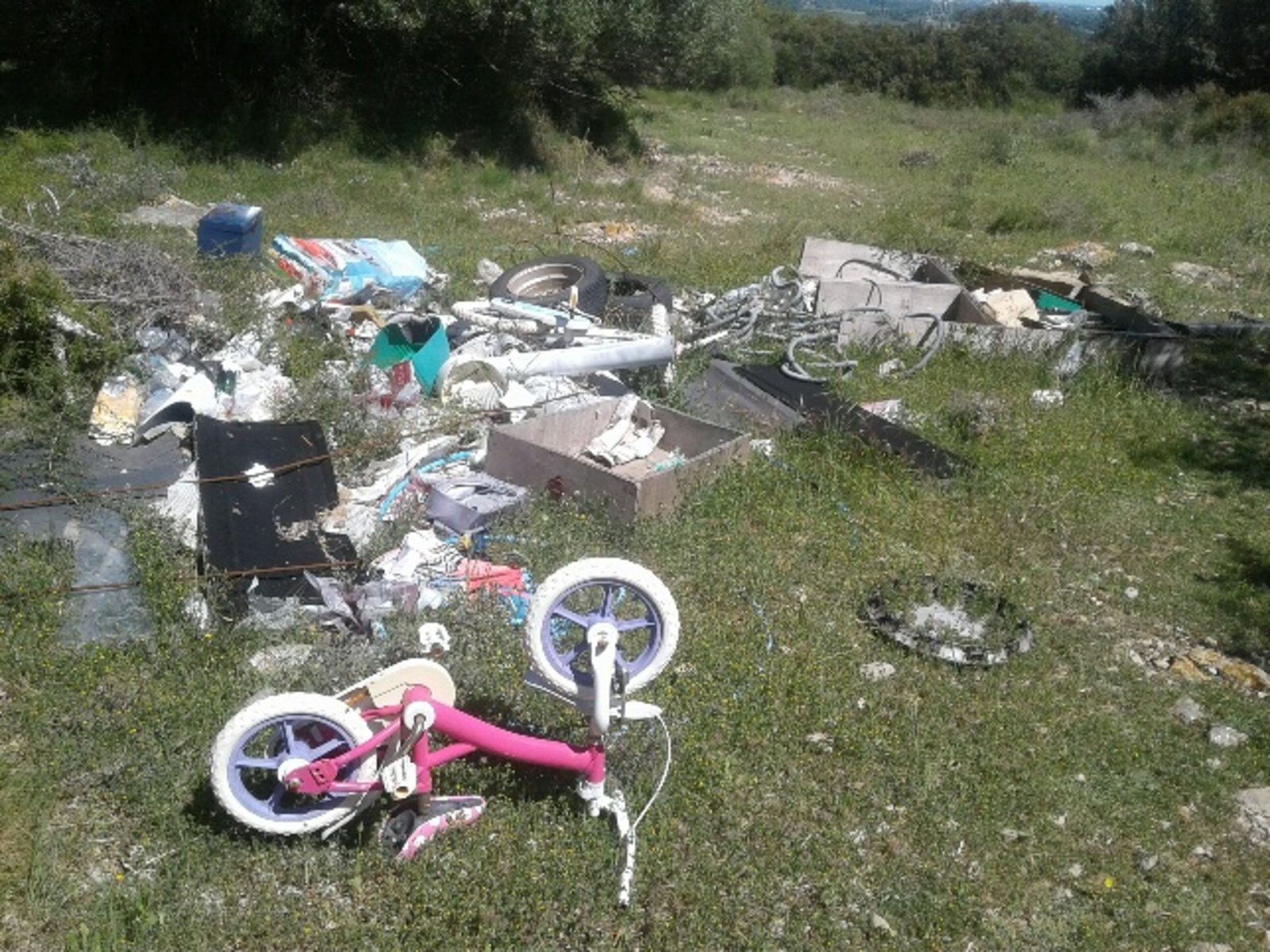 Dépôt sauvage de reste de véhicule, de débris de plastique et de gravas en zone naturelle.