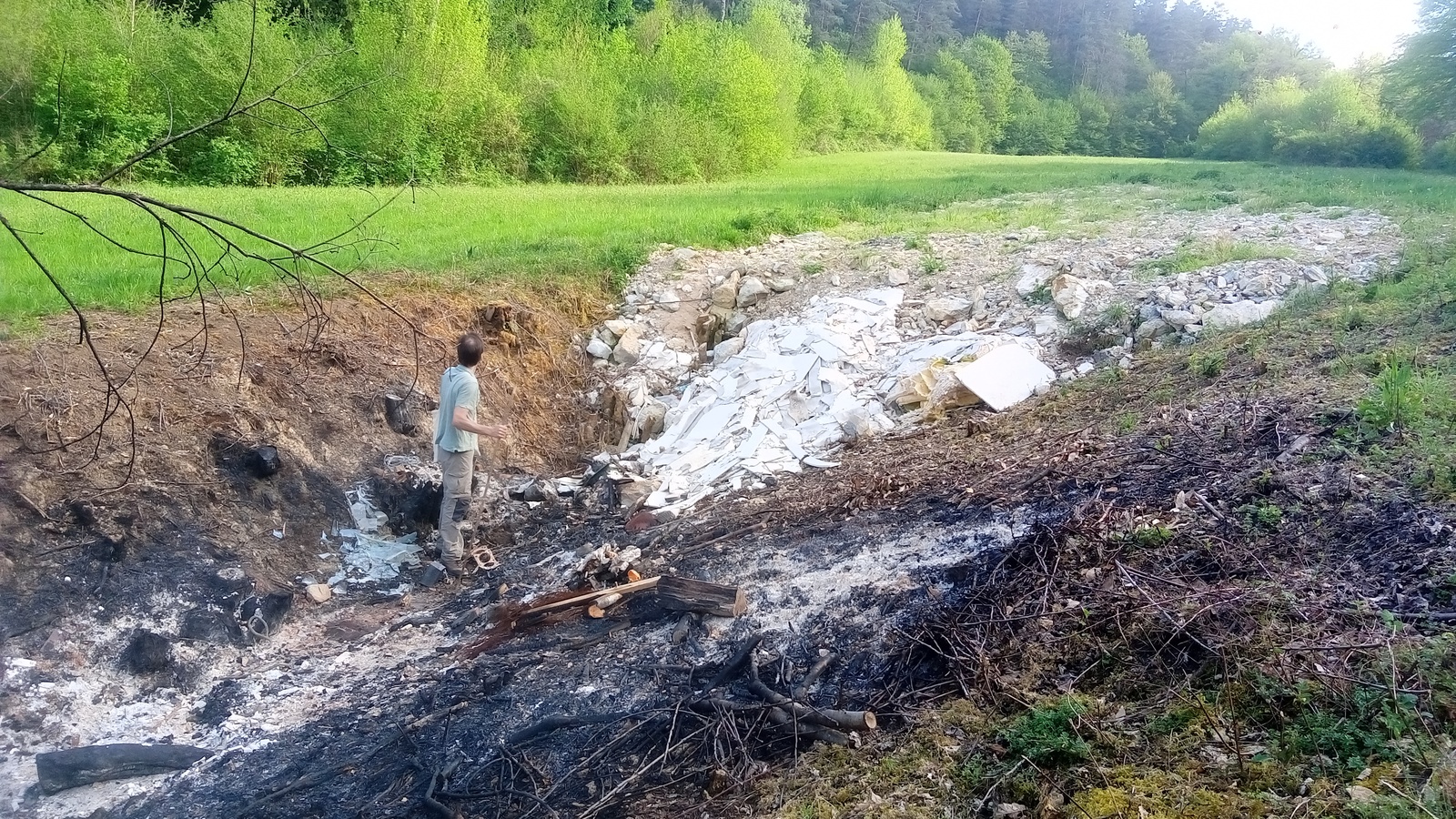 Entre les blocs de pierre et ce qui reste du bosquet, plusieurs m3 de déchets de chantier (principalement) ont été déversés : placoplâtre, laine de verre, pots de peinture, câbles électriques, verre, métal. Une partie de ces déchets et de la végétation ont été incendiés.