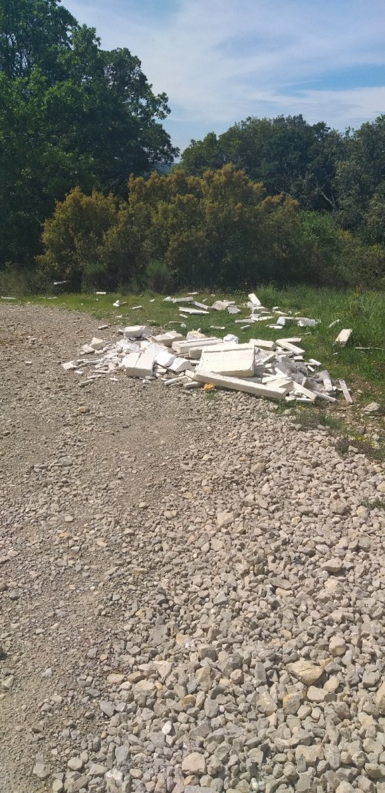 Dépôt sauvage de déchets en zone naturelle et au bord d'une route. Dépôt de polystyrène expansé (matière plastique utilisé pour emballage).