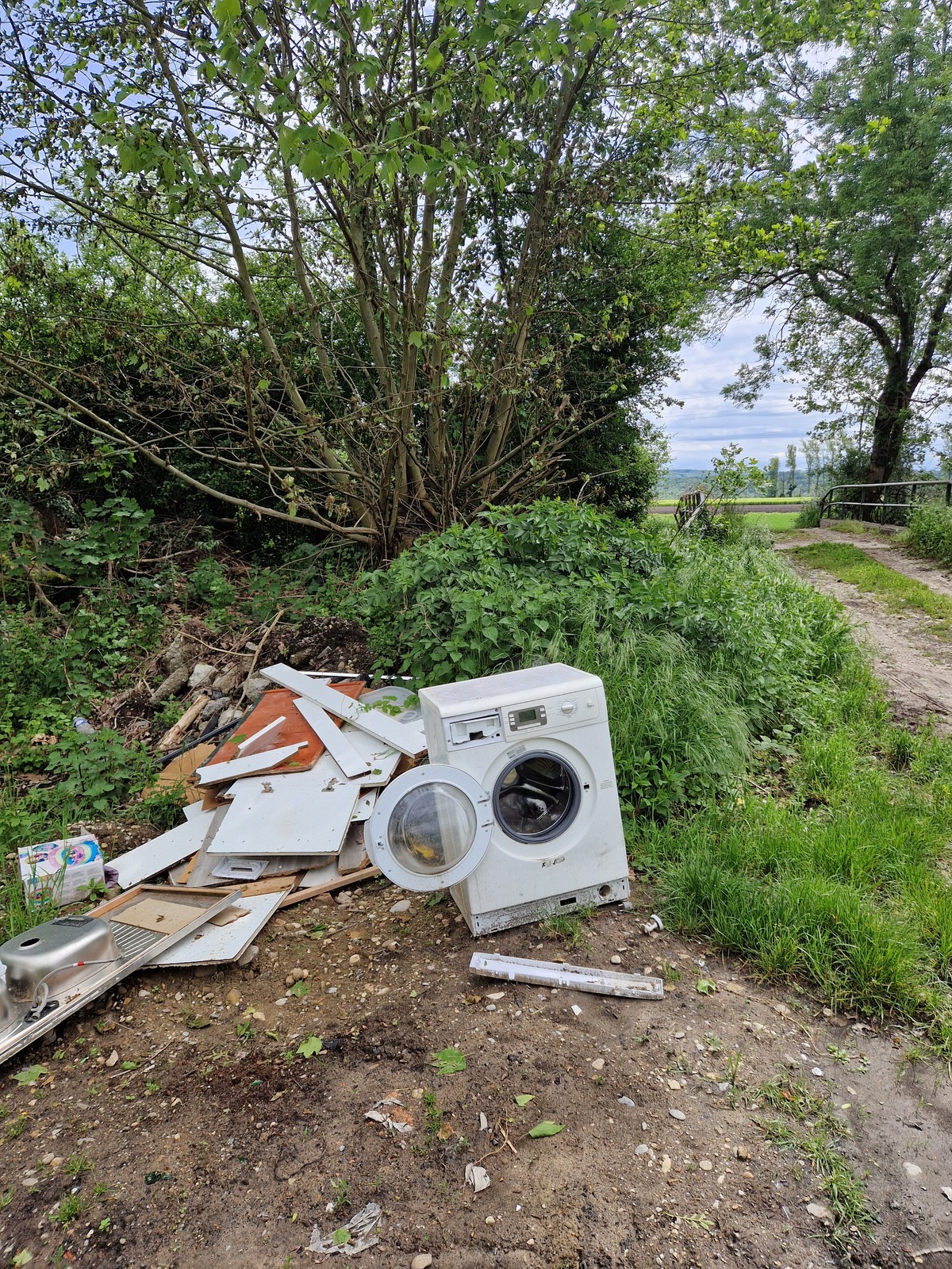 Déchets variés + lave-linge, bien cachés derrière le pont alors que la déchetterie est à 200m.
