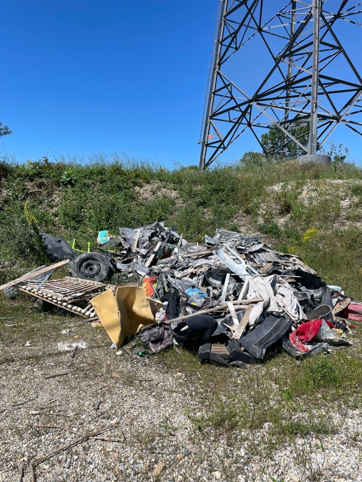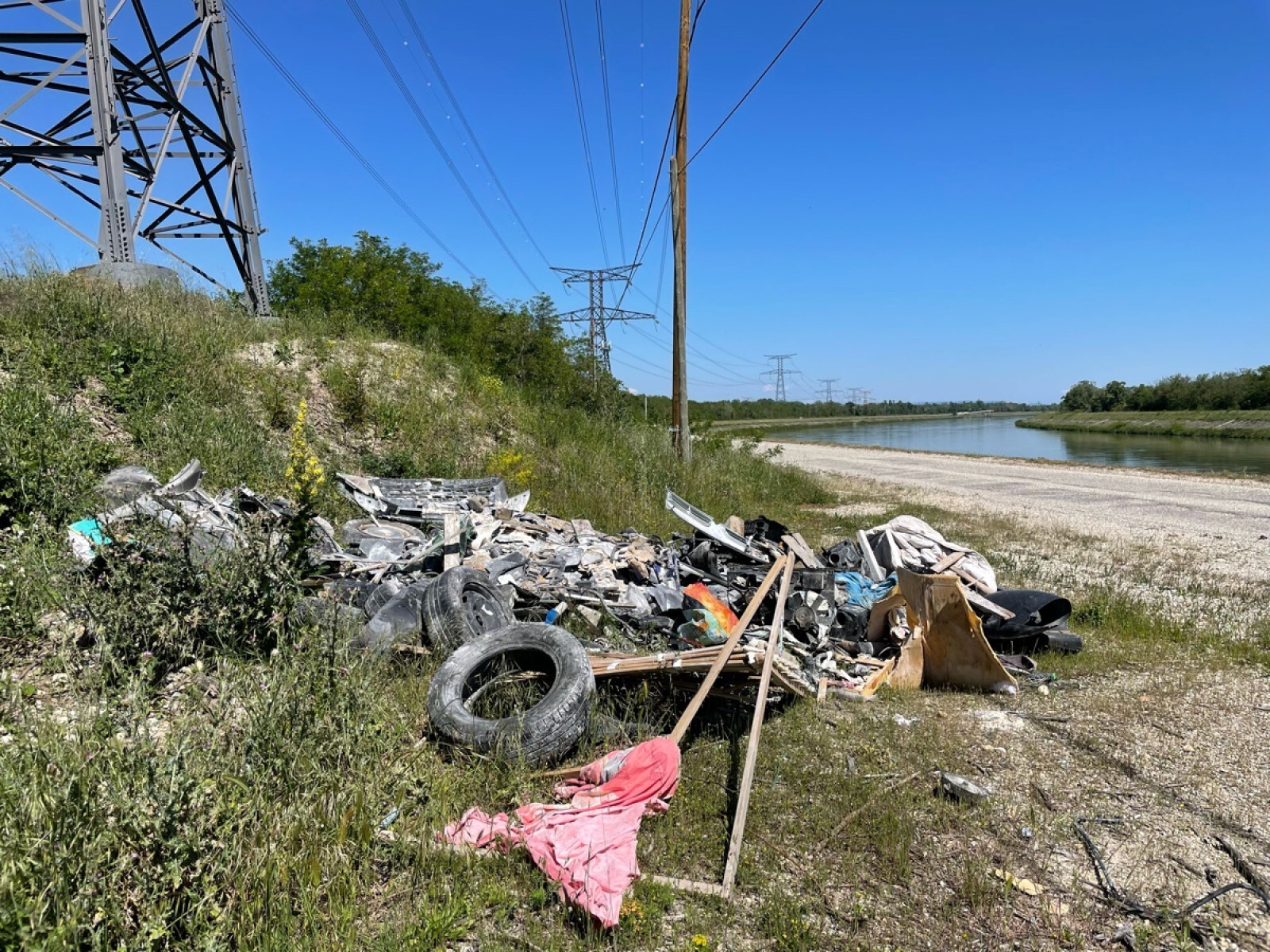 Dépôt de déchets le long du canal Donzère à Mondragon (restes de voiture, pneus ...).