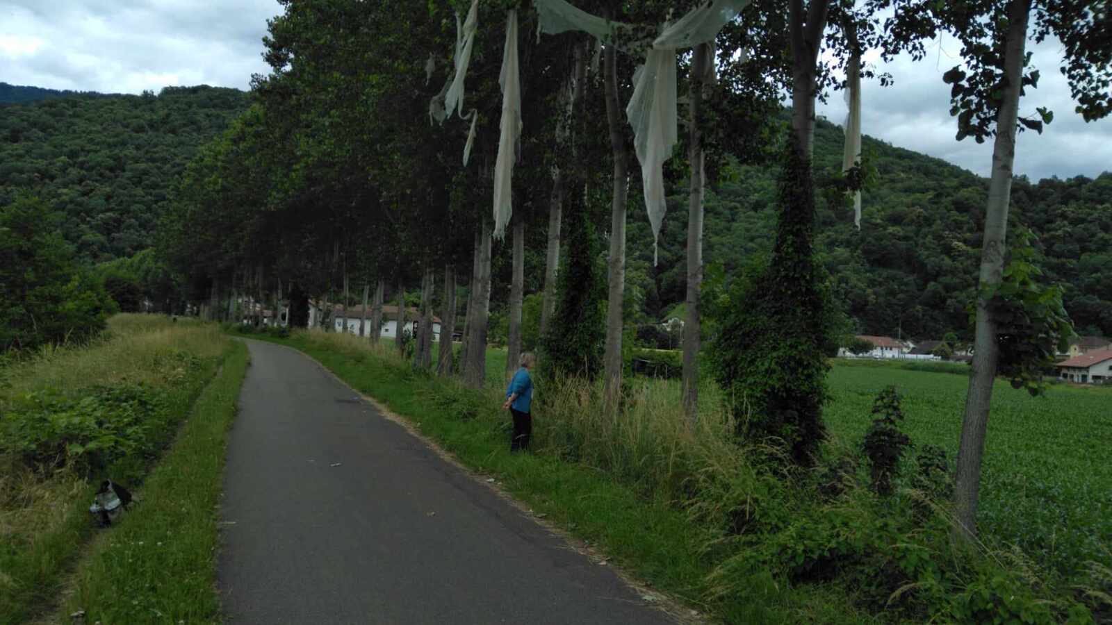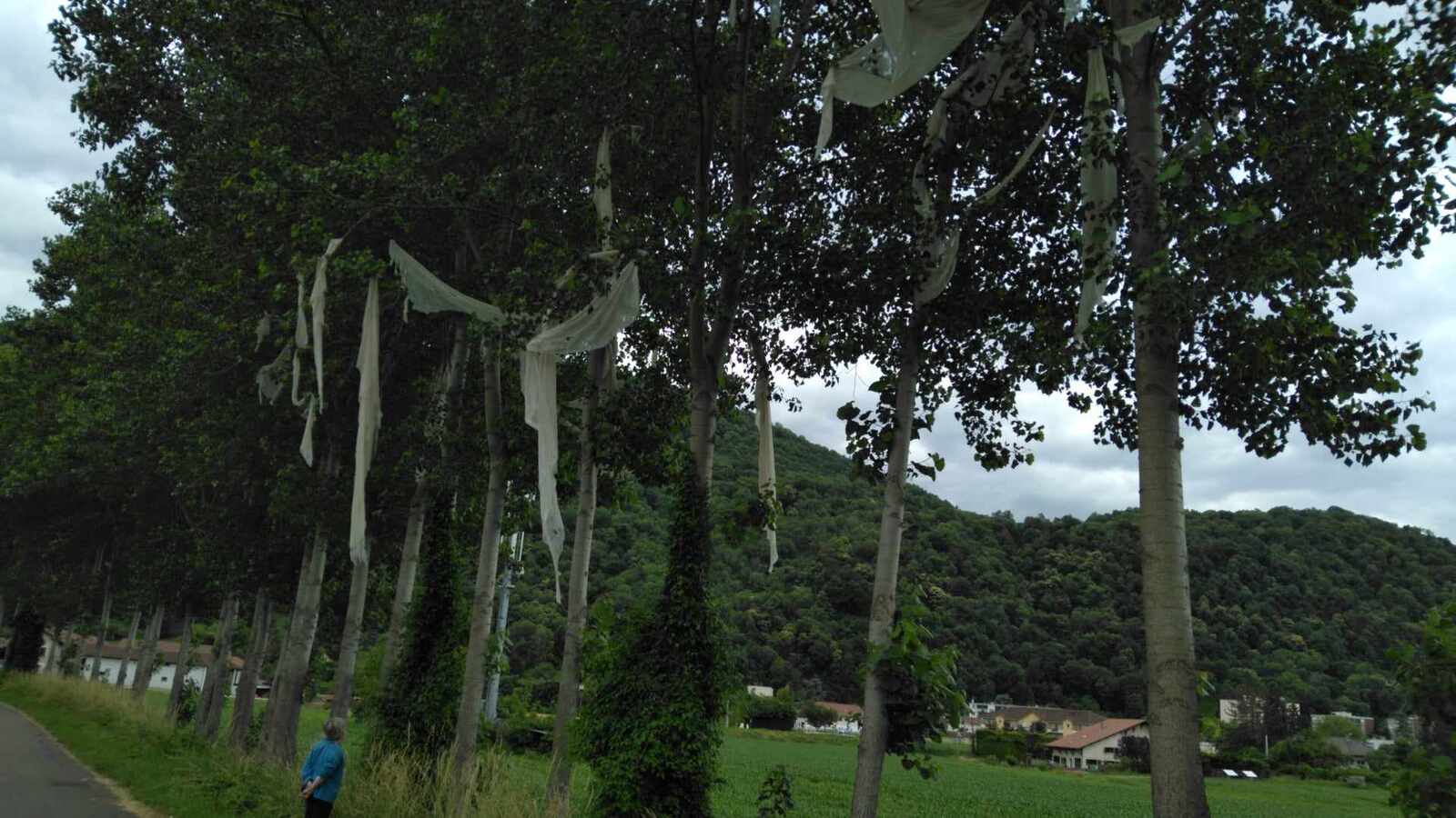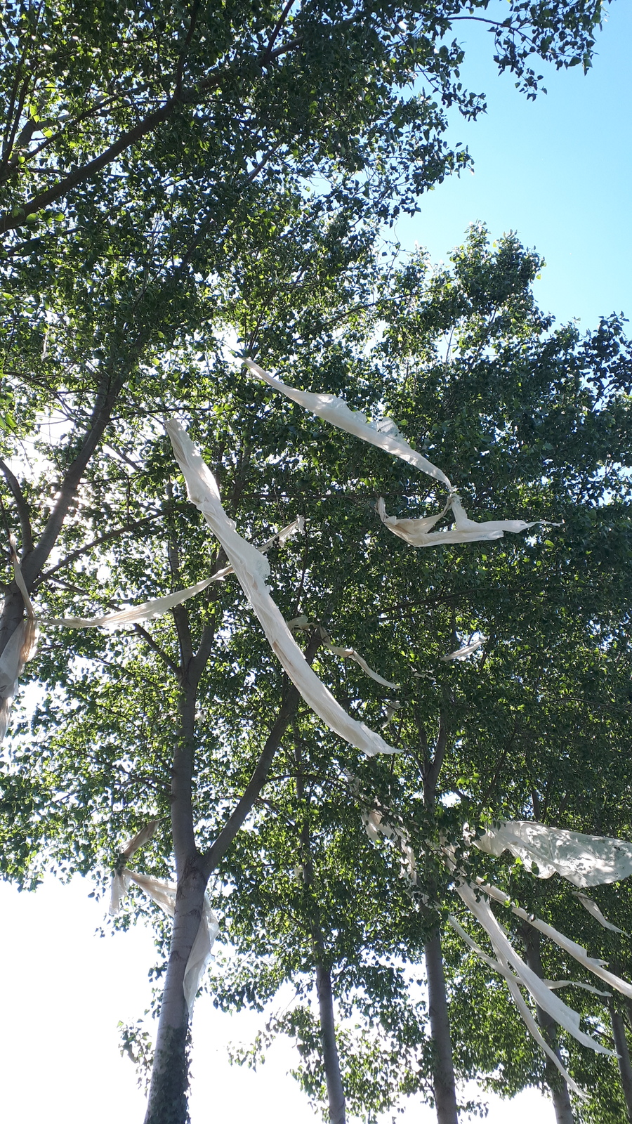 Vu le mercredi 12 Juin, des éléments déchirés de toile non tissée type bidim sont encore présents en grand nombre dans les peupliers (8 arbres).