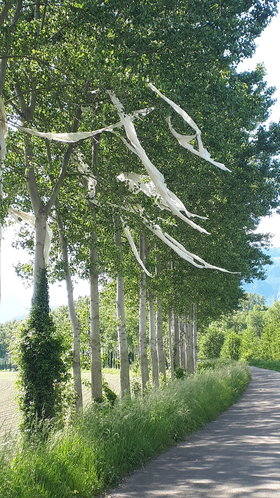 De longs rubans de plastiques accrochés dans les arbres le long de la ligue le long de l'Isère rive gauche