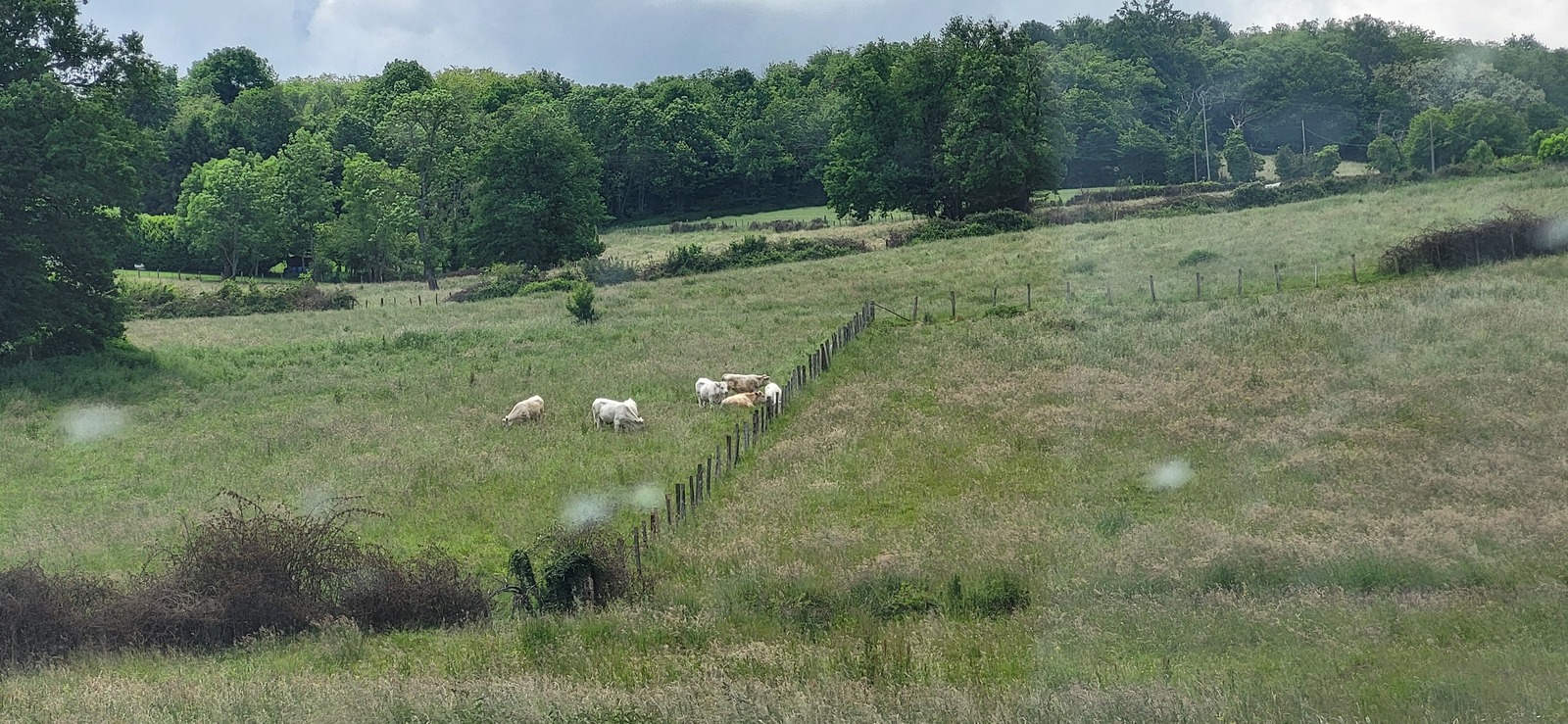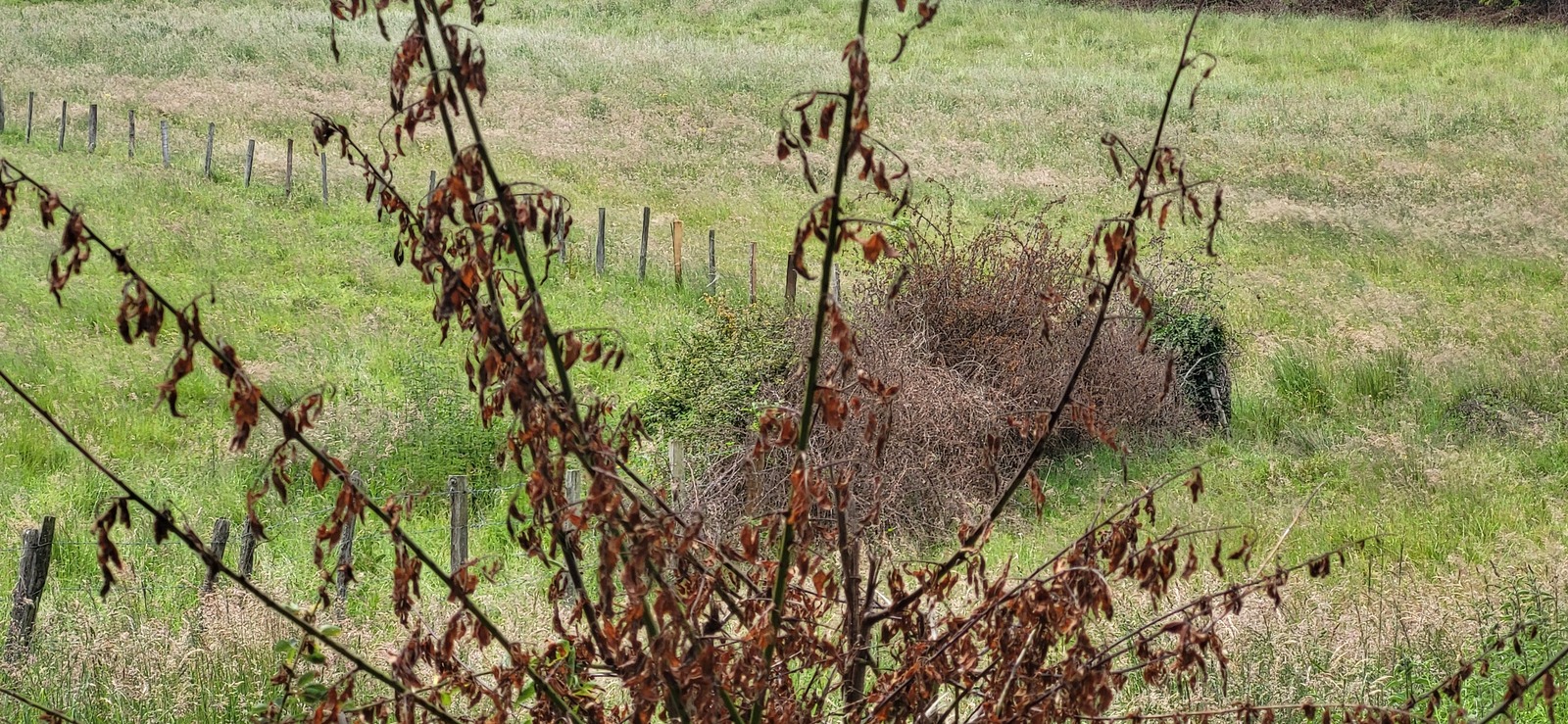 Destructions de lots isolés de haies ( types pruneliers ) par des produits type débroussaillants sur des parcelles pâturées en présence d'animaux, avec en contrebas un petit canal déversoir d'étang en amont.