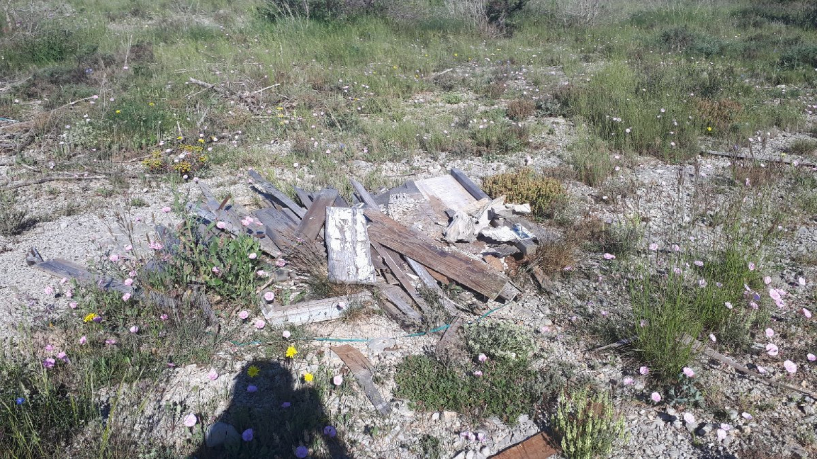 Dépôt sauvage de déchets en zone naturelle (gravas, morceaux de bois).