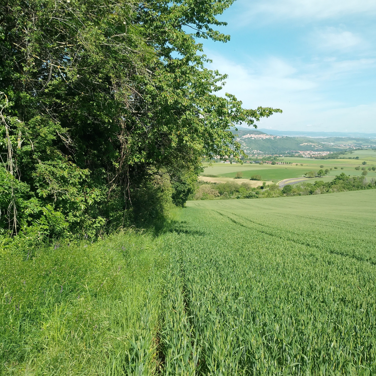 Très belle haie longue d'une centaine de m, large et avec de nombreux gros arbres, sur talus de pierre par endroits, du bois mort, une faune aviaire importante, séparant une prairie et un champ cultivé, mais majoritairement dans le sens de la pente.