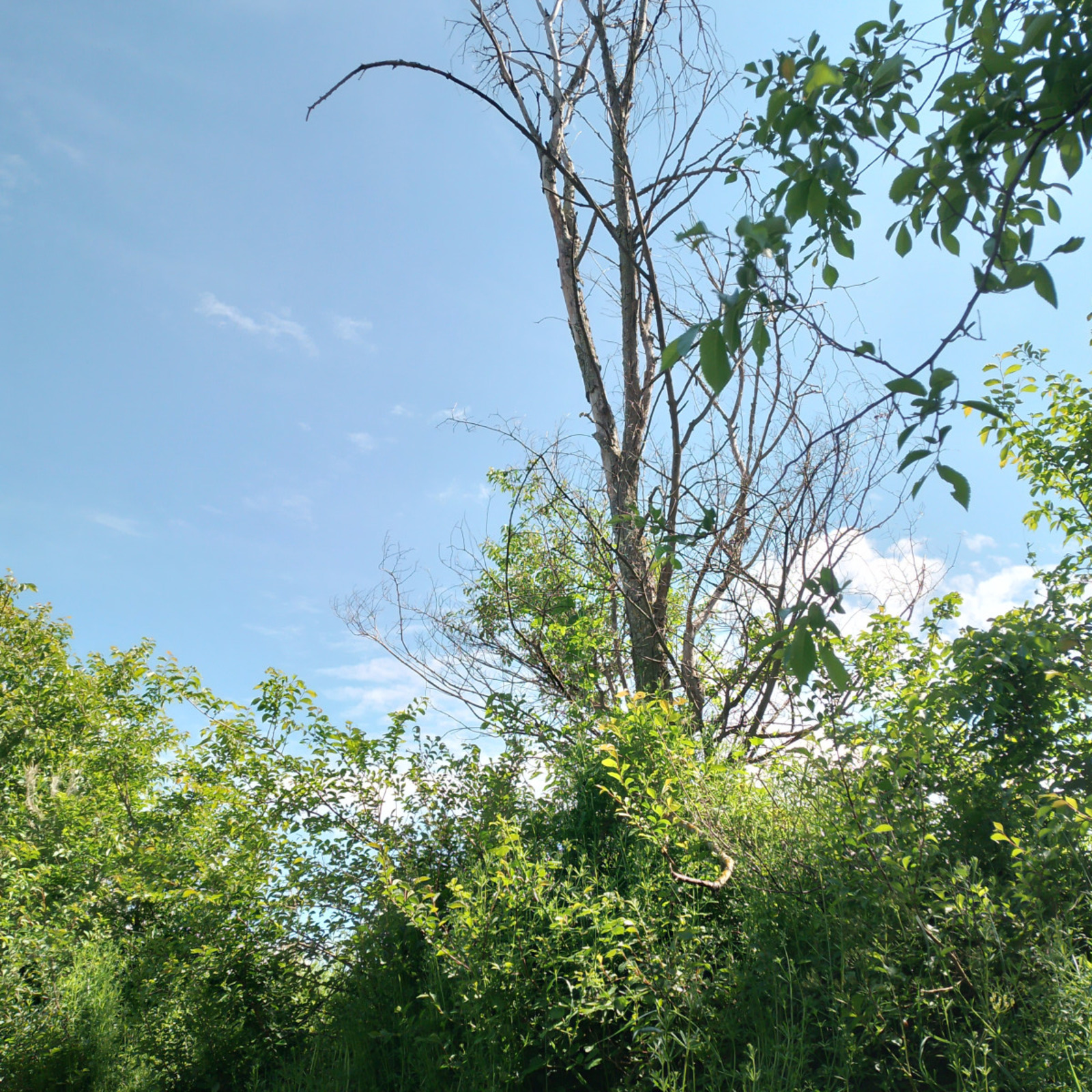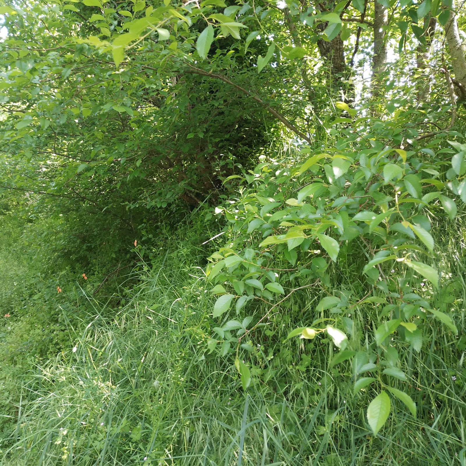 Haie de plus de 100 m plutôt large, perpendiculaire à la pente, en bordure de chemin, avec beaucoup de bois mort lié aux ormes (repousses d'ormeaux) - autres espèces : fusain, prunelier, noyer, neyrum, frêne.