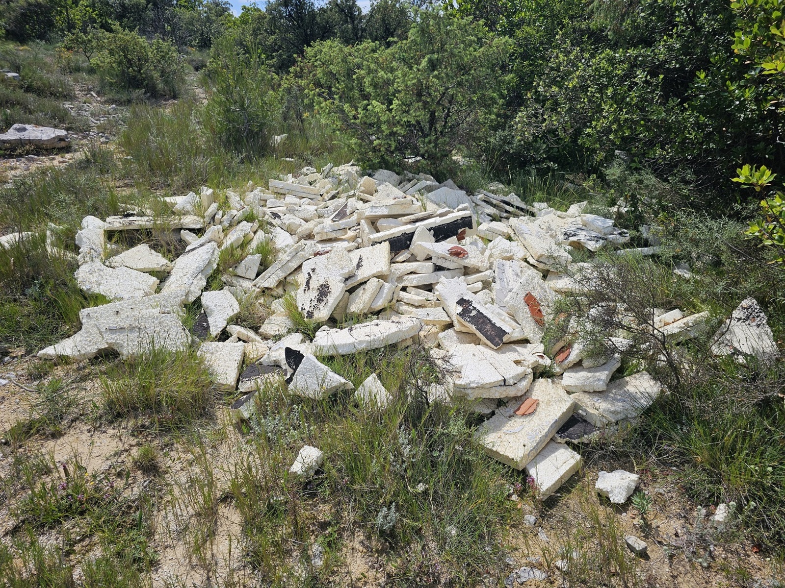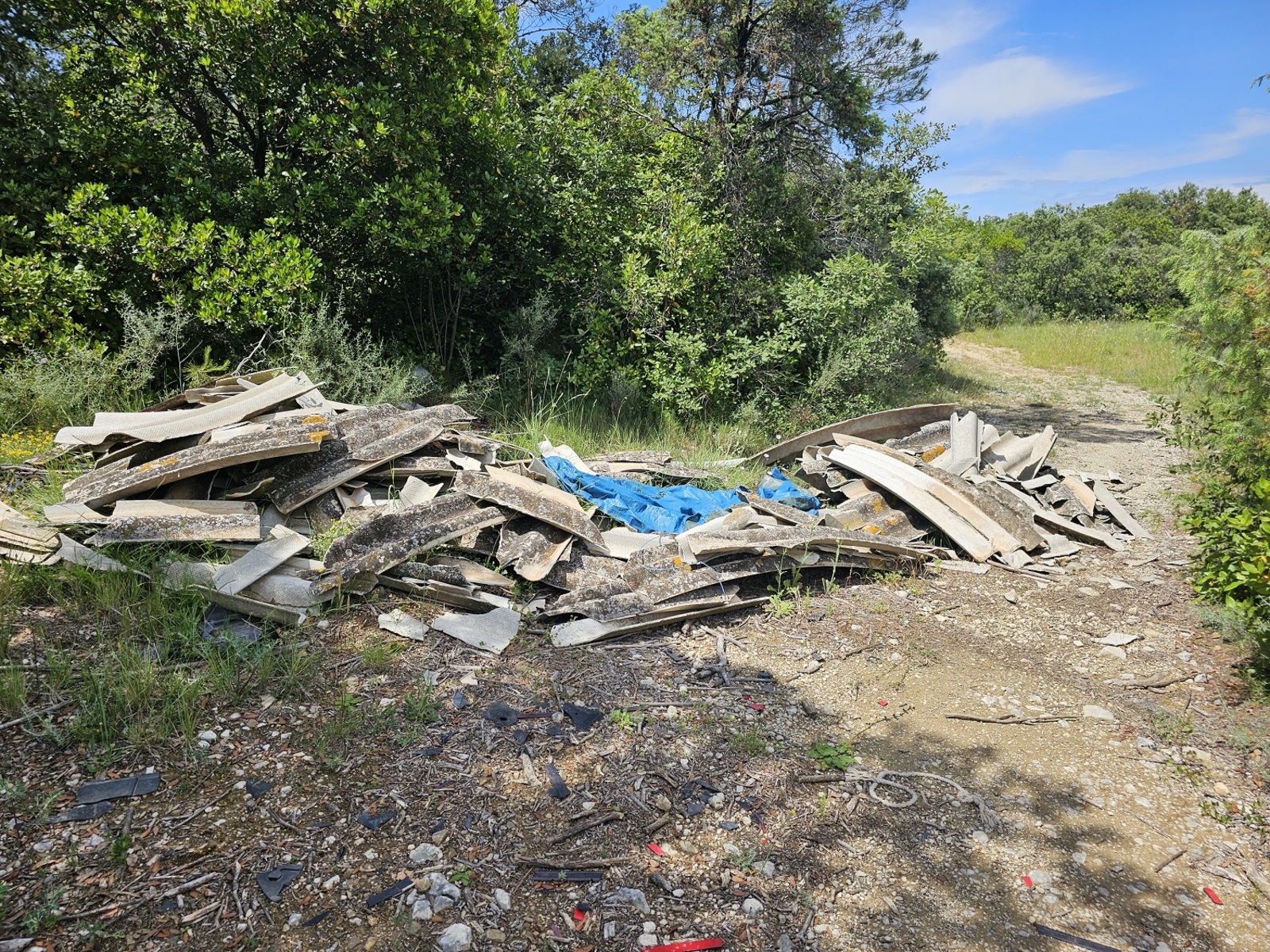 Dépôt sauvage de déchets en zone naturelle ( pneus, tuilles en fibrociment, matelas, textiles indéfinissables etc).