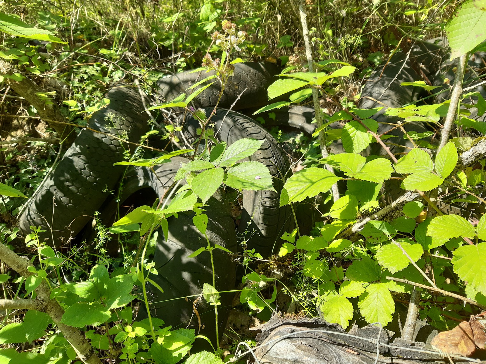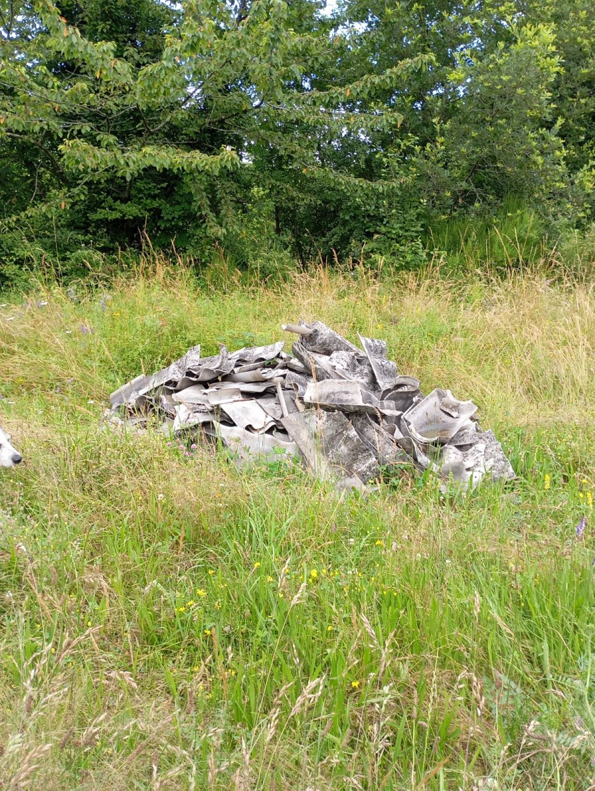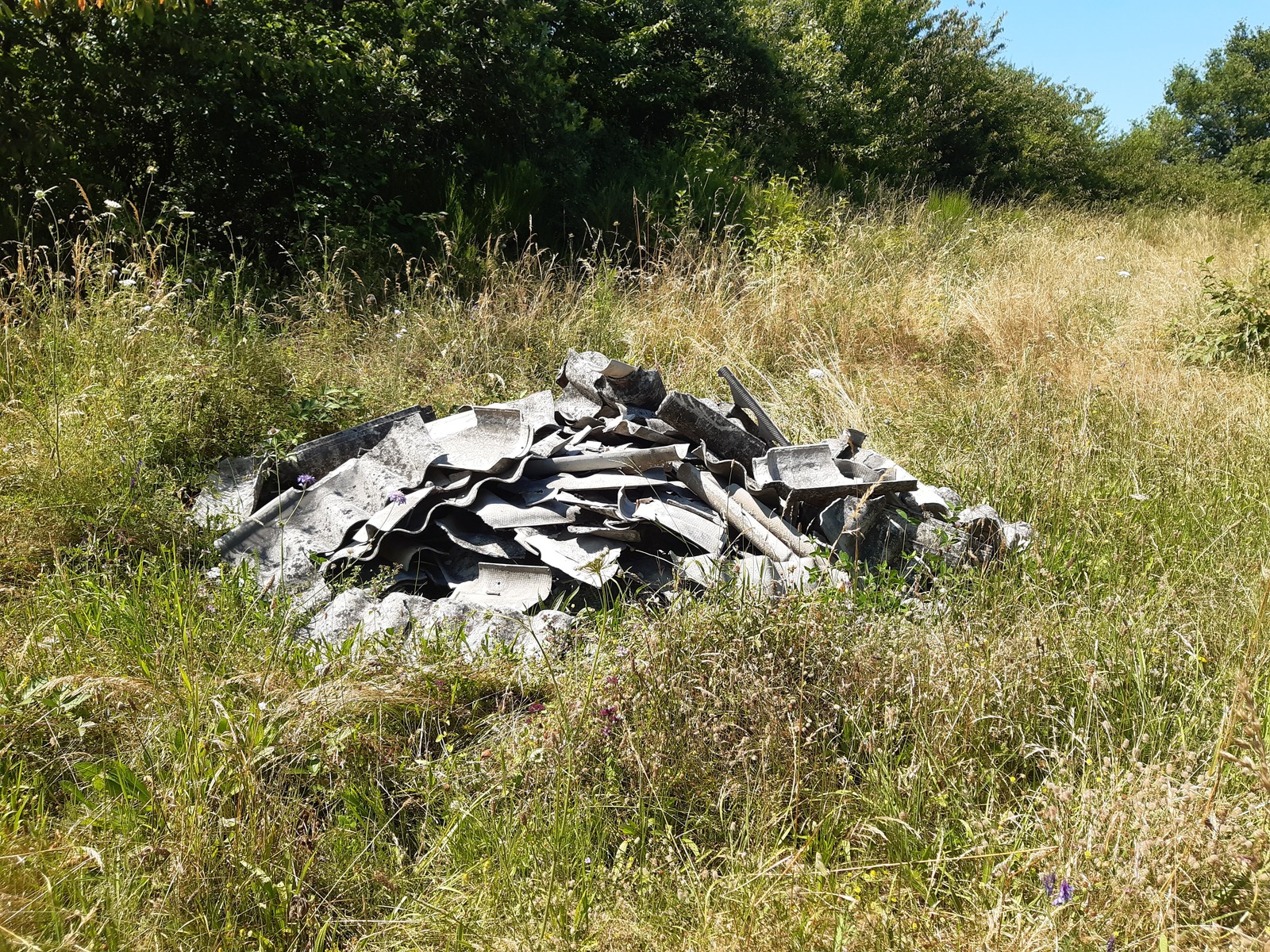 Dépôt sauvage de matériaux de construction (dont tuiles) dans une zone naturelle, au bord d'un chemin public.