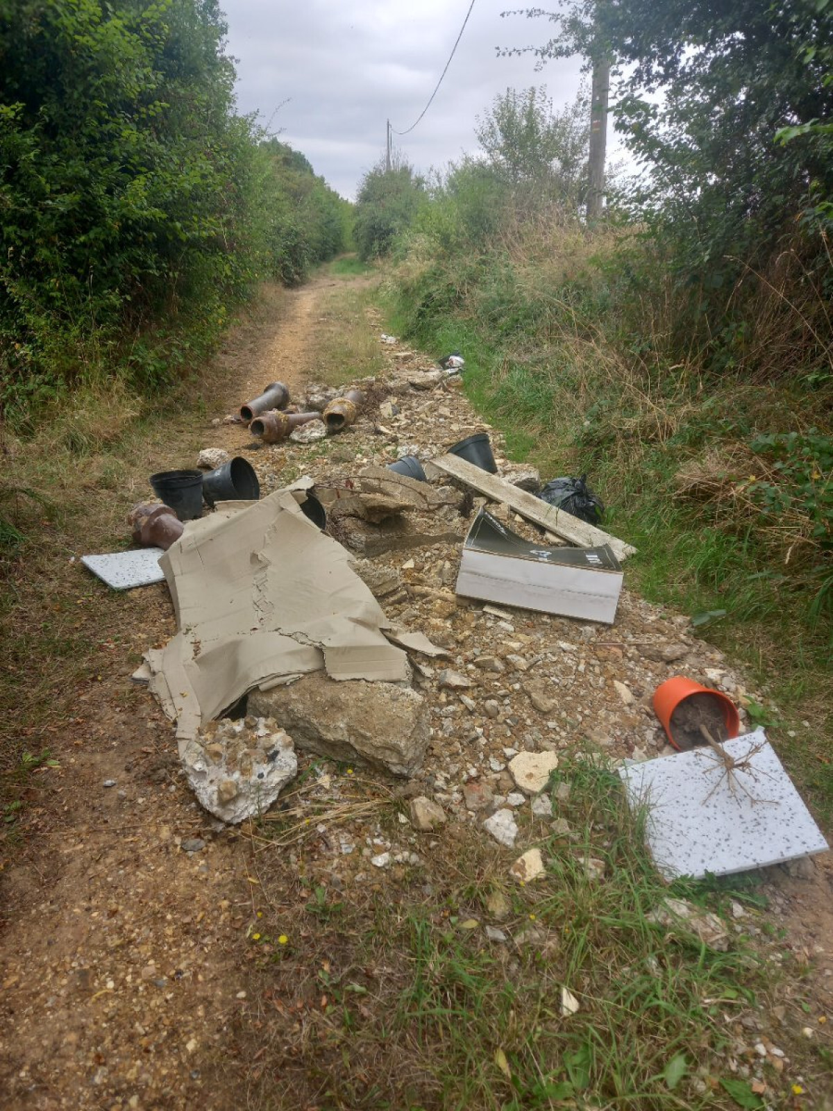 Dépôts de déchets du bâtiment sur un chemin du GR22 bordant une parcelle agricole. Il s'agit de gravats, de tuyaux en ciment, de seaux, de plastiques, etc.