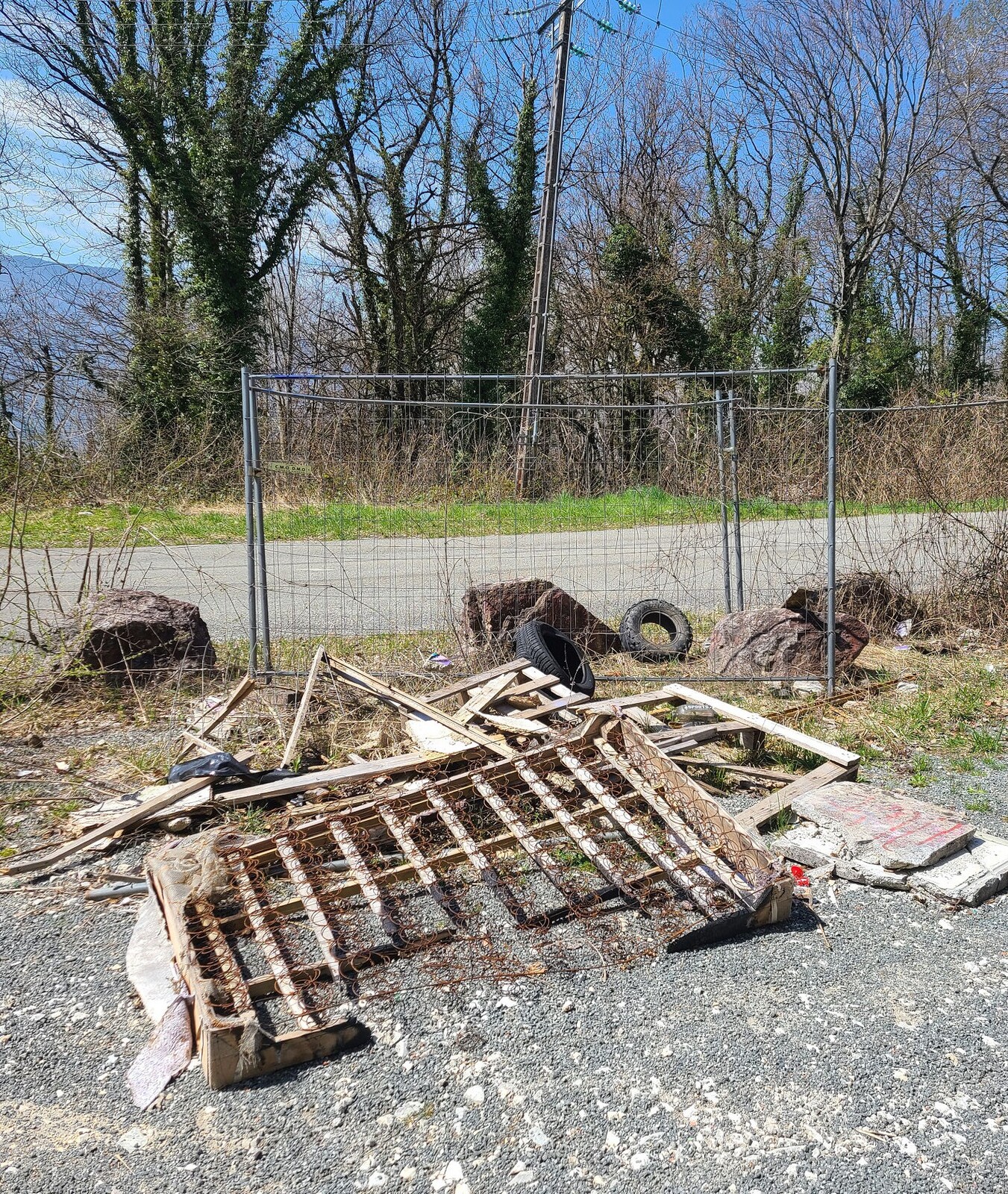 Dépôt de chantier (plastiques, tuyaux, palettes, gravats...) au niveau de l'ancienne gare du téléphérique, à Mouxy.