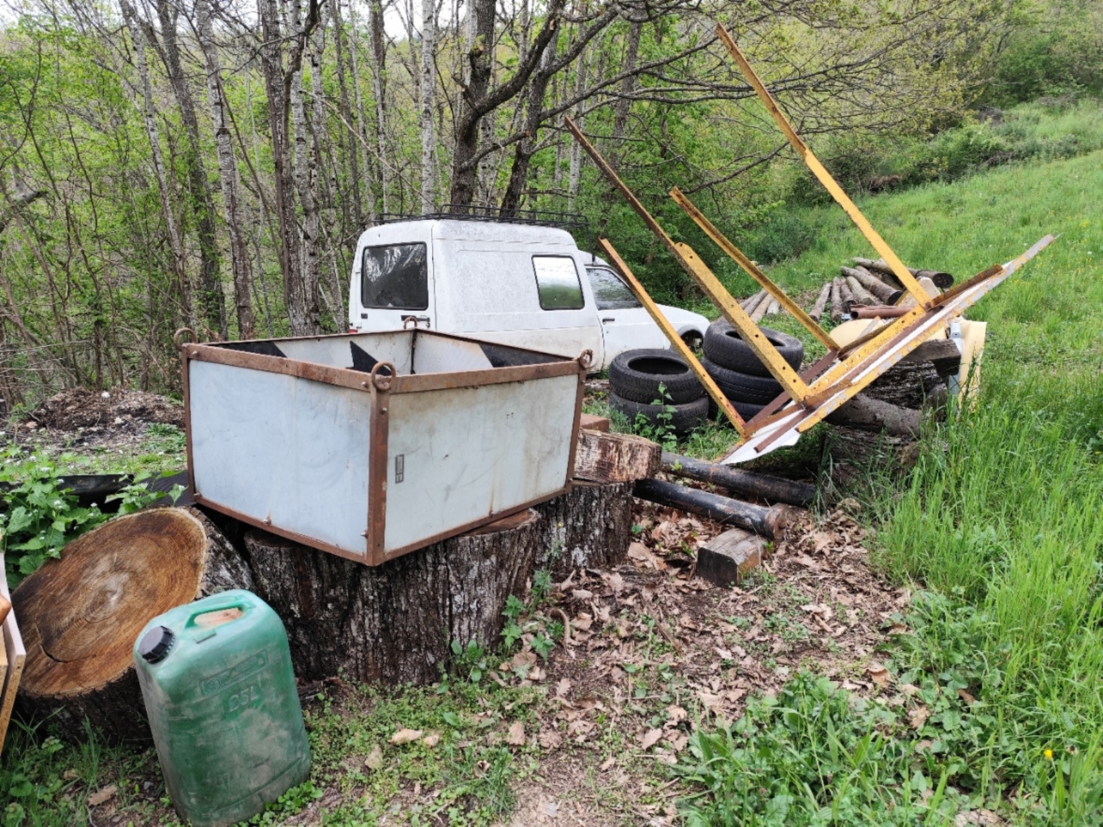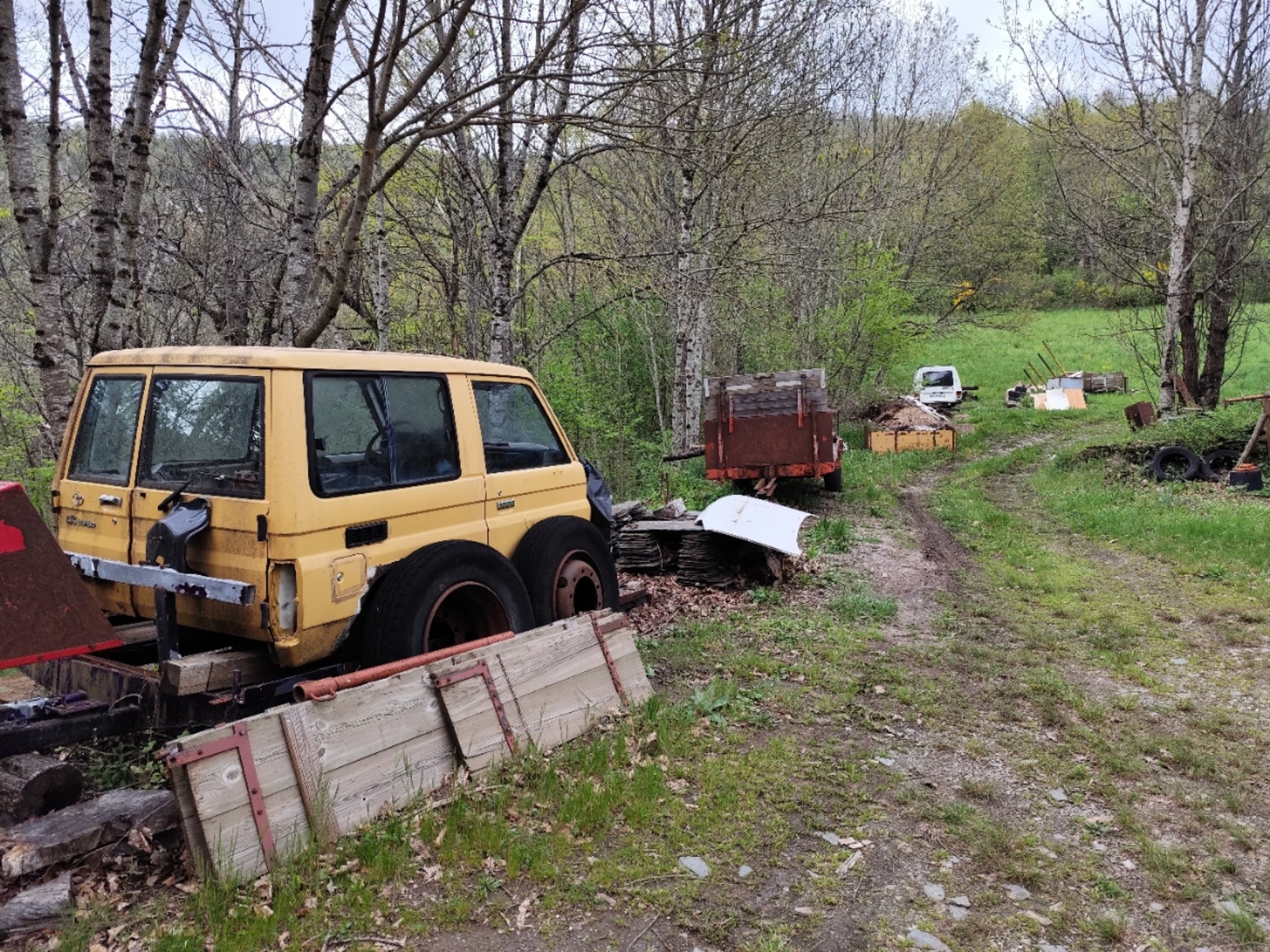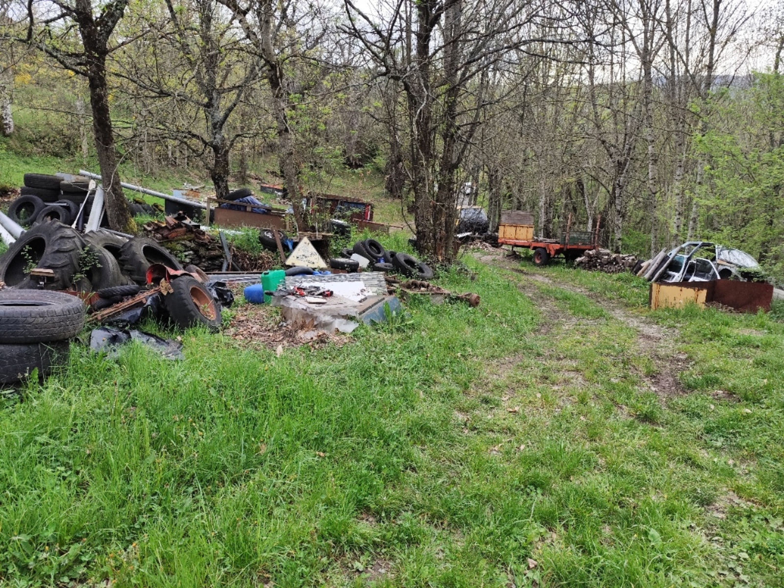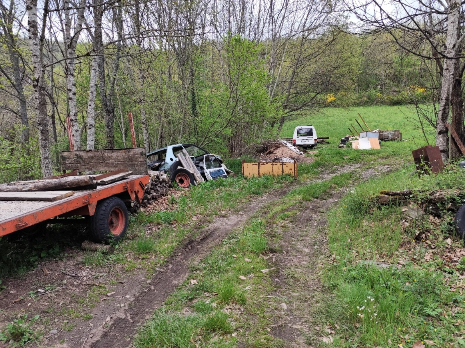 Dépôt sauvage et stockage de véhicules hors d'usage ( carcasses de véhicule, remorques, pneus, plastiques et tables, le long d'un sentier).