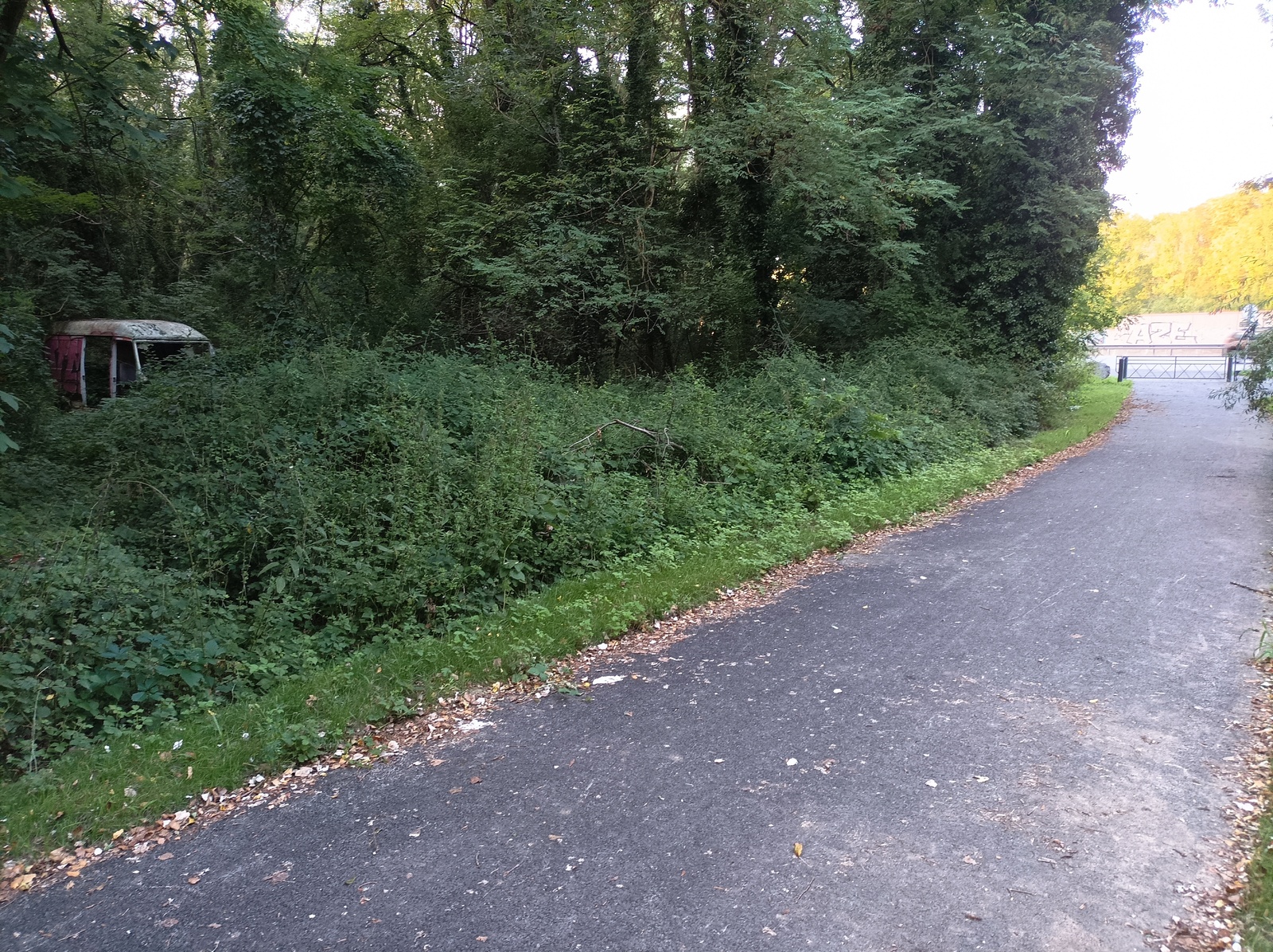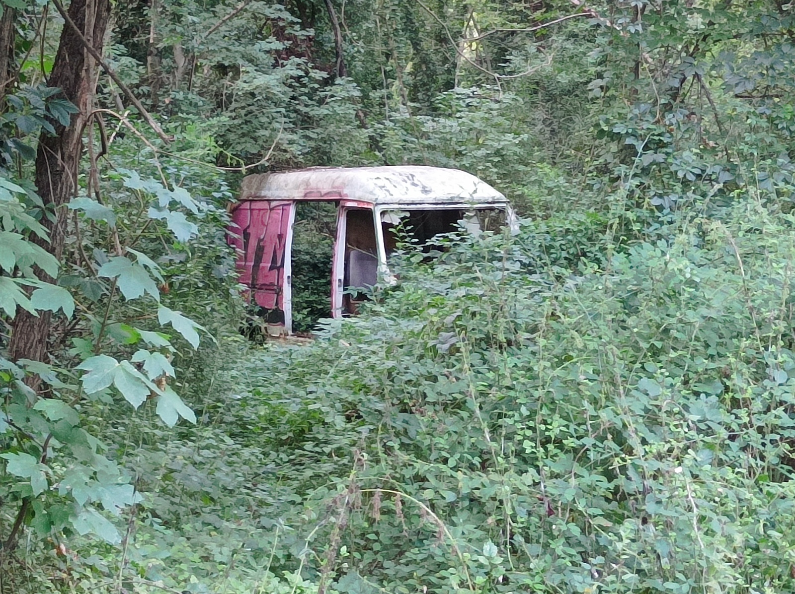 Une camionnette abandonnée depuis apparemment très longtemps vu son état. Terrain plat mais nécessite défrichement pour accès.
