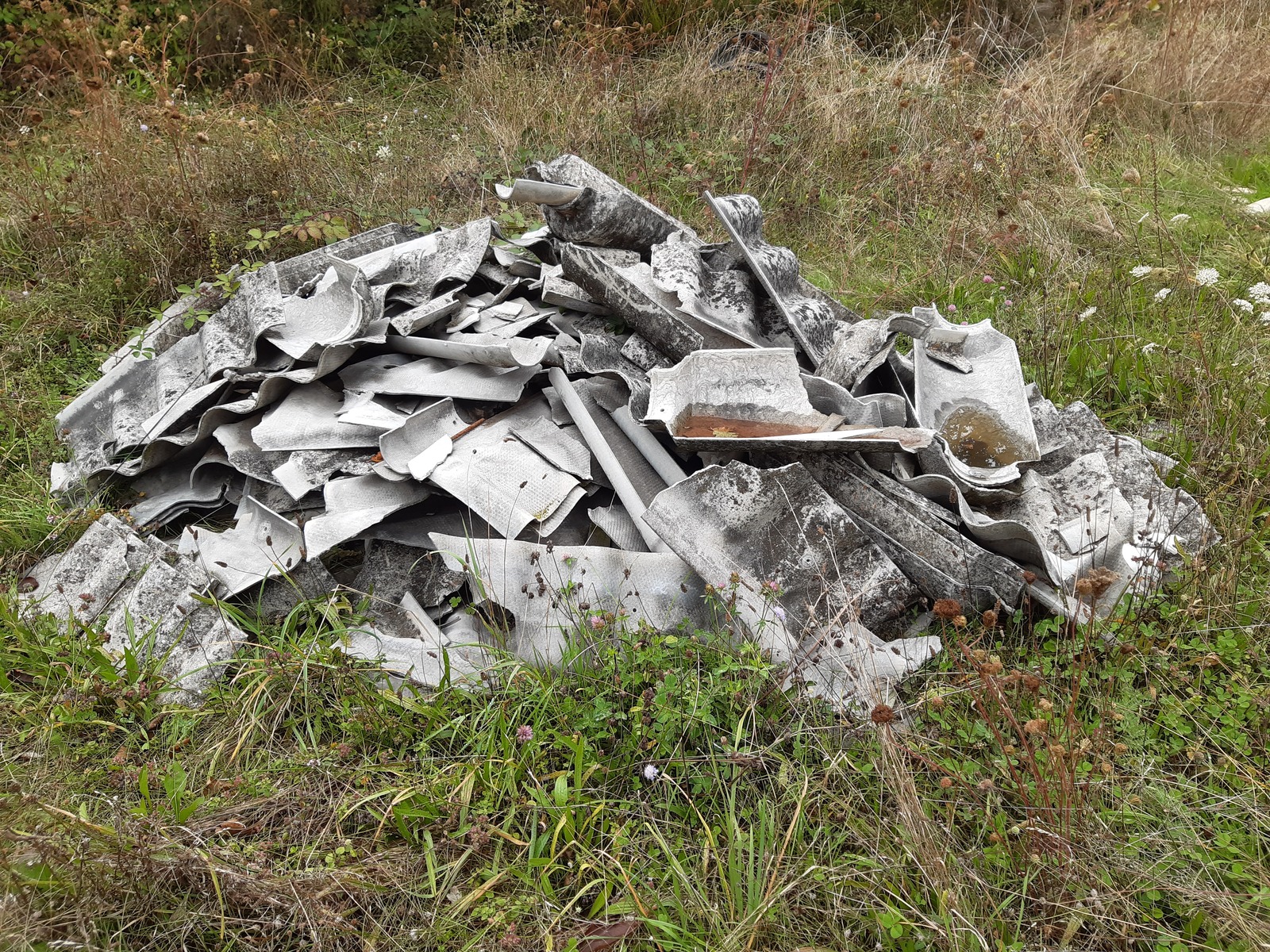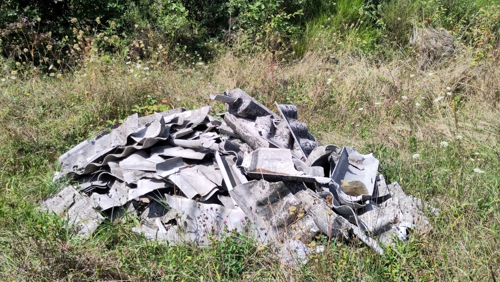 Dépôt de nombreuses plaques en fibro ciment à même le sol. Risque d'amiante.