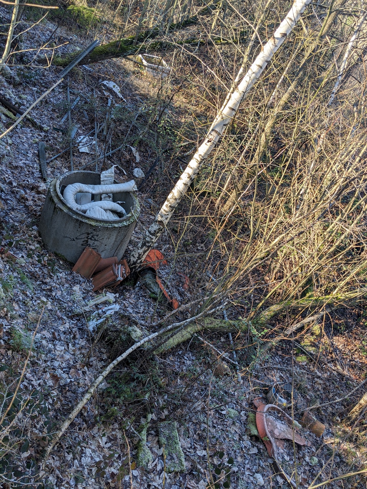 Plot béton, barre métallique, fût métallique, tuiles, tuyaux divers