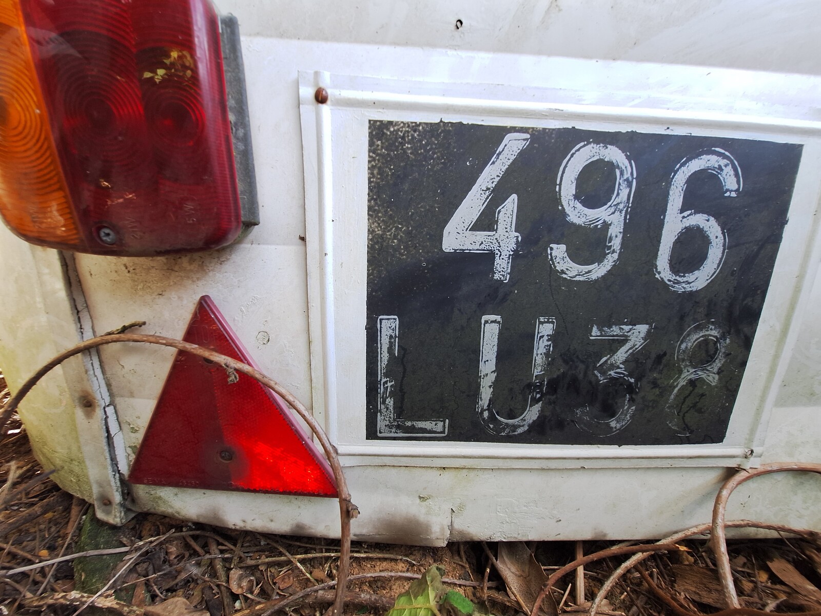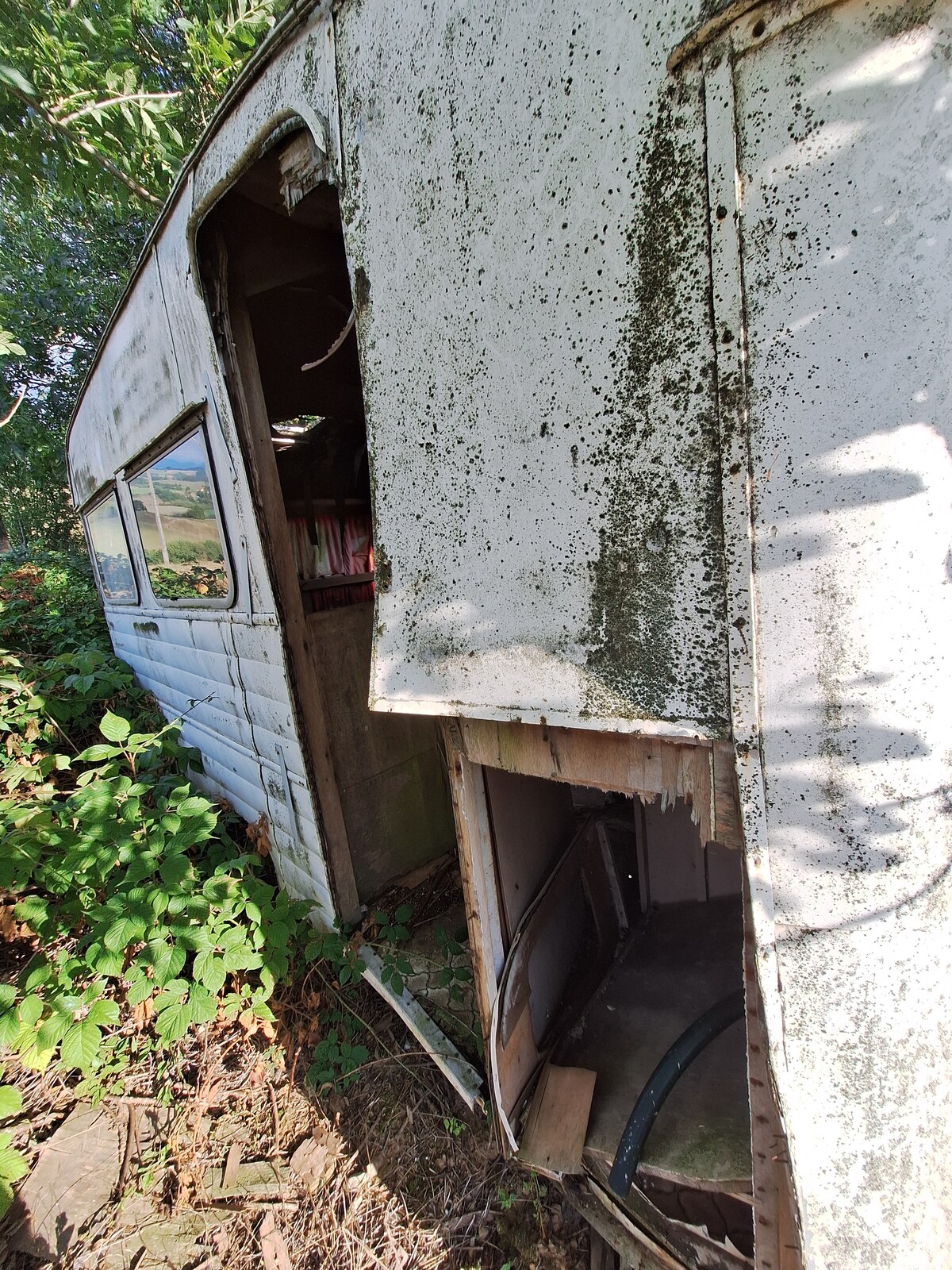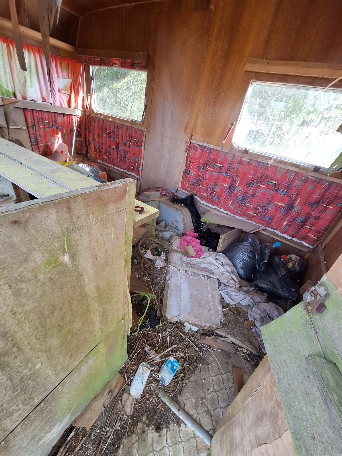 Epave de caravane en pleine nature qui a servi de dépôts d'ordures (Sac plastique, bouteille...)