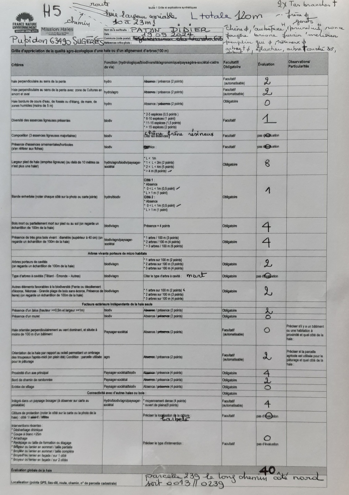 Belle haie de 120m épaisse par endroit (largeur entre 2m et plus de 10 m) très riche et évaluée à 40 (grille), près de Pupidon