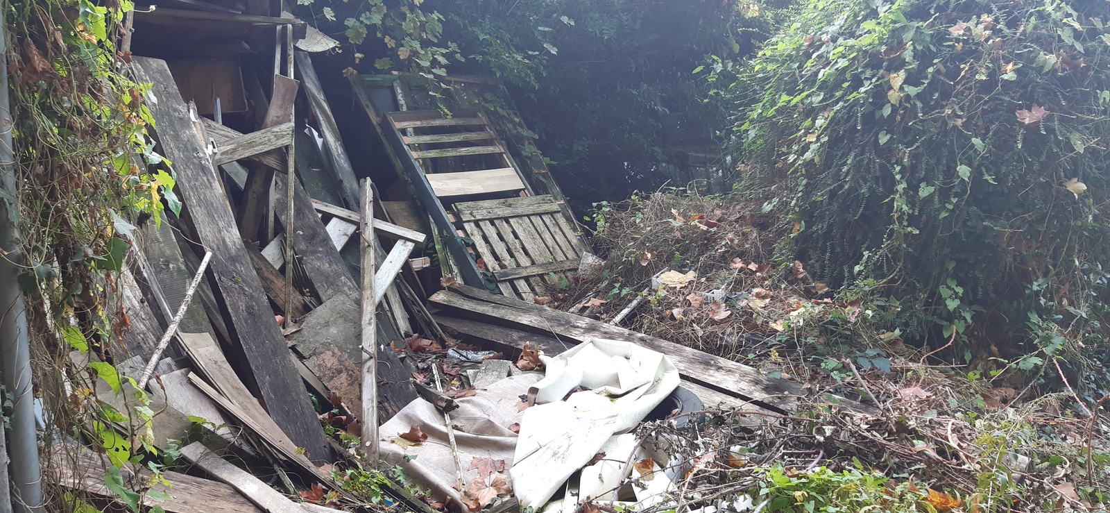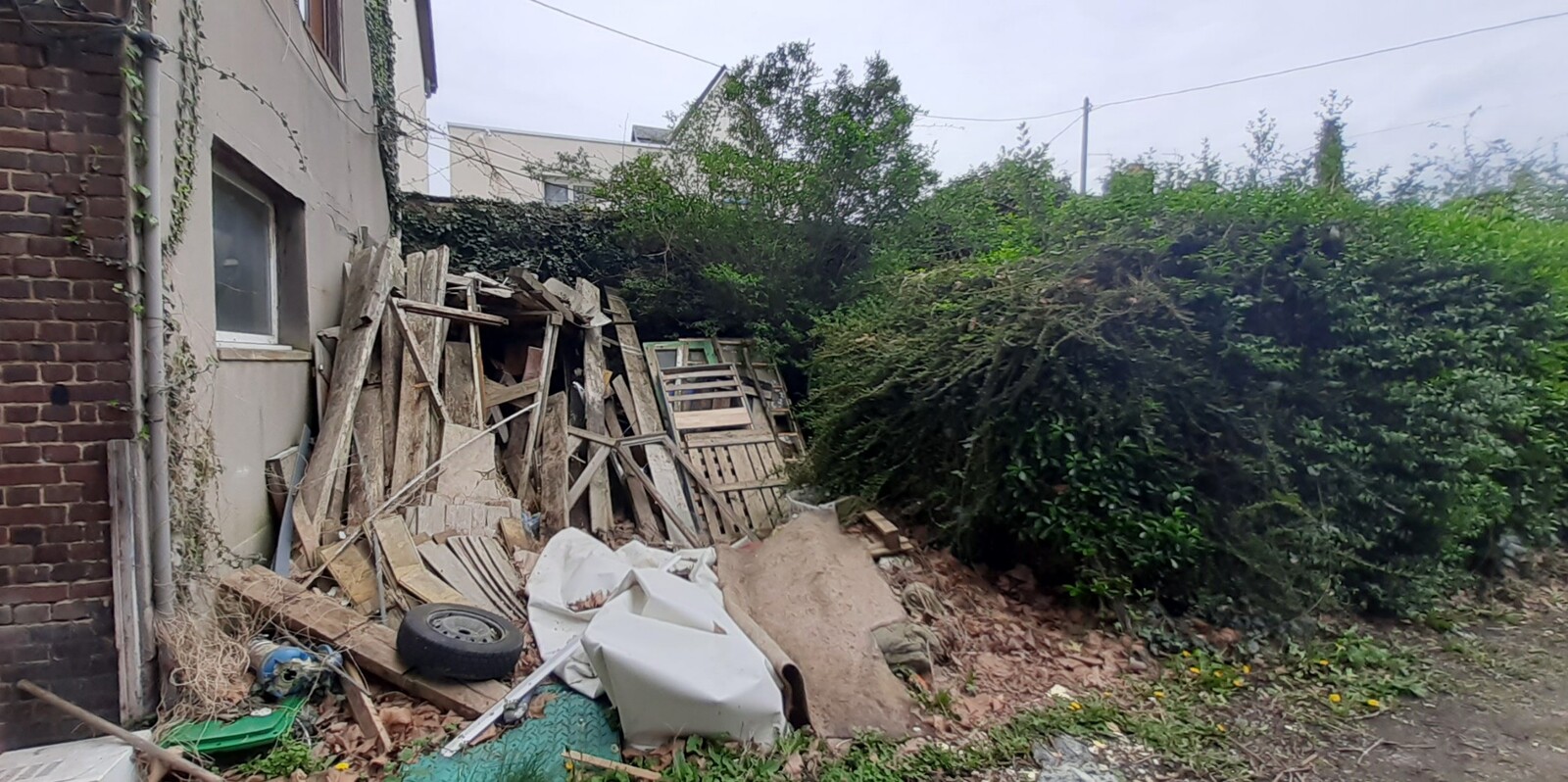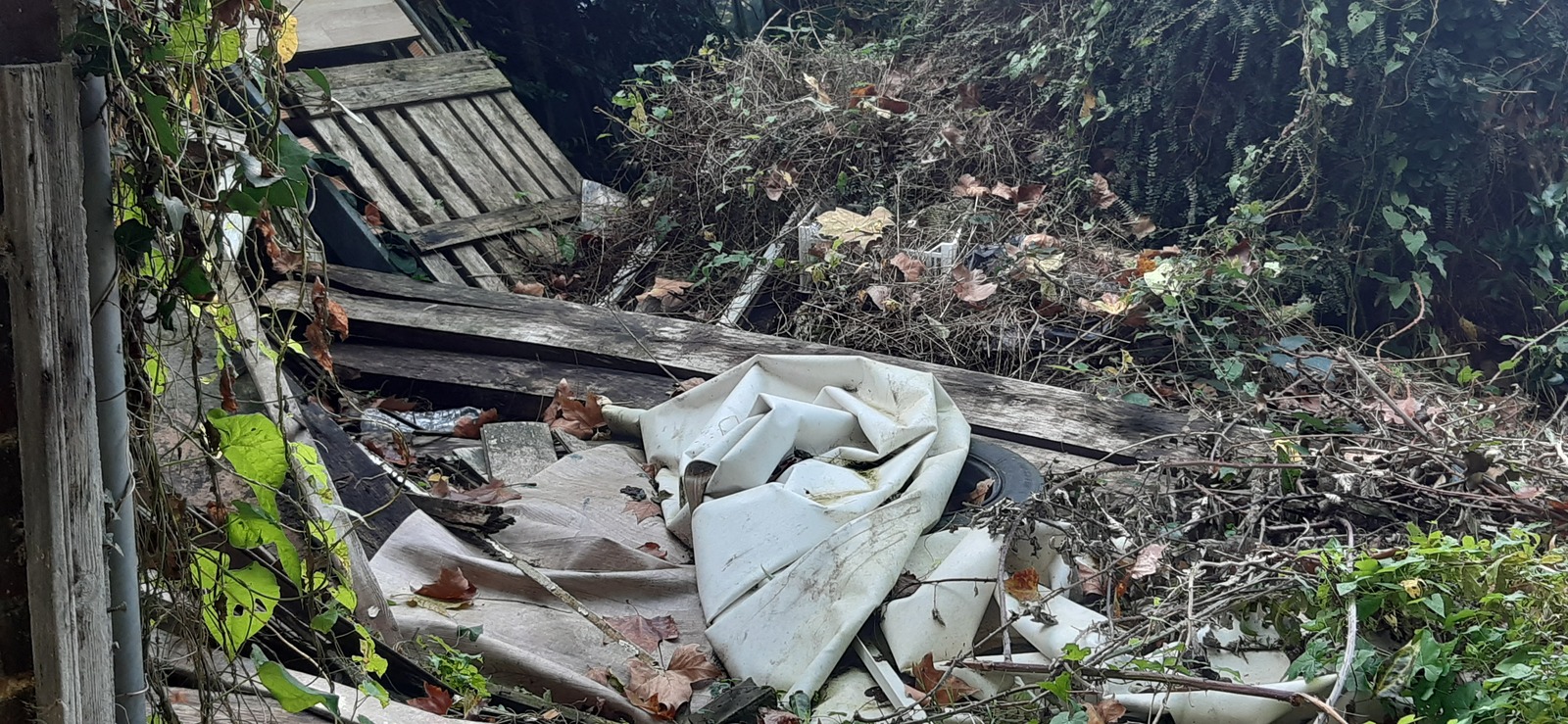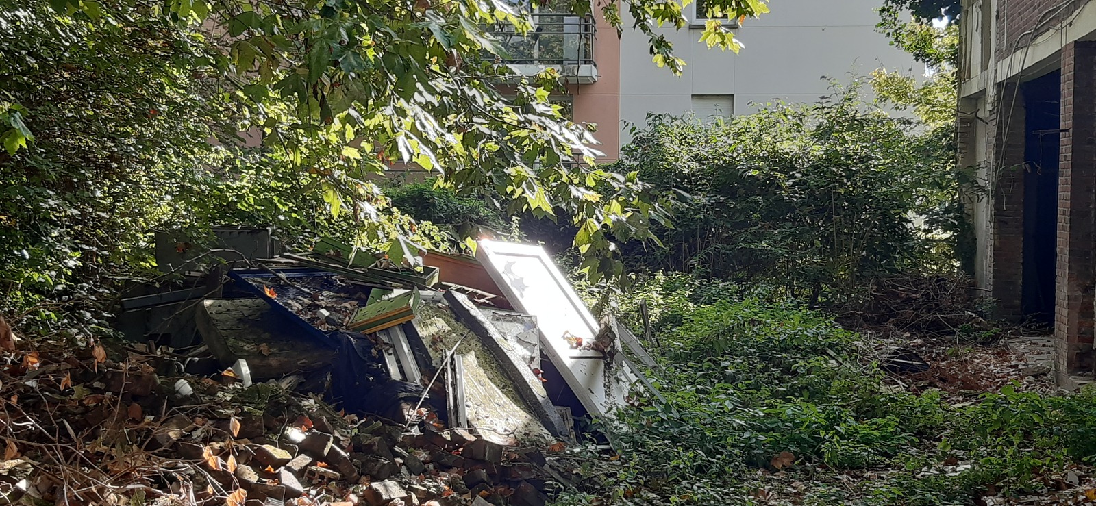 Important dépôt sauvage d'environ 16 m² composé de déchets inertes du bâtiment et plastiques. Il se situe sur un terrain privé.