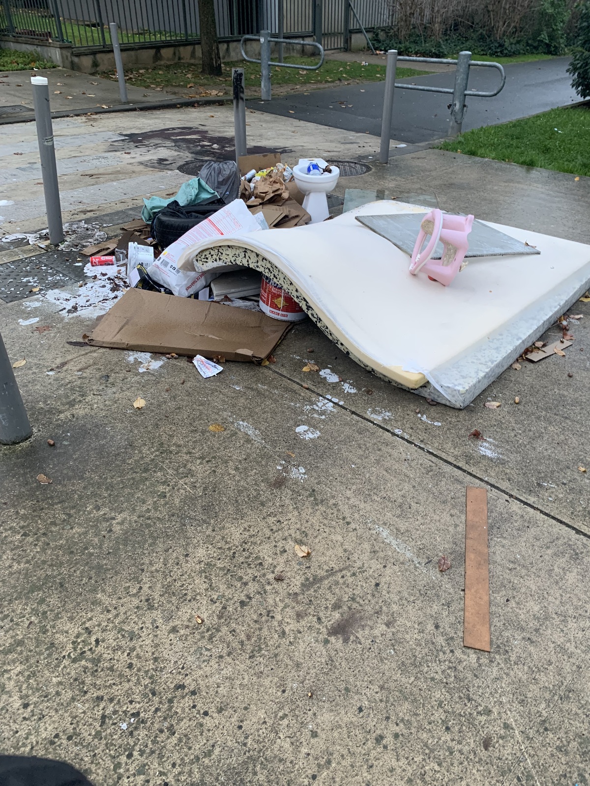 Dépôt illégal de déchets sur la voie publique (matelas, vitre, pot de peinture et peinture à même le sol, pneu…). L'ensemble recouvre une surface d'à peu près 2m3, devant un passage piéton.
