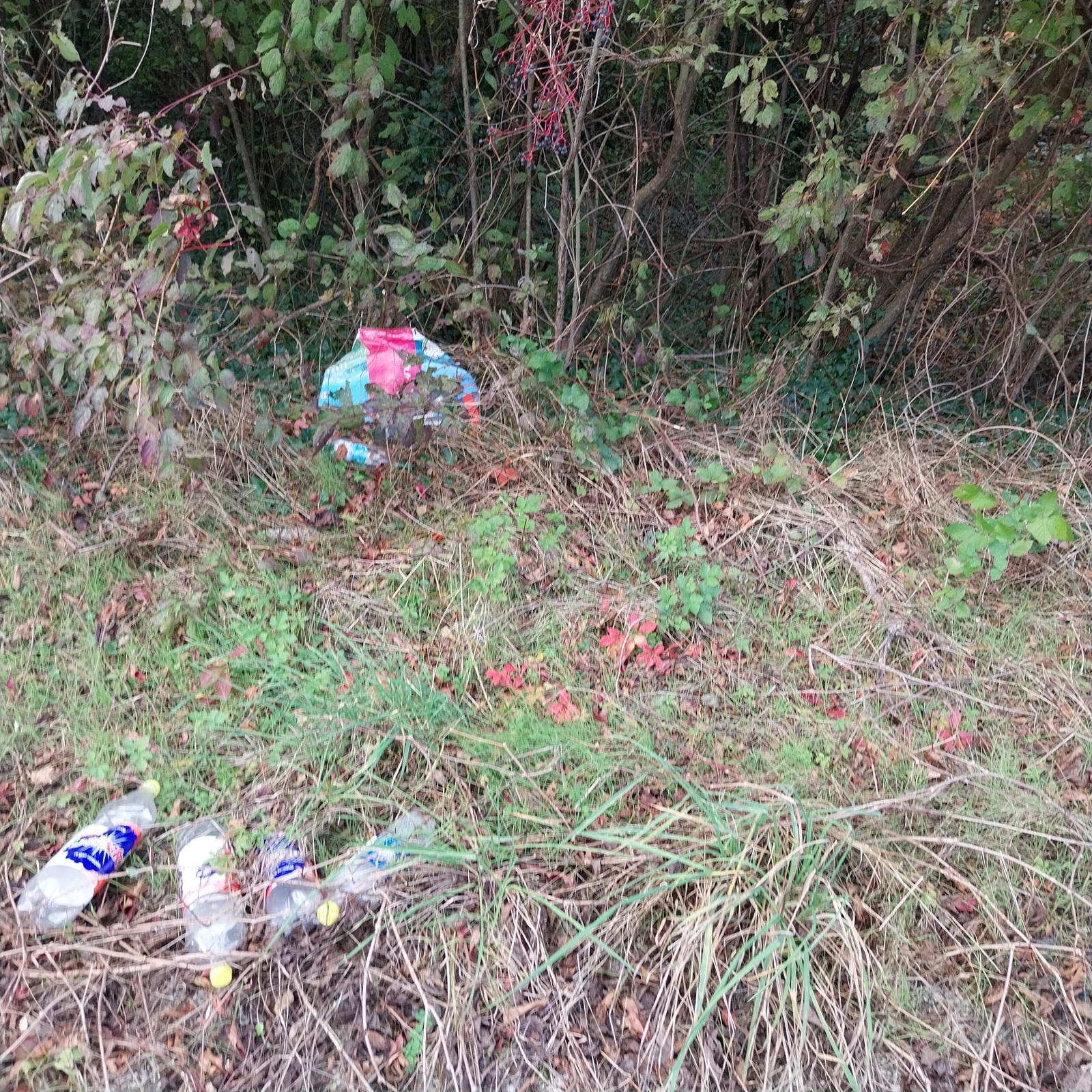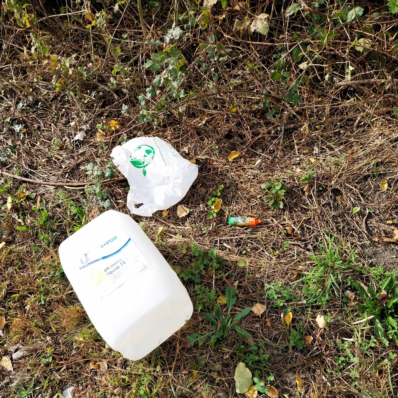 Bouteilles en plastique, bidonet sacs en plastique. Il y a des déchets de ce type éparpillés sur pratiquement toute la longueur du chemin qui dessert des champs. Il permet l'accès à Centr'Alp vers les silos.