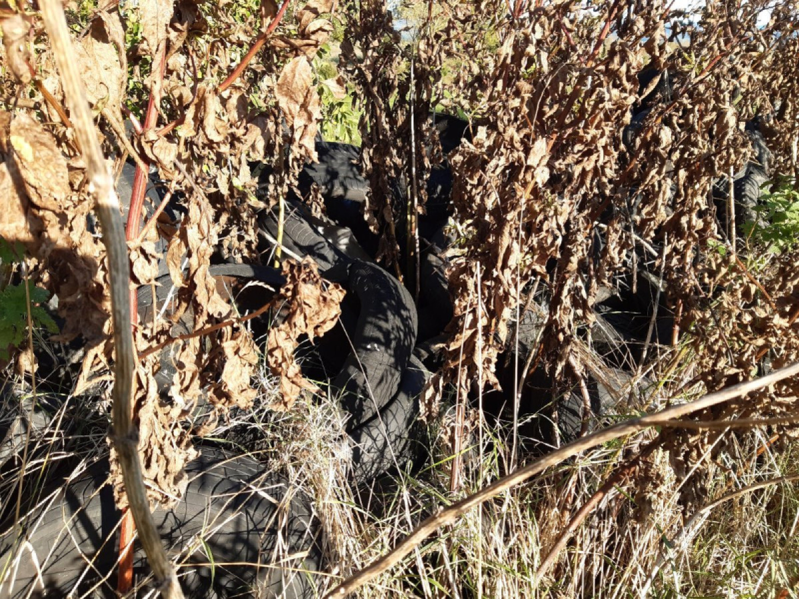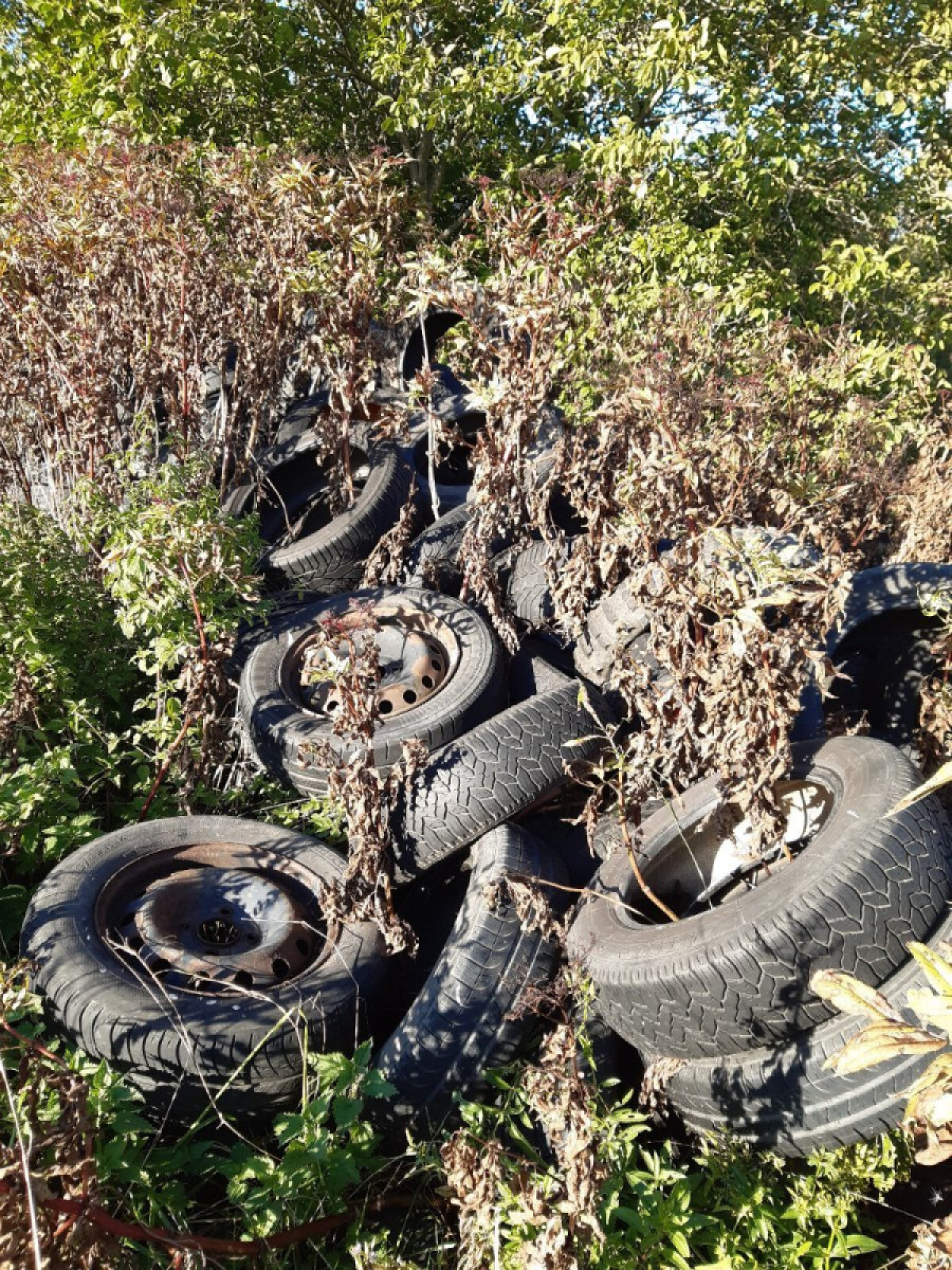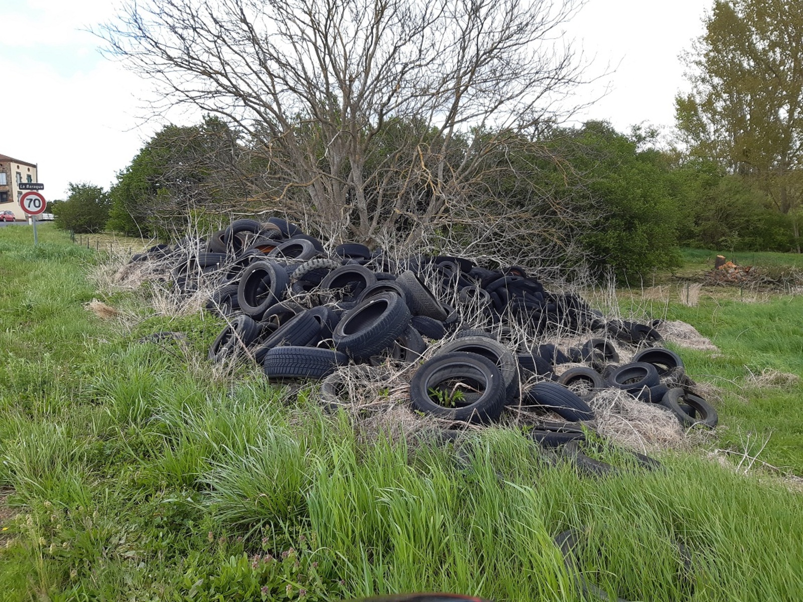 Dépôt de pneumatiques usagés en bord de route, juste à l'entrée du village, peu à peu recouvert de végétation.
