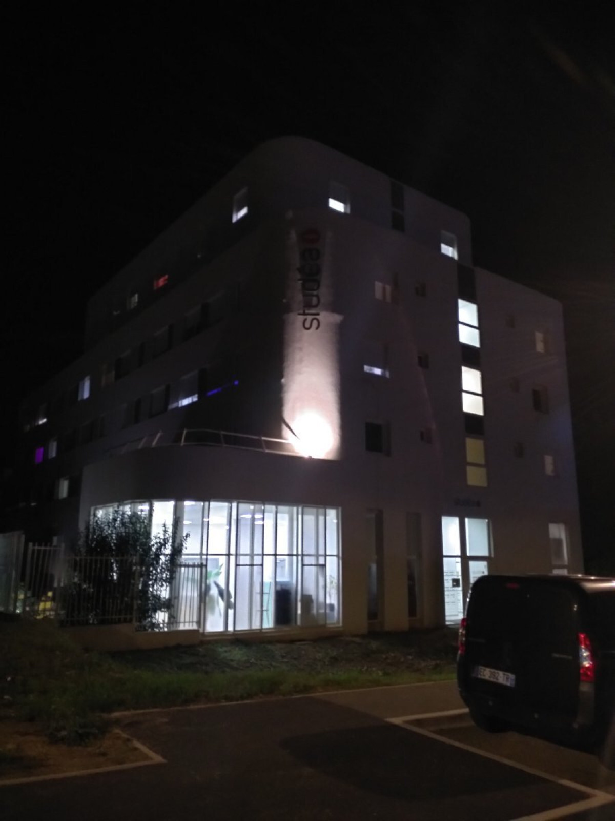 [Éclairages illégaux] : Éclairage vers le haut sur la résidence étudiante Studea. En vertu de l'arrêté du 27 décembre 2018 relatif à la prévention, à la réduction et à la limitation des nuisances lumineuses, les installations lumineuses émettant de la lumière au dessus de l'horizontal sont interdites et doivent être remplacées. Dans le cadre de notre Campagne SENTINELLES DE LA NUIT, nous procédons à leur recensement pour sensibiliser les acteurs concernés. Un courrier a été envoyé le 21 novembre 2024.