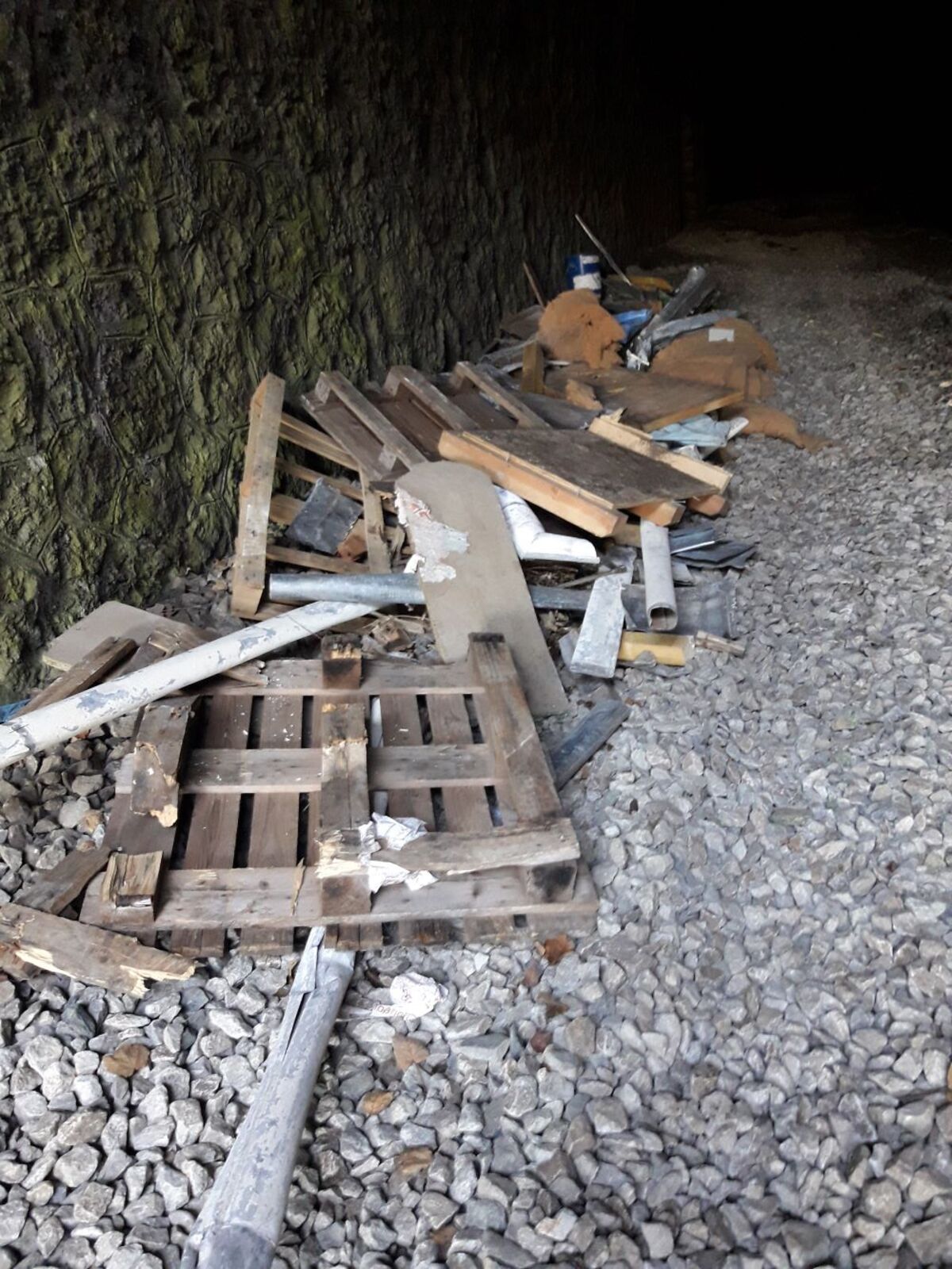 Dépôt de déchets divers : palettes, tôle, plastique.