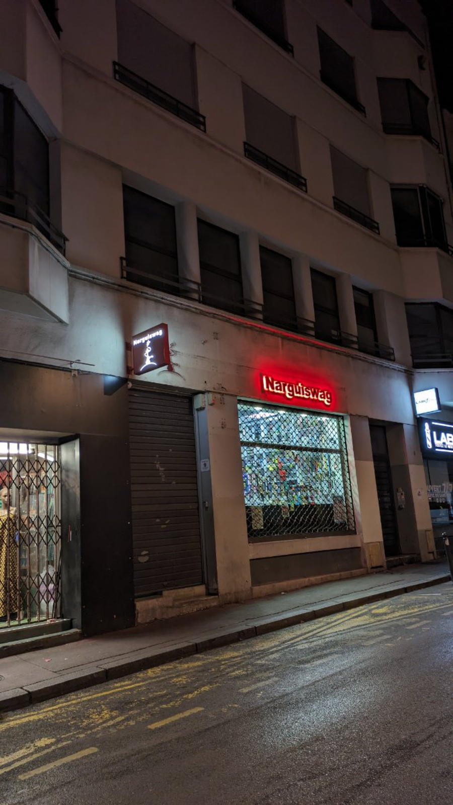 [Éclairages illégaux] : Enseigne et vitrine du magasin Narguiswag allumées à 1h52. Dans le cadre de notre Campagne SENTINELLES DE LA NUIT, nous procédons au recensement des éclairages illégaux pour sensibiliser les acteurs concernés et initier le changement.