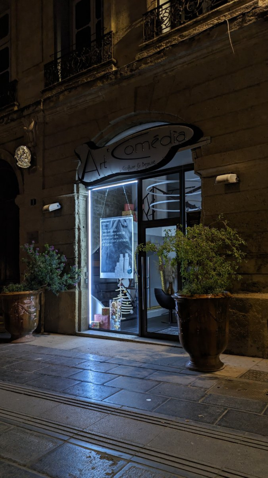 [Éclairages illégaux] : Vitrine du salon de coiffure Art'Comédia allumée à 1h56. Dans le cadre de notre Campagne SENTINELLES DE LA NUIT, nous procédons au recensement des éclairages illégaux pour sensibiliser les acteurs concernés et initier le changement.