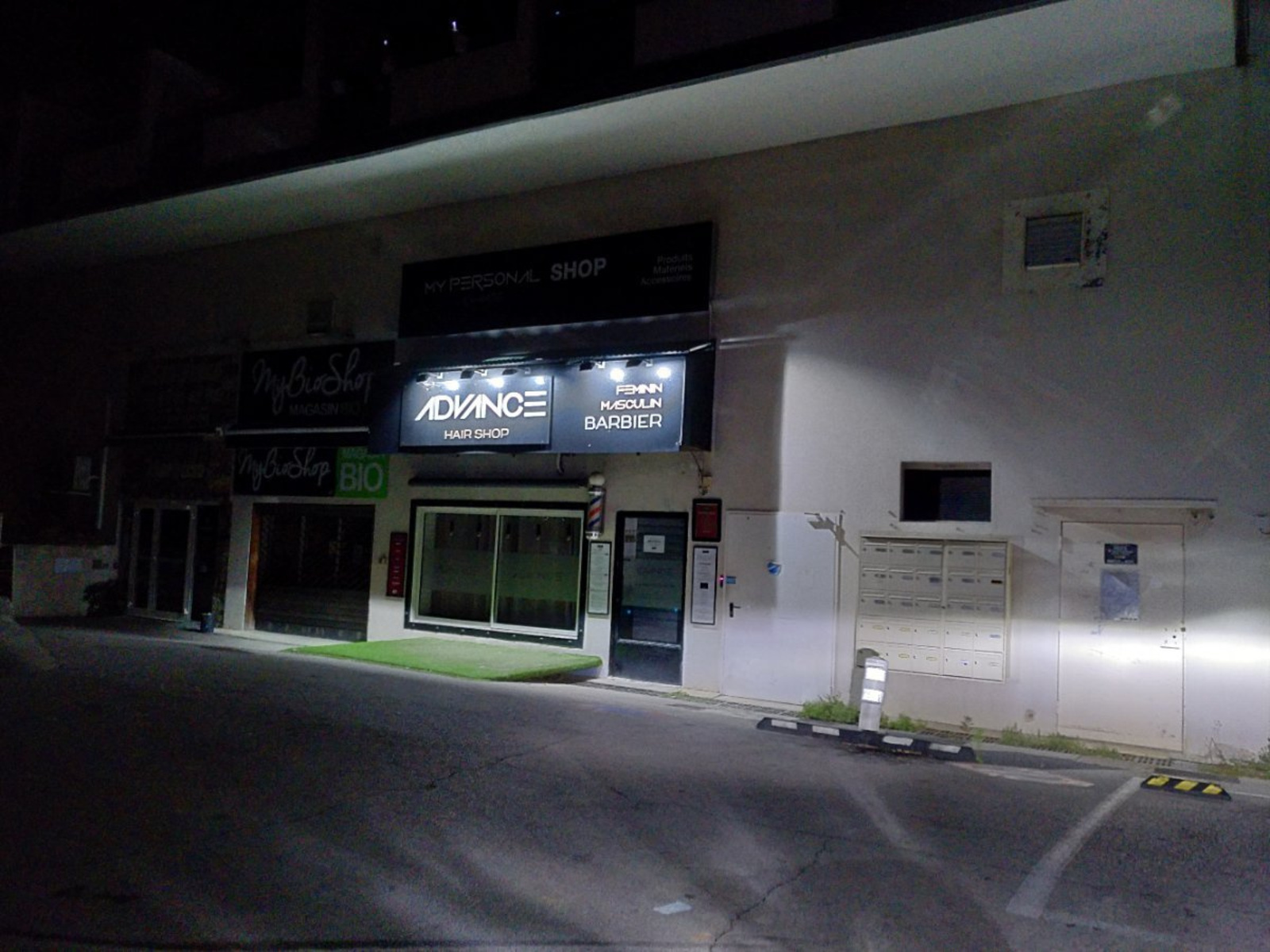 [Éclairages illégaux éteints] : Enseigne de Advance Hair Shop allumée en 2024 et éteinte en 2025.