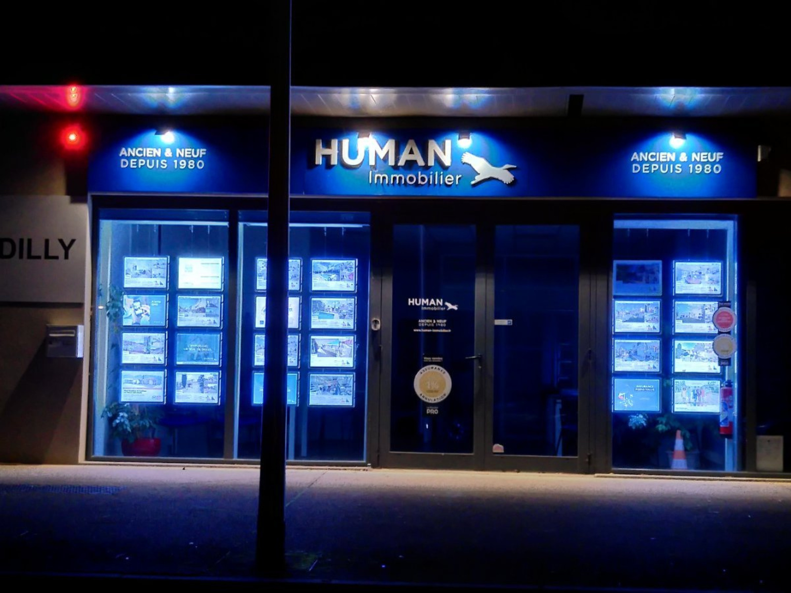 [Éclairages illégaux persistants] : Enseigne de Human Immo toujours allumée en cœur de nuit en octobre 2025 malgré sensibilisation.