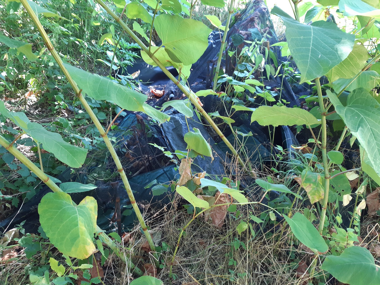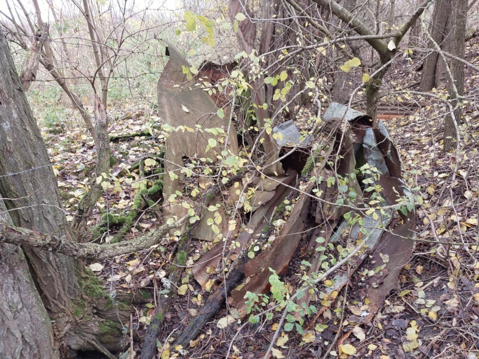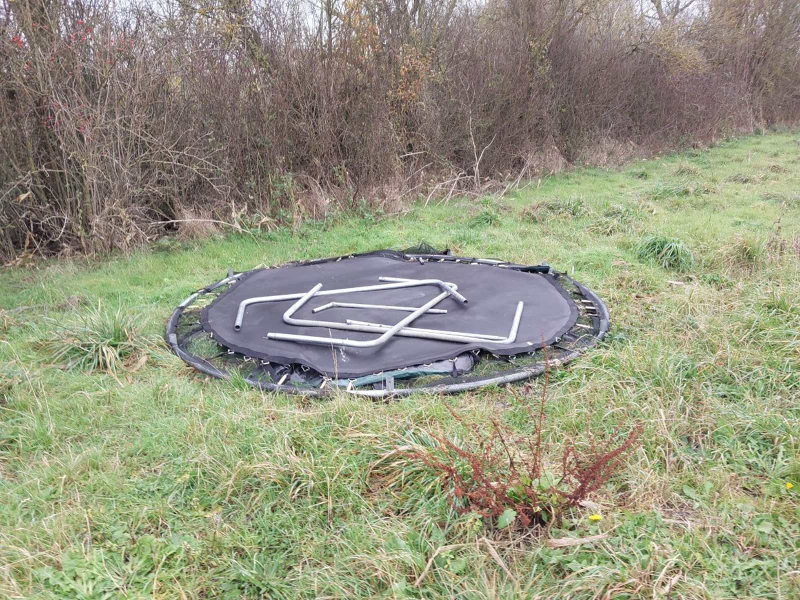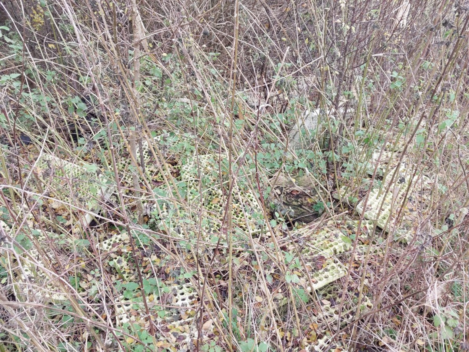 Dépôt de déchets (plastiques, tôles, plaques polystyrène, ancien trampoline) sur tout le bord de la haie longeant le chemin et la culture.