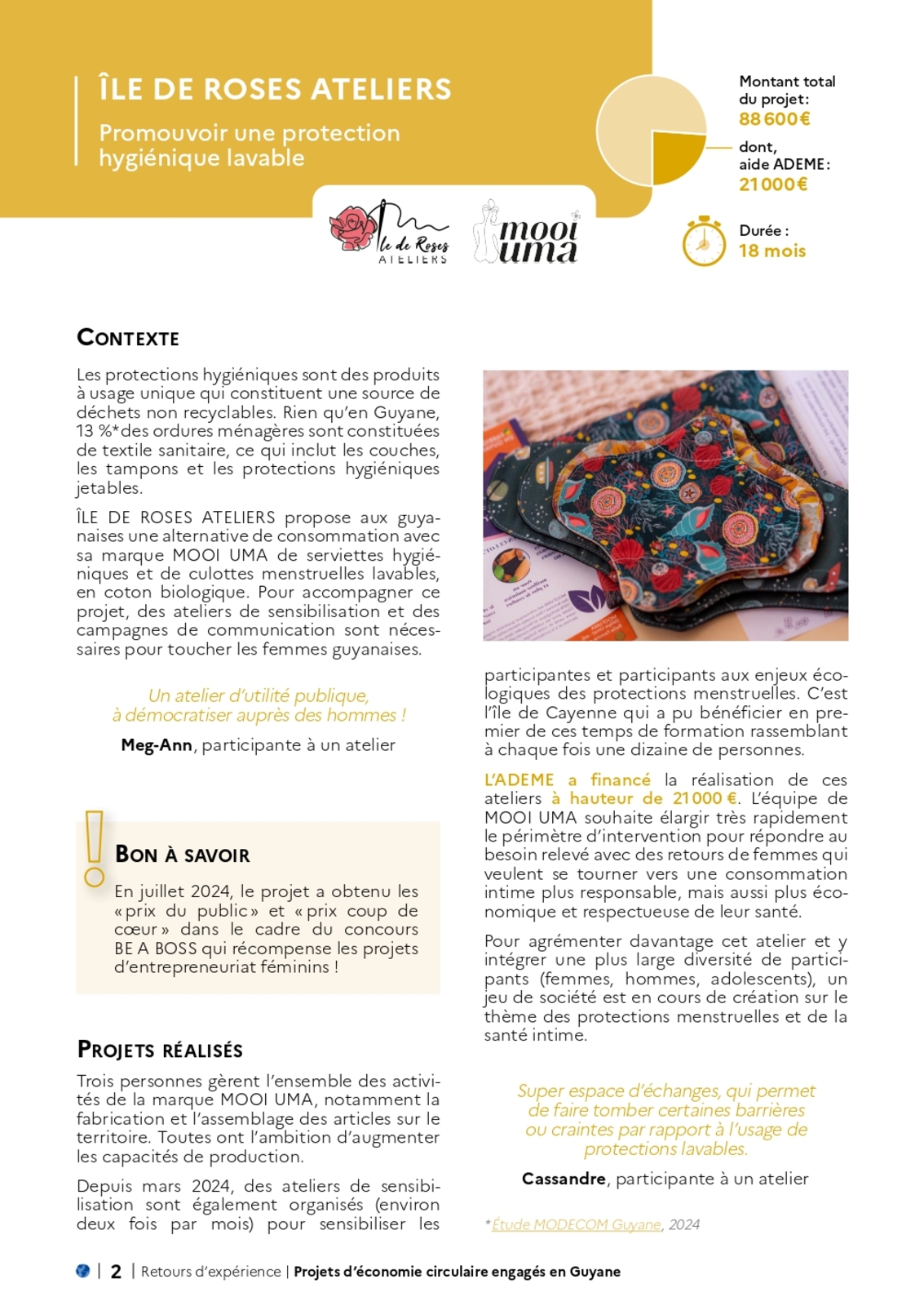 Ile de Roses Ateliers propose une serviette hygiénique et des culottes menstruelles lavables. Des ateliers de sensibilisation sont également organisés auprès des femmes guyanaises.