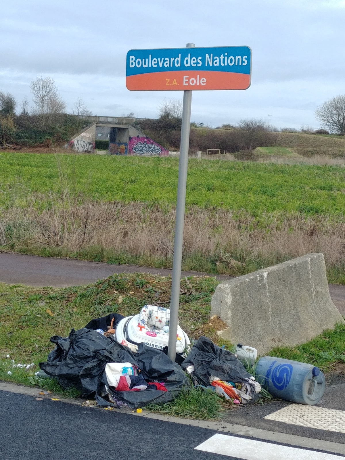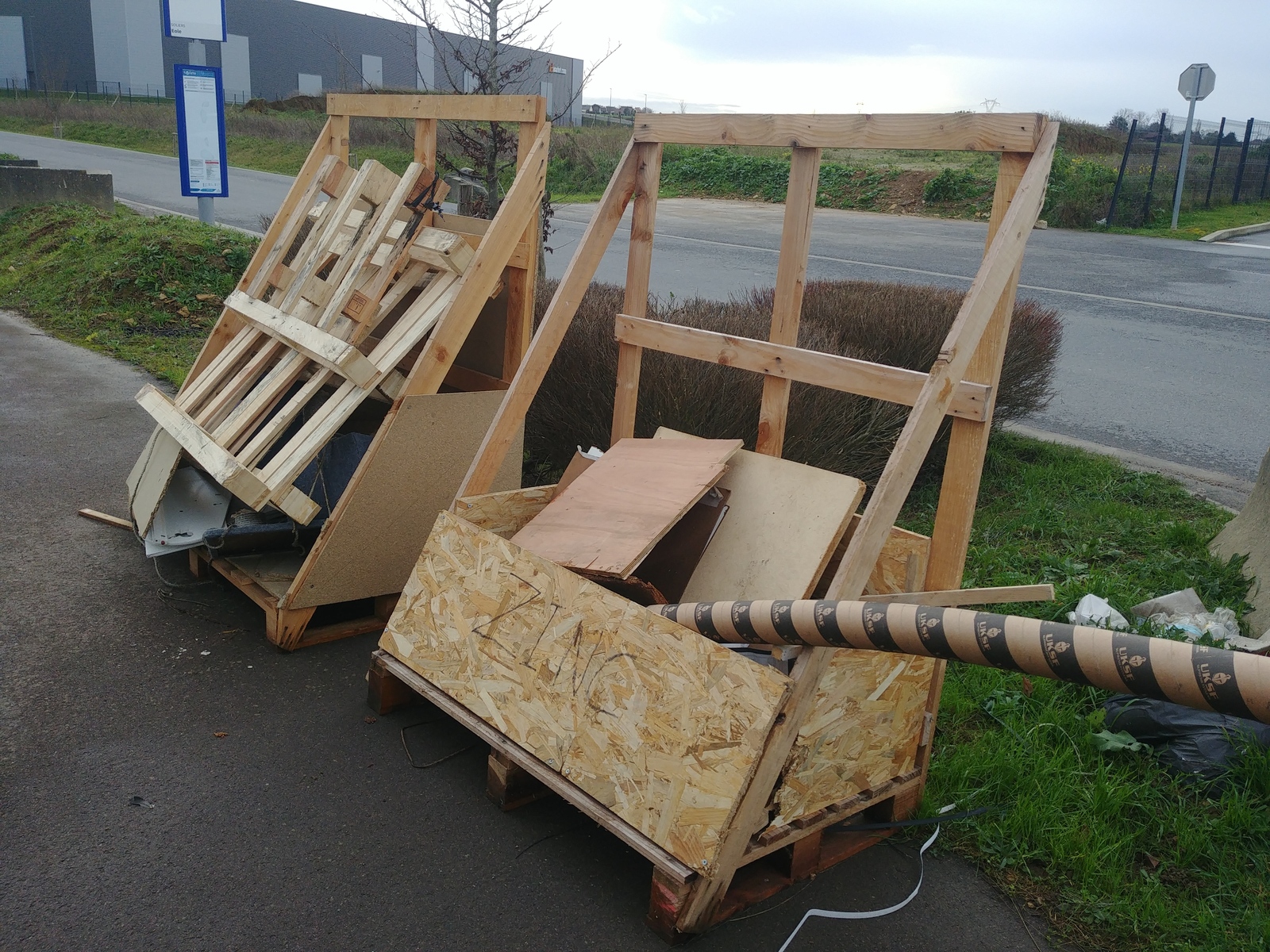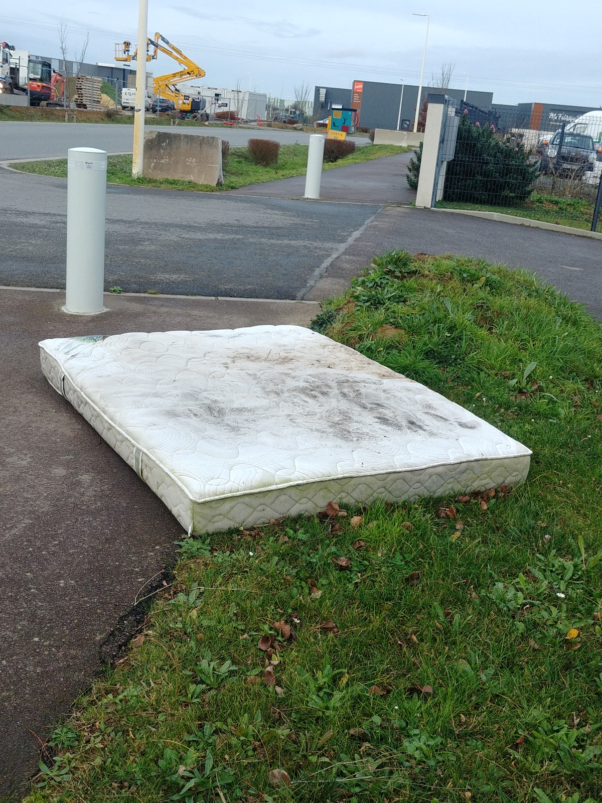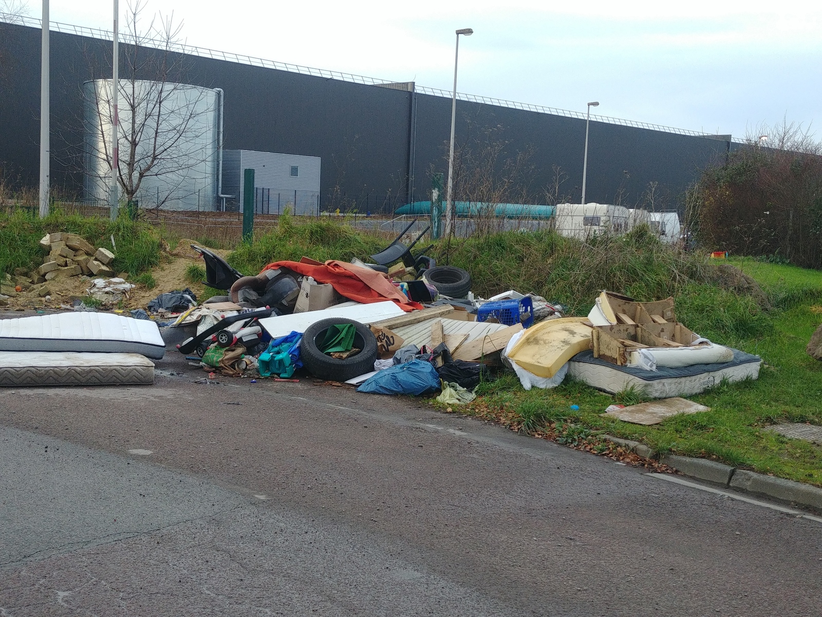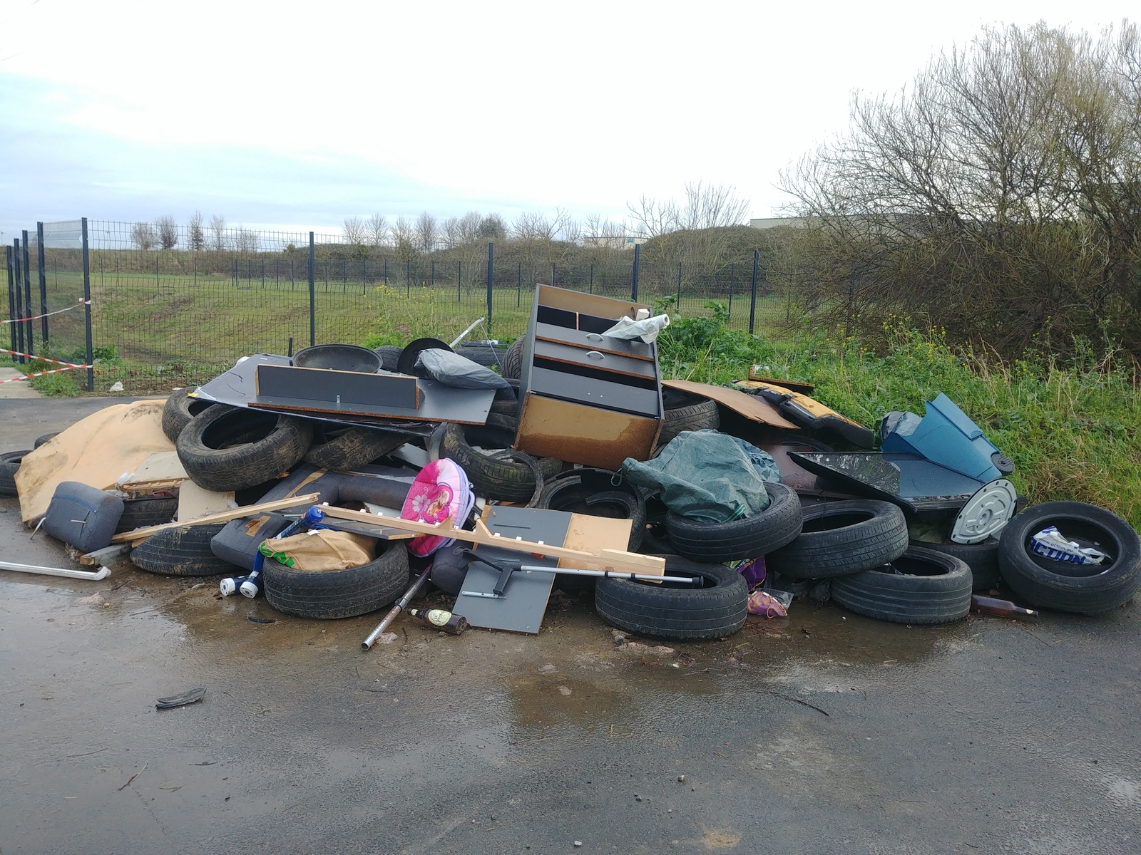 Présence de plusieurs dépôts de déchets composés de pneus, de déchets ménagers, de meubles et matelas, à proximité d'une zone industrielle et commerciale.