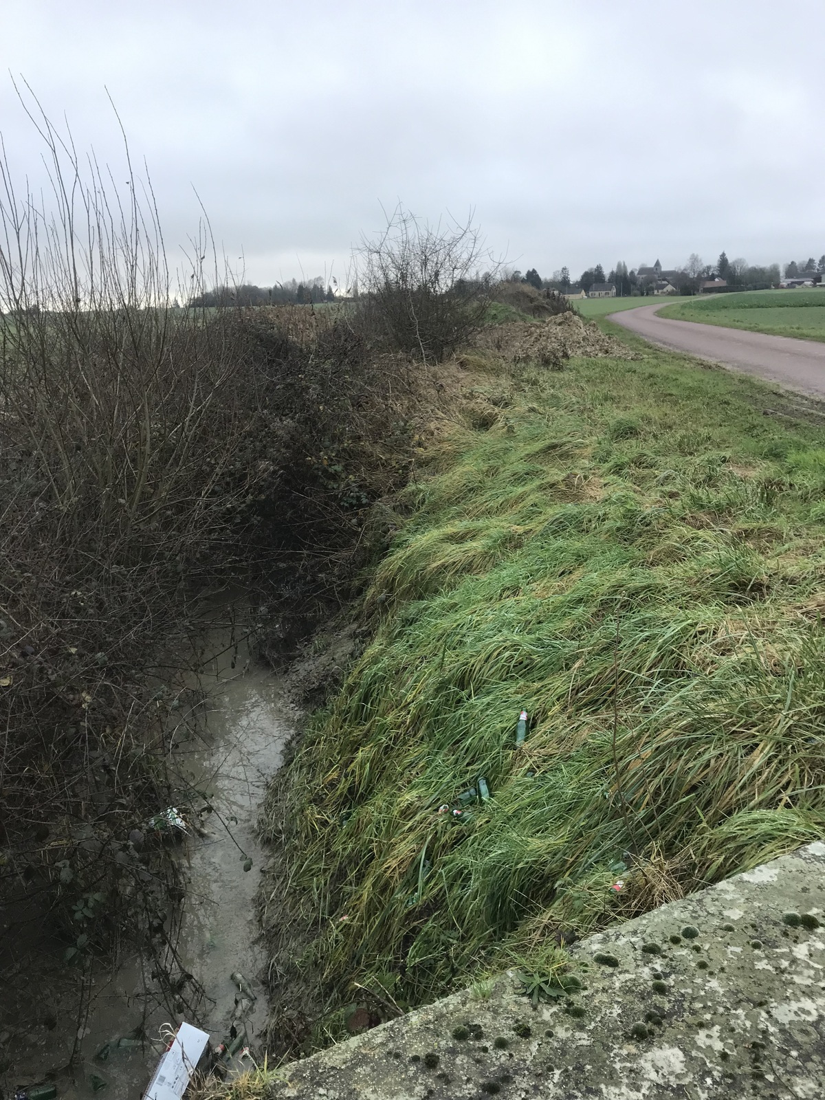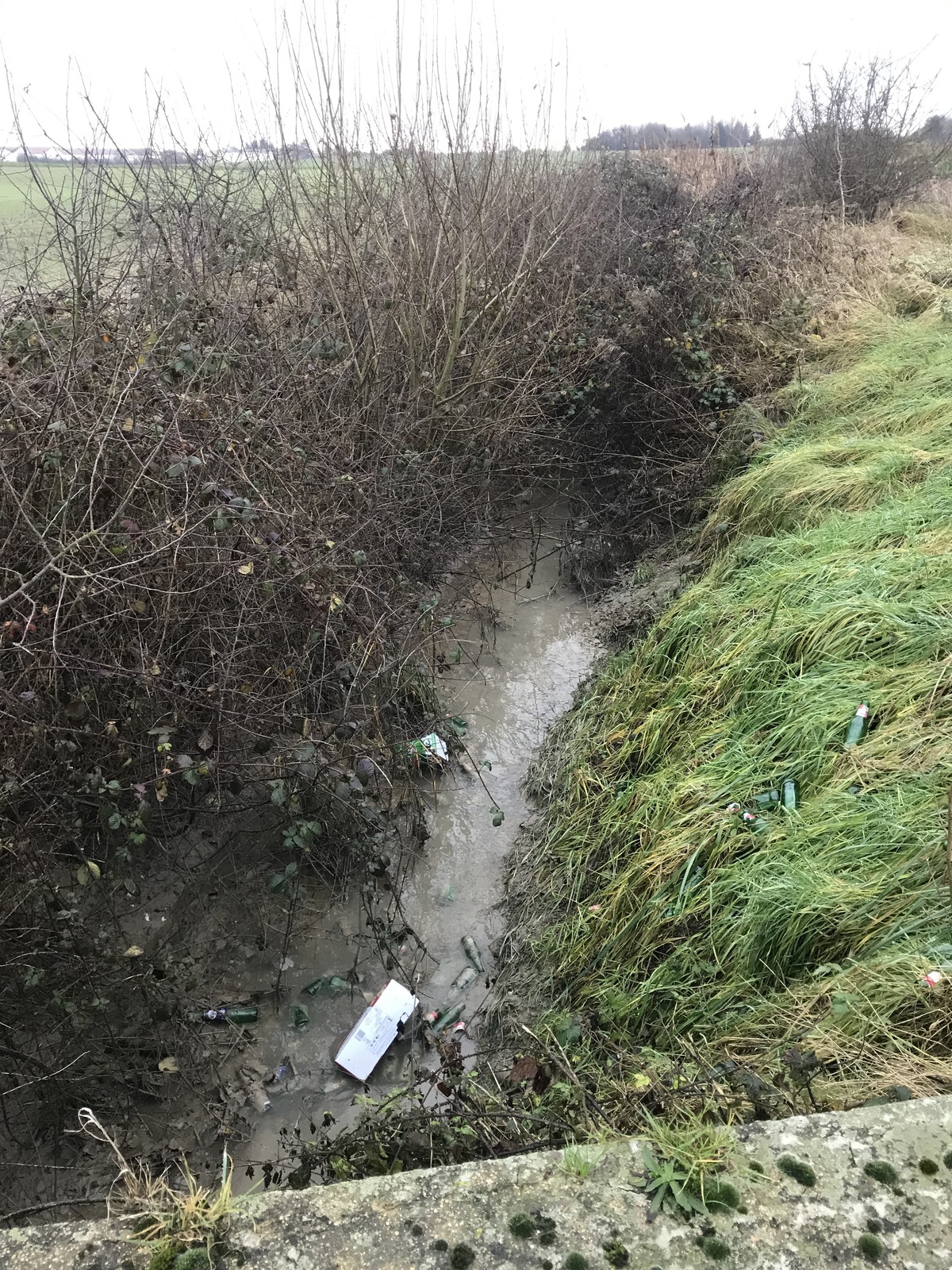 Déchets ménagers, bouteilles de bières plus ou moins vides déposées dans le cours d'eau avec carton d'emballage.