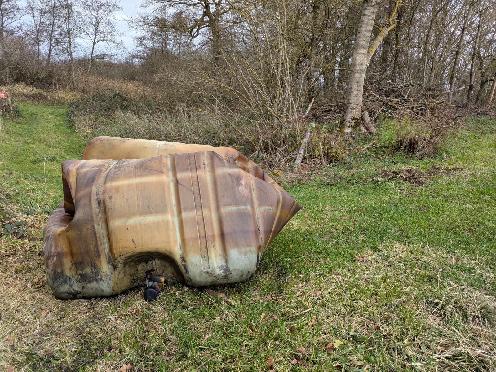 Dépôt de nombreux déchets incluant des déchets dangereux (cuve à fioul) en bord immédiat d'étang et de réseau de canaux aquatiques.