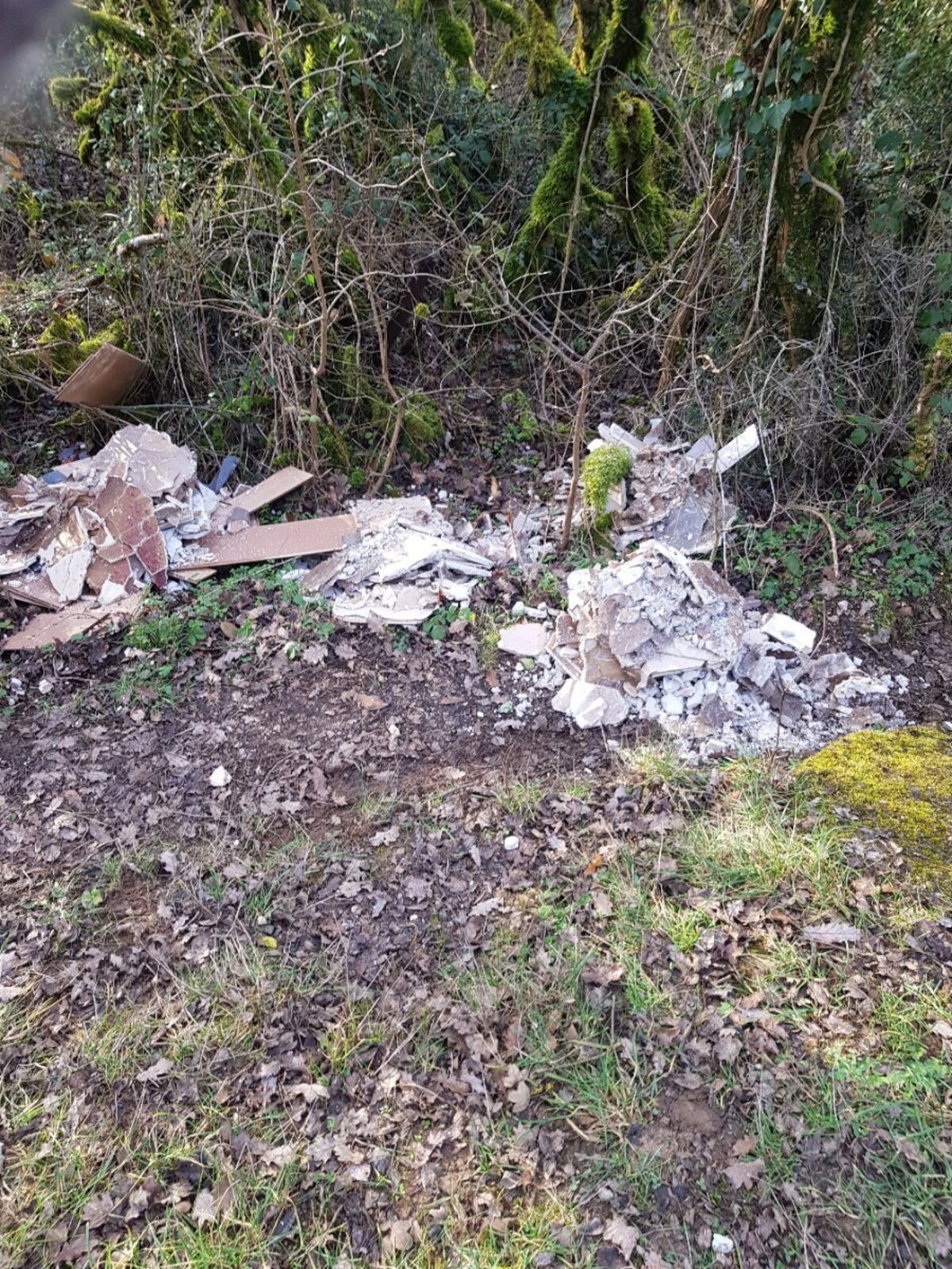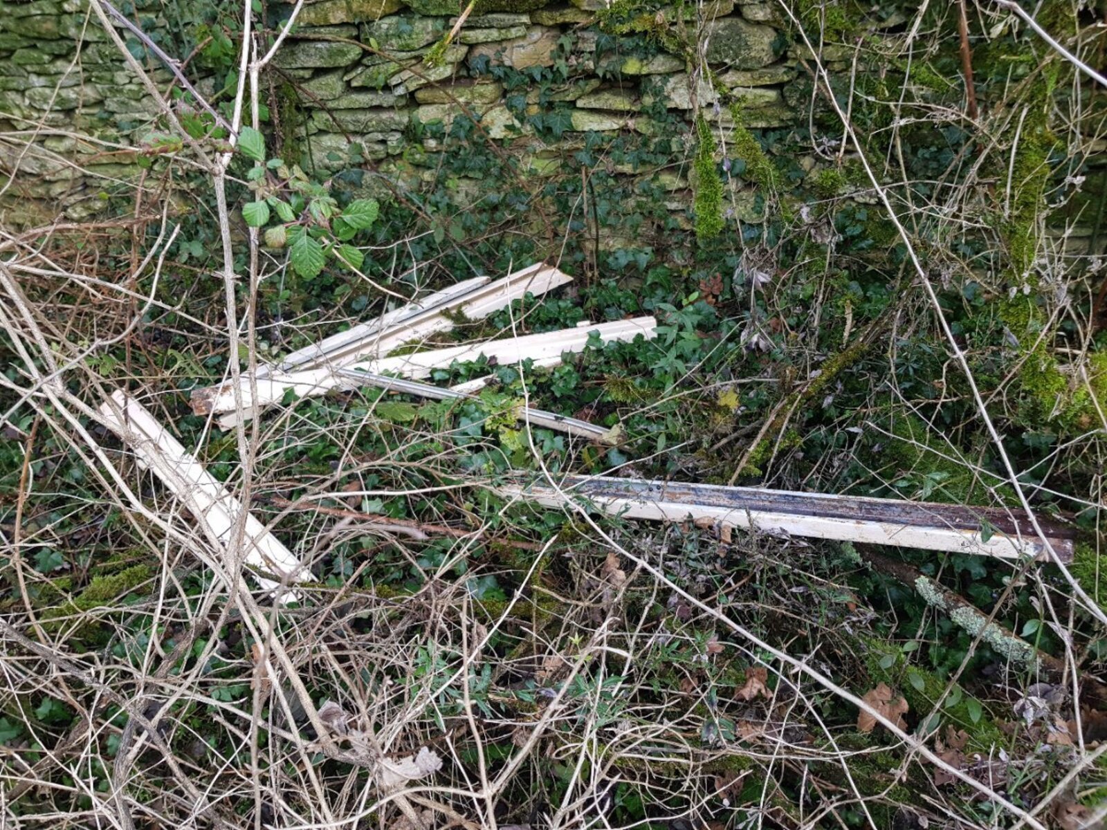 Déchets de travaux (cadre de porte, placo jetés de part et d'autre du chemin de tortu. Ces déchets n'étaient pas présents le 1er janvier