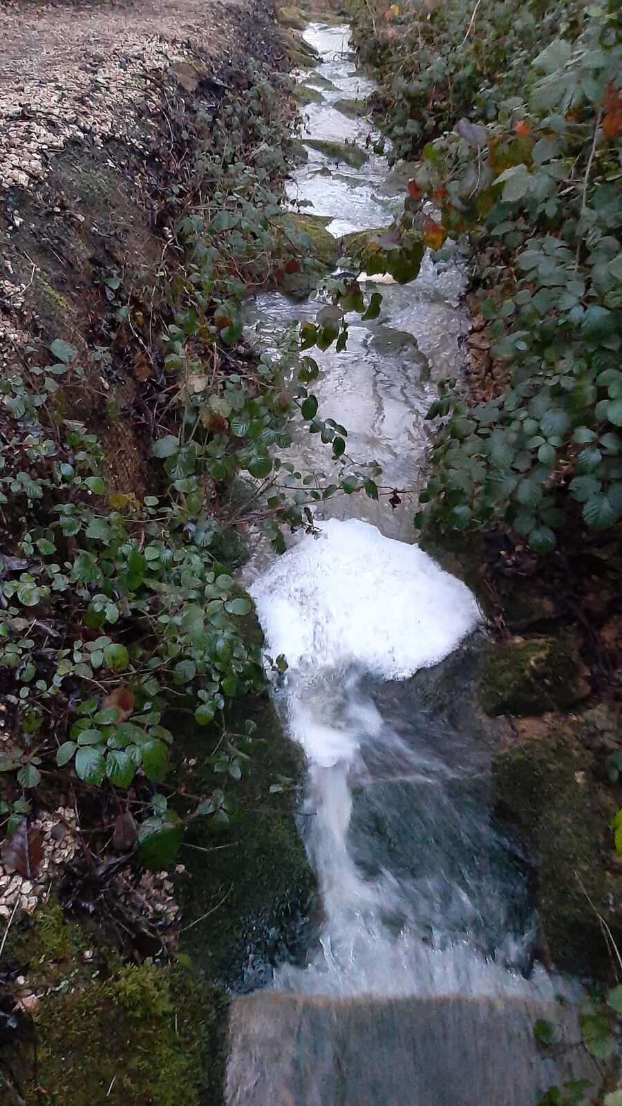 Pollution de l'eau d'un ruisseau par un produit de lavage (mousse)