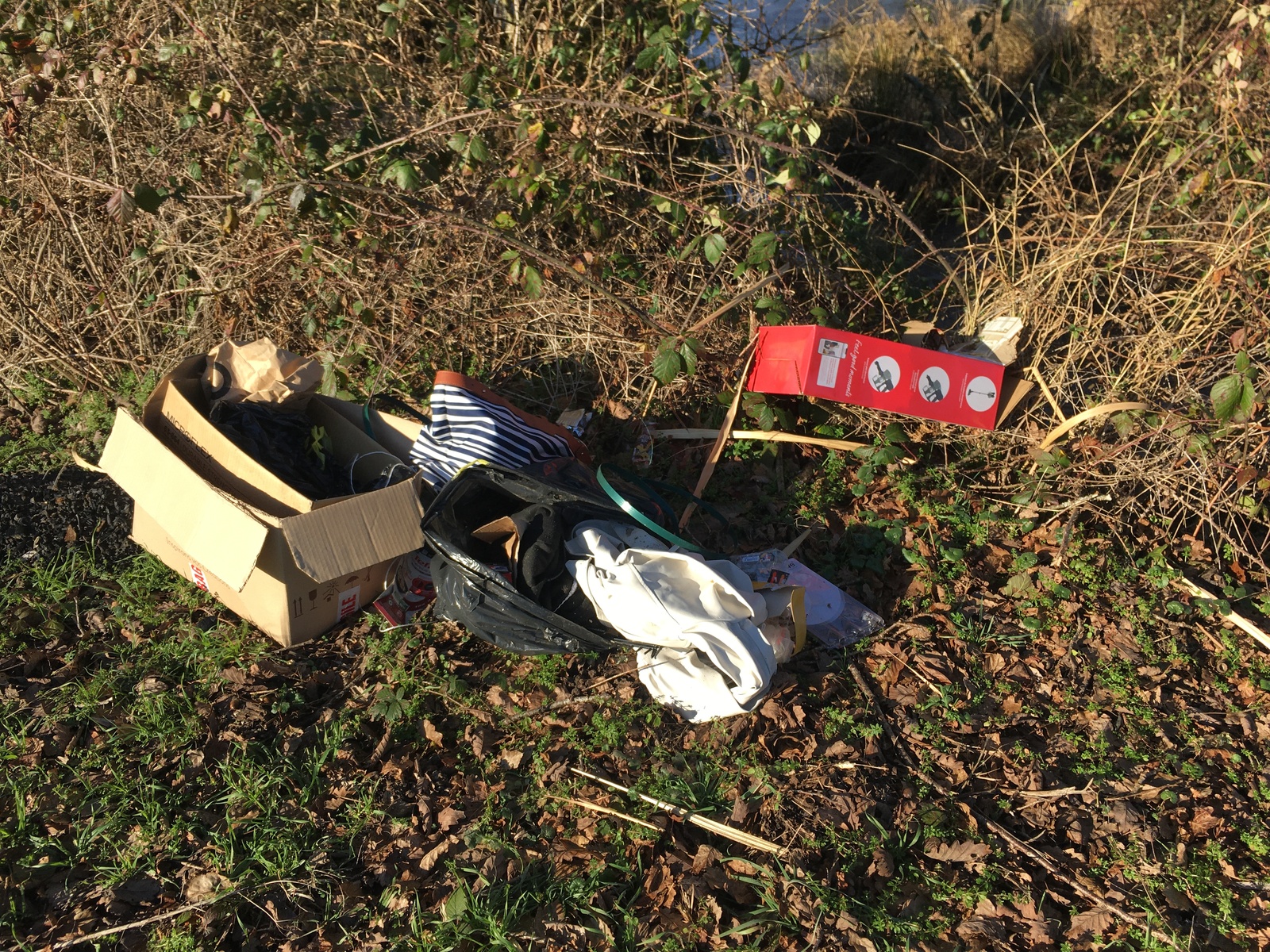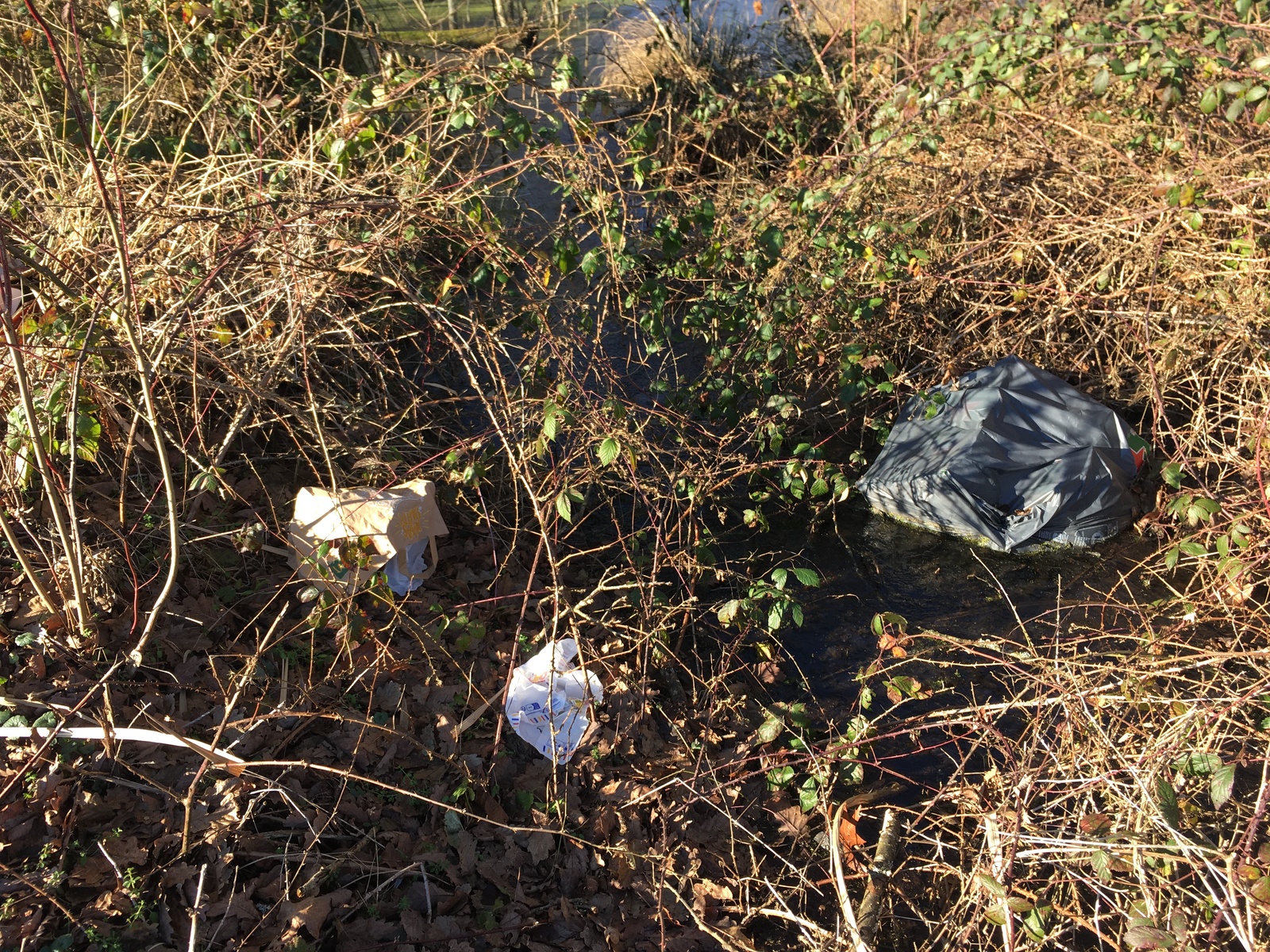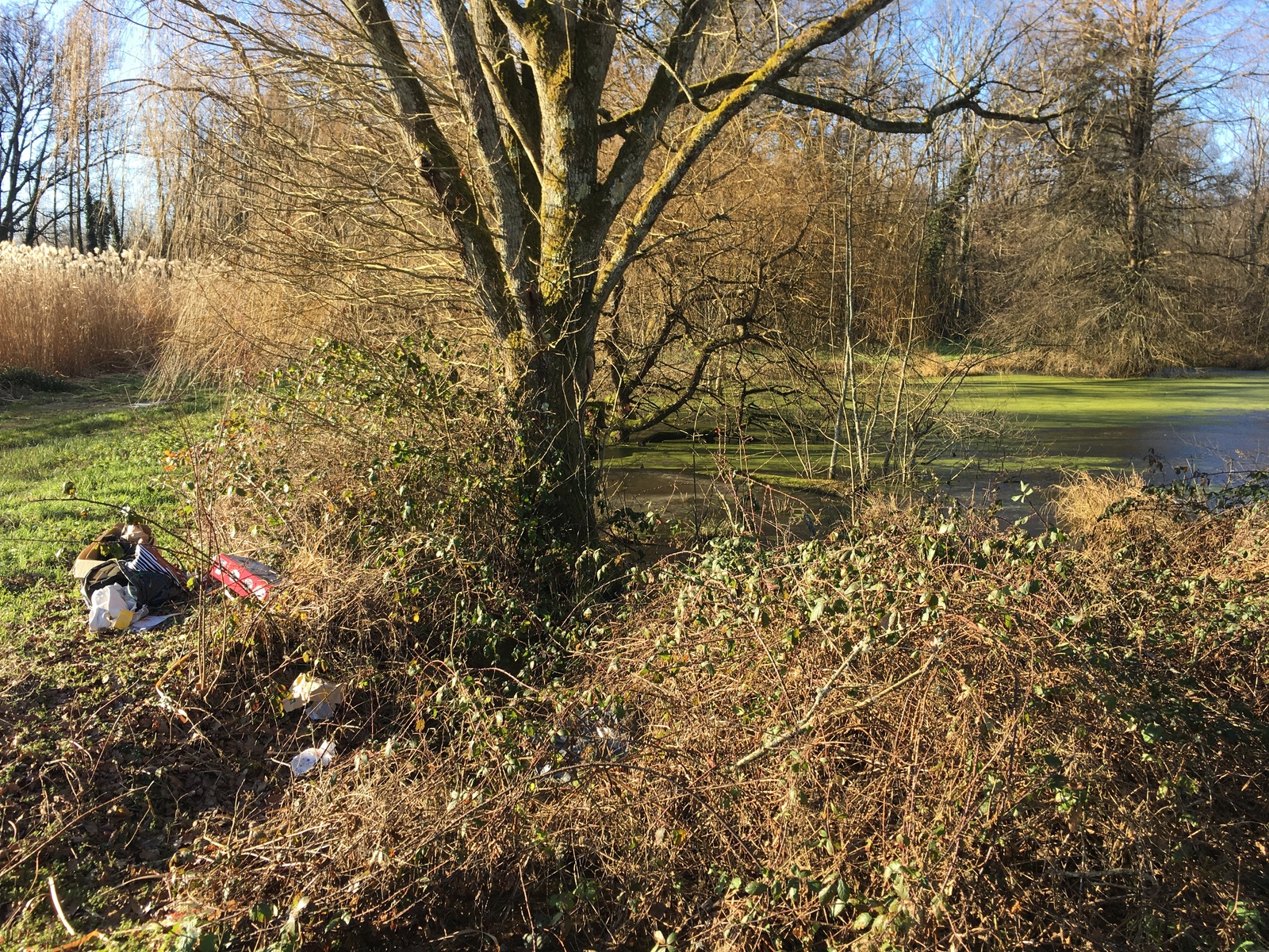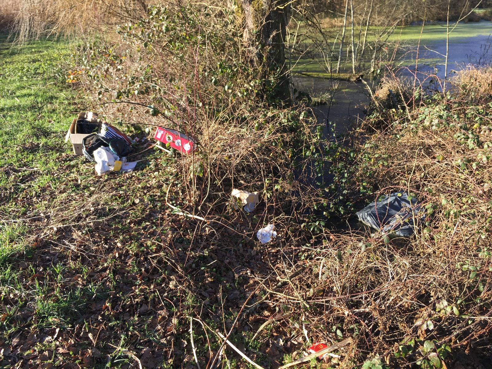 Quelques cartons et sacs poubelles abandonnés au bord de la mare, dont l'un est partiellement immergé dans l'eau.