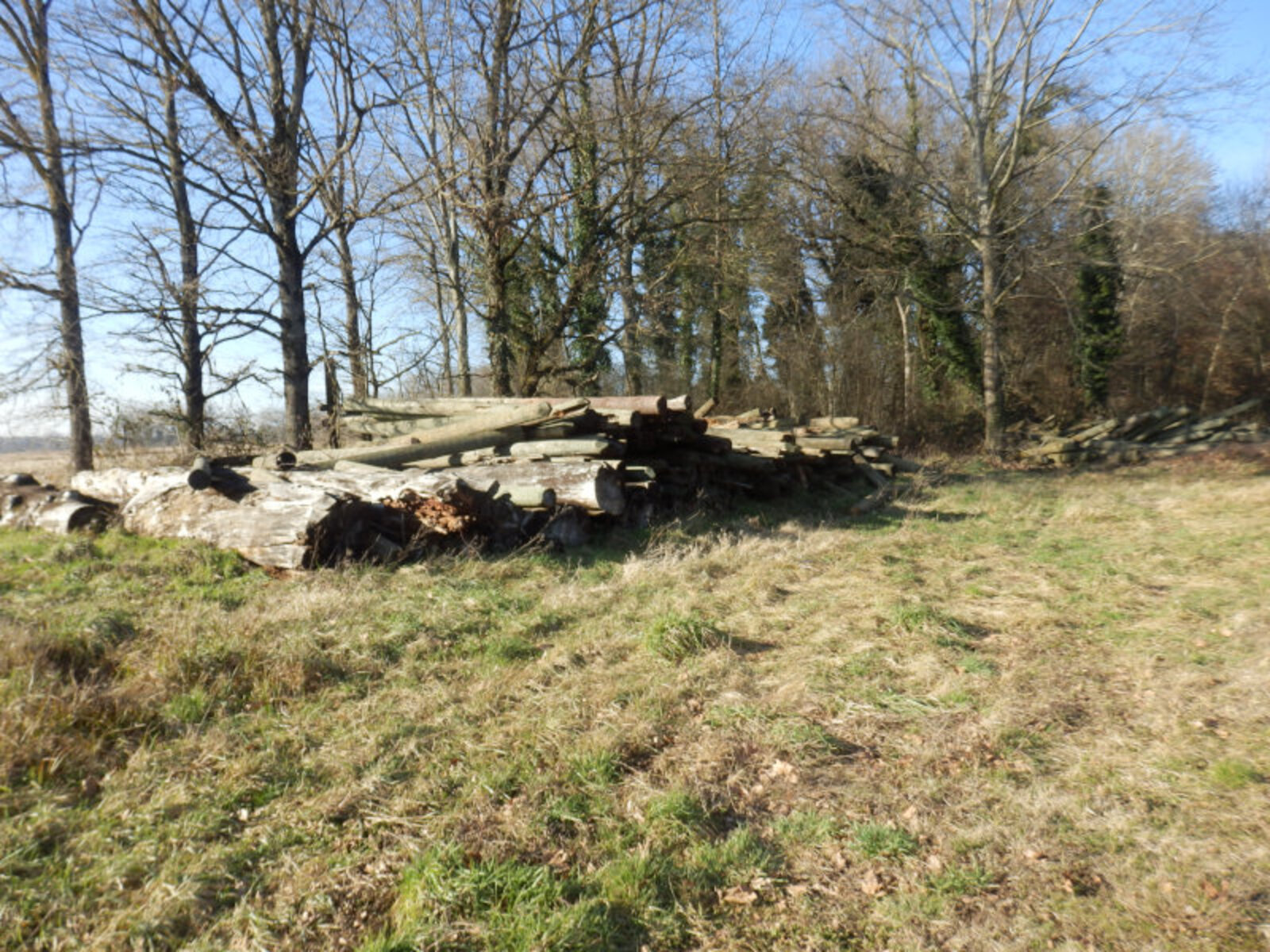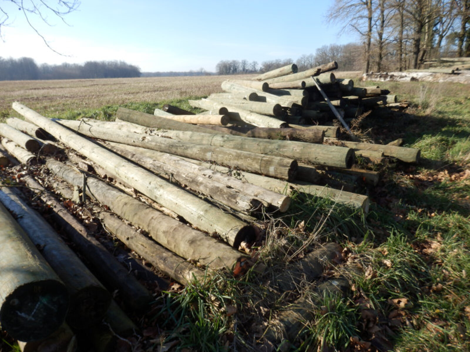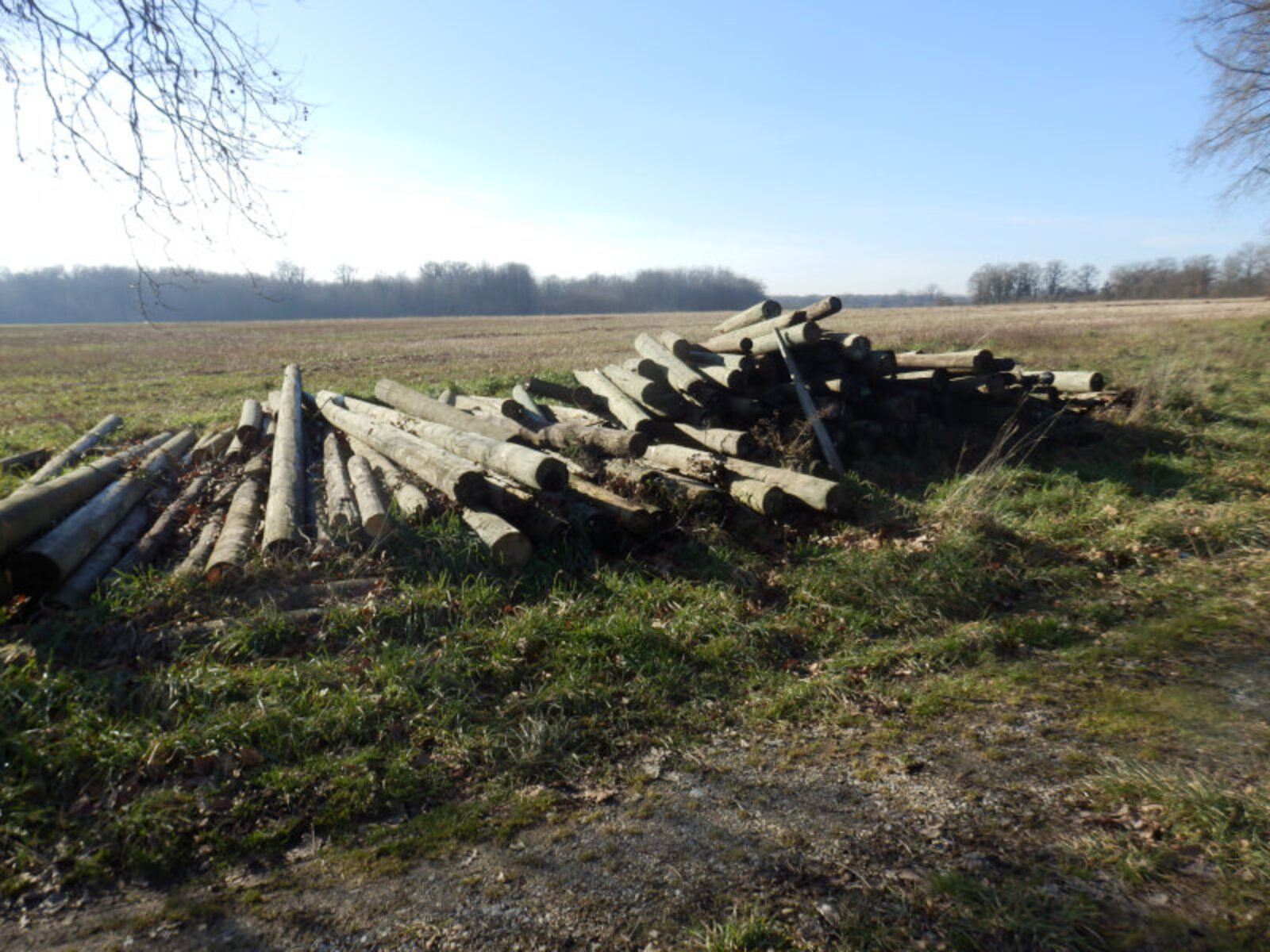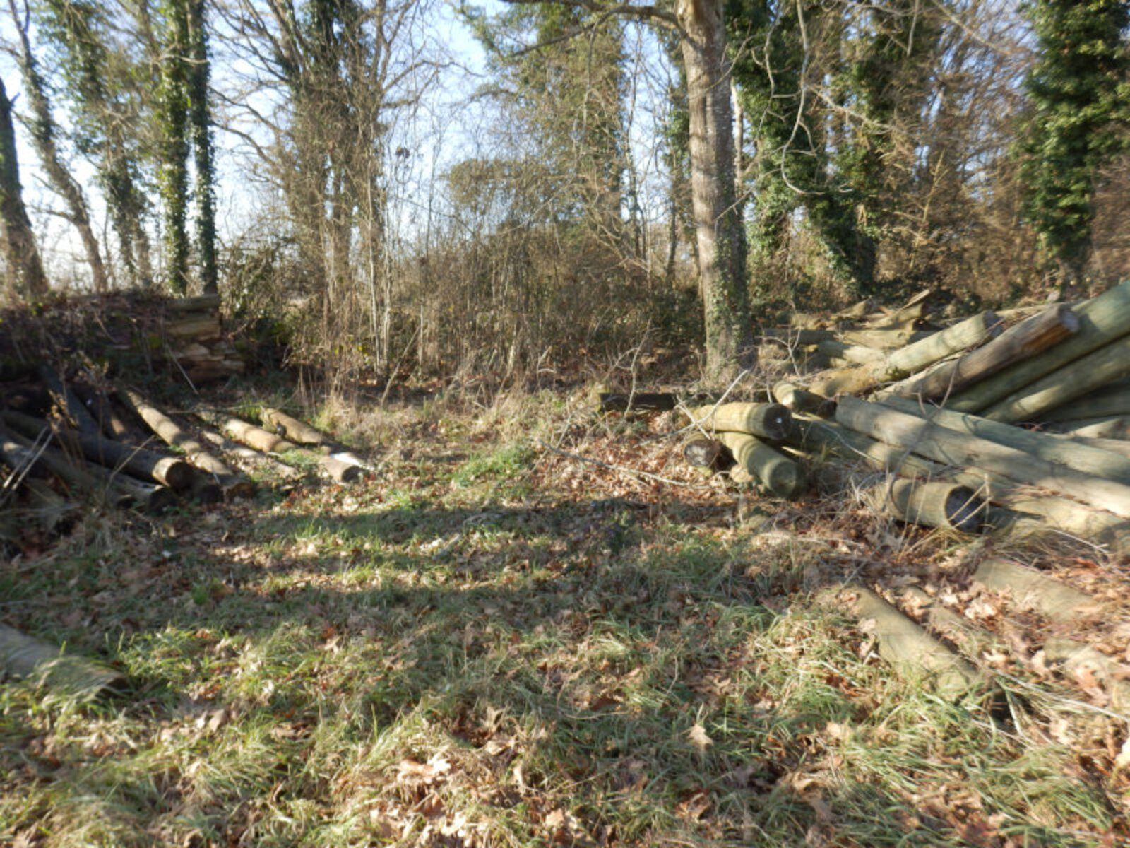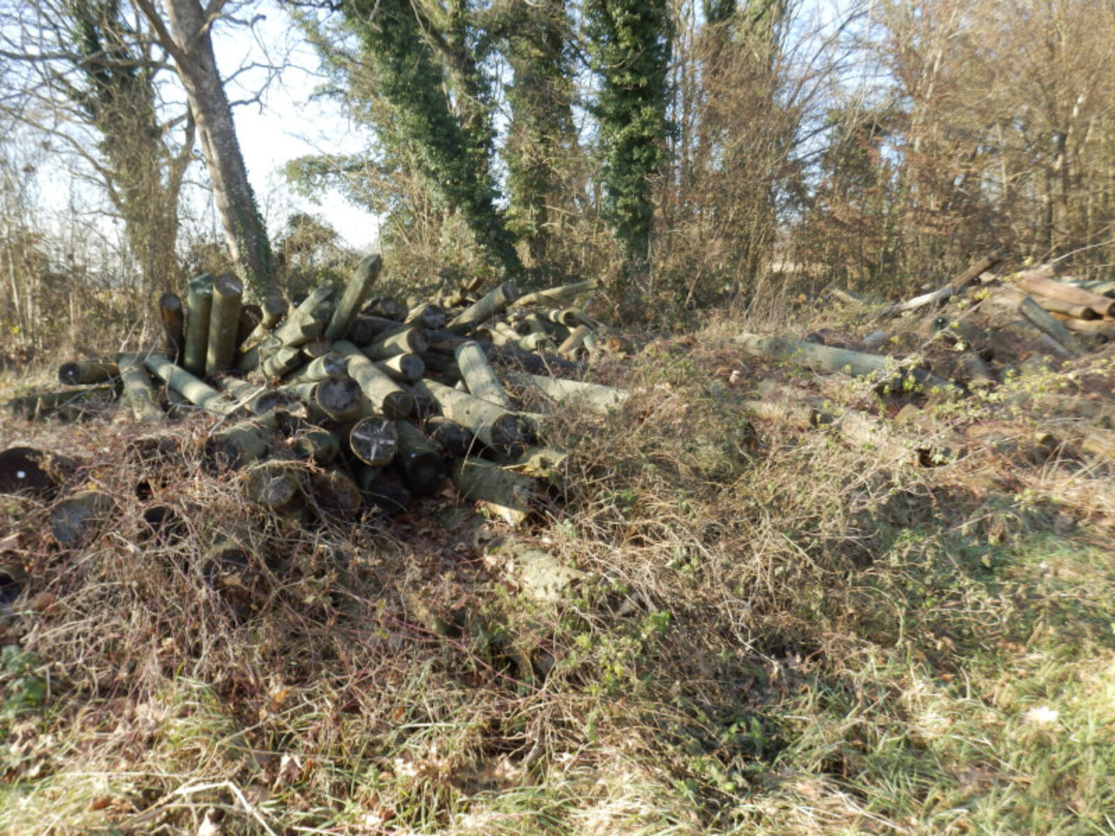 Dépôt sauvage de poteaux usagés et potentiellement toxiques à proximité d'un cours d'eau et d'un étang.