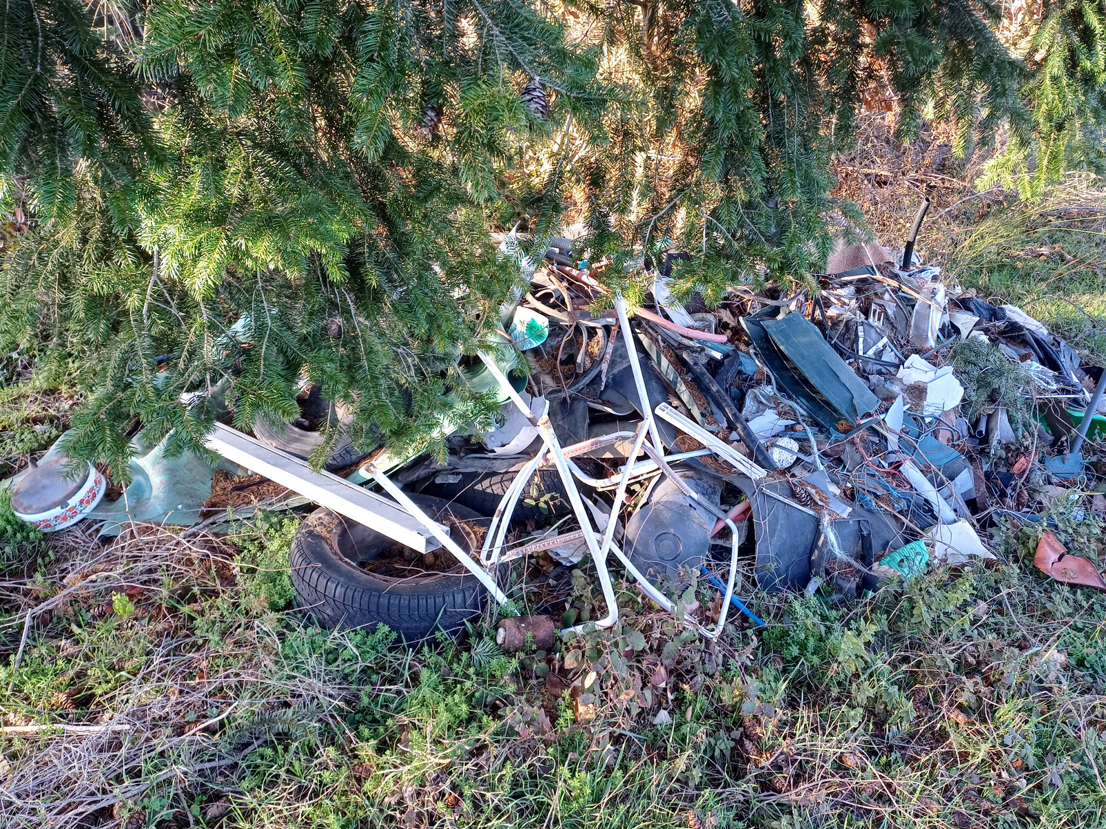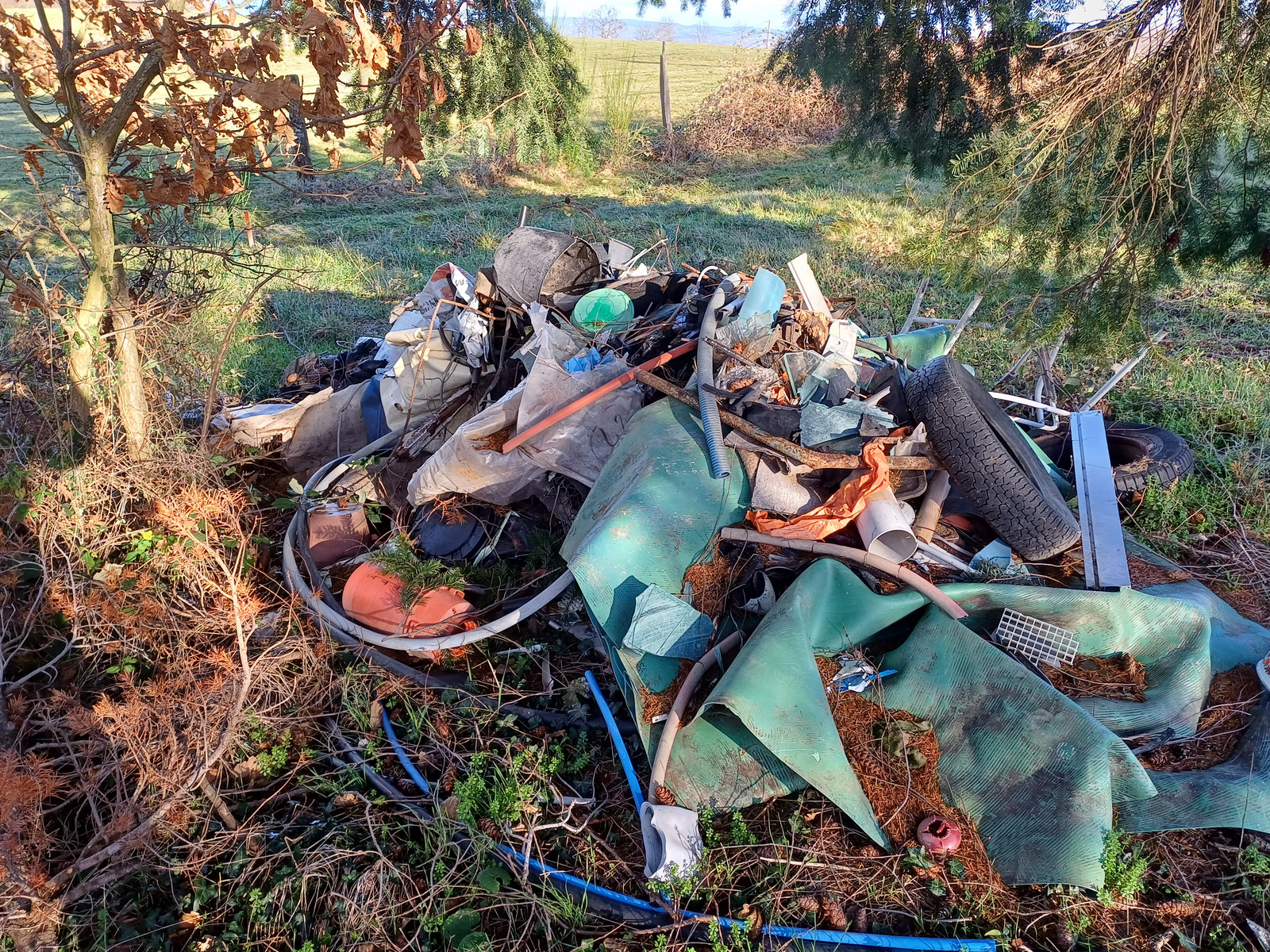 Dépôt sauvage de 2m3 de déchets divers (tuyaux pvc , pneus, différents plastiques...) sur la commune de St-Alban-les-Eaux