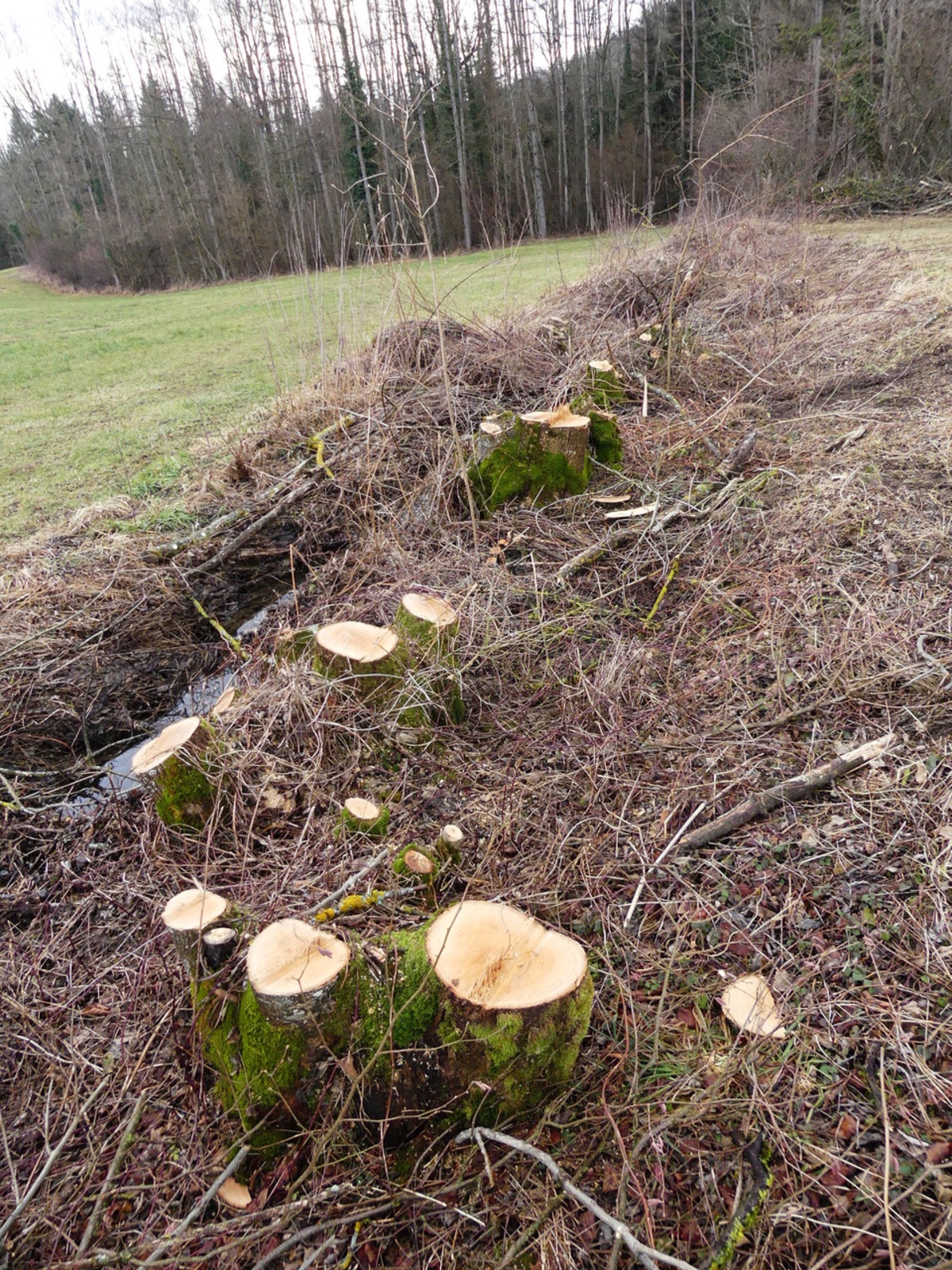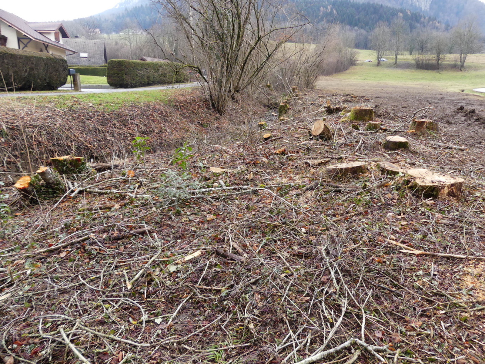 Depuis plusieurs années, des coupes et aménagements successifs ont été réalisés sur des haies bocagères et arbres en bord de ruisseau : ouvertures, busages, recepages, coupes à blanc et entassement de branchages. Ces actions ont un impact visible sur les milieux naturels et les écoulements.