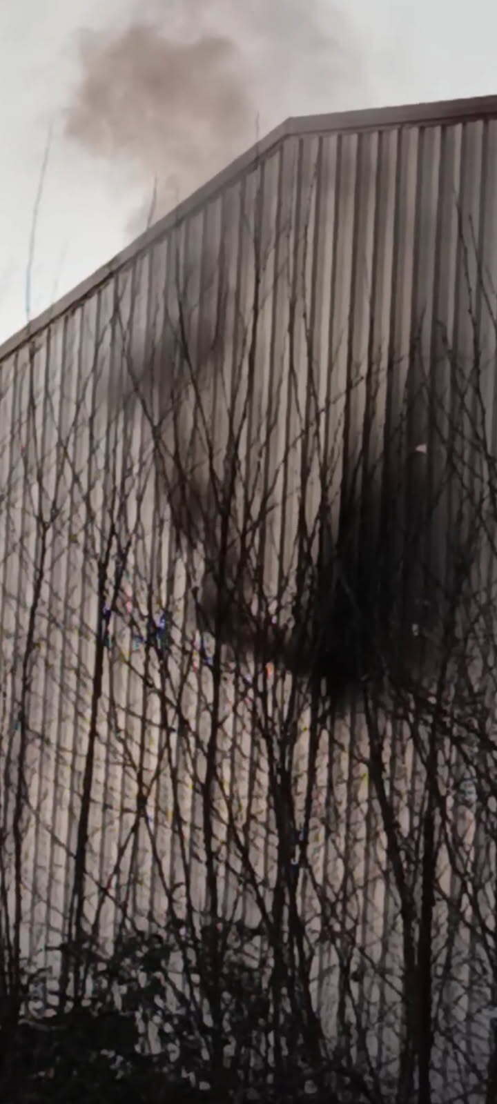 Sortie de fumées nocives sur un côté de bâtiment industriel ou garage automobile, ainsi que des flammes, depuis au moins deux semaines jour et nuit.