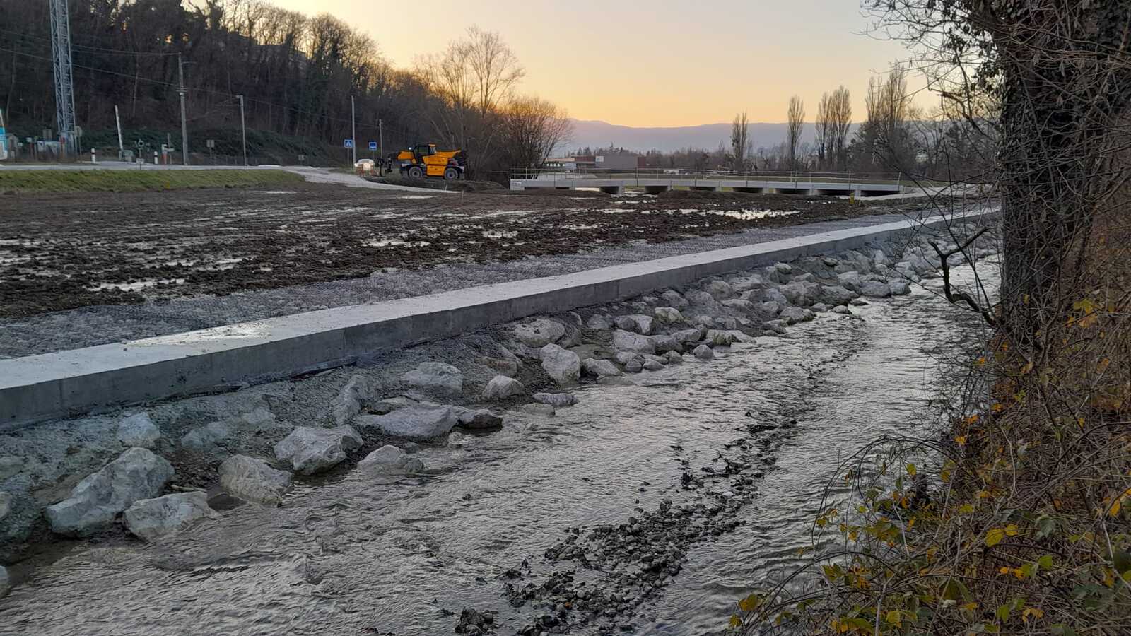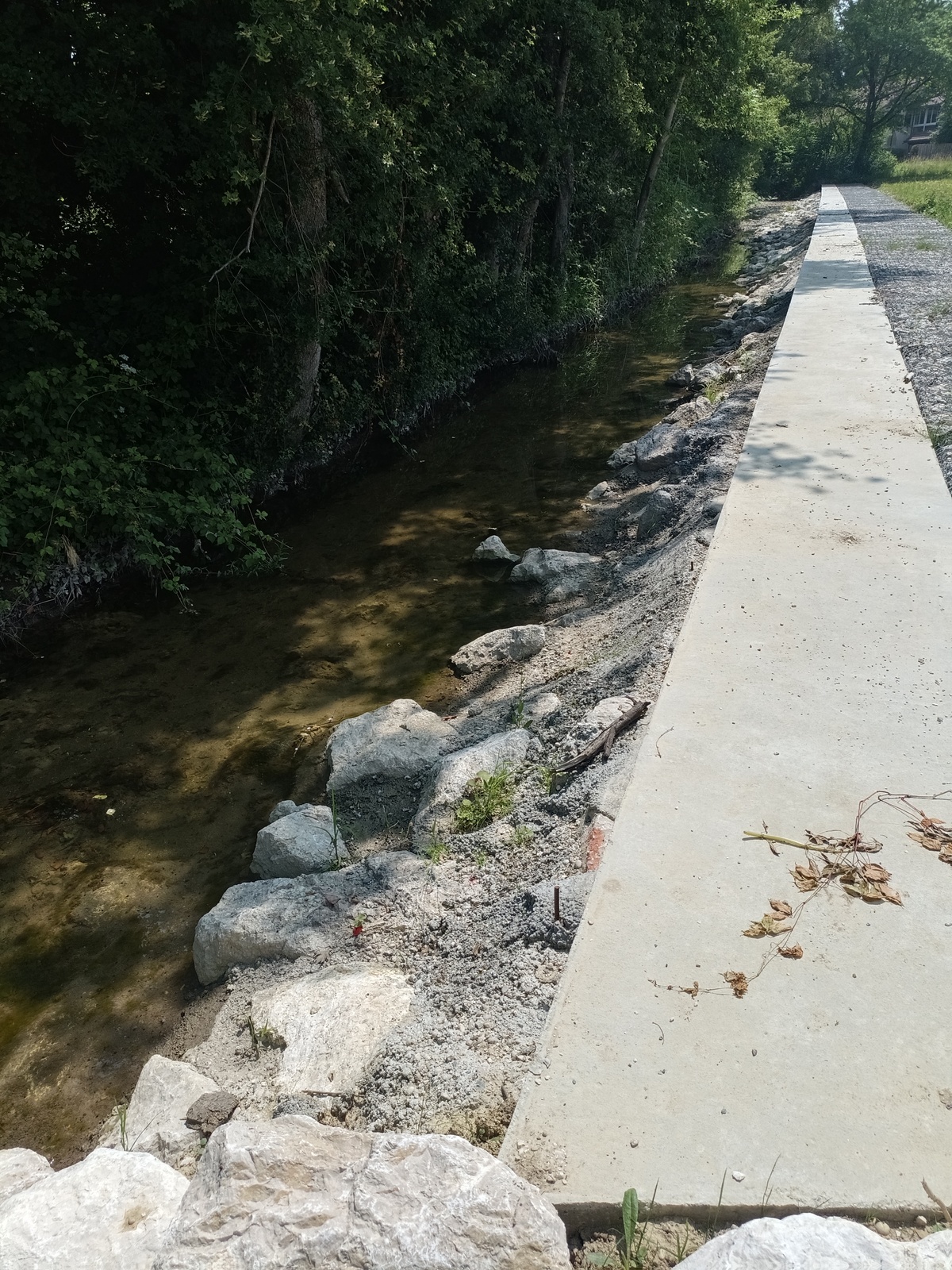 Il faut juste veiller aux EEE et à leur dissémination (solidages notamment, mais pas que. Visiblement ils ont déjà arraché de la balsamine) et à la partie ouest (surverse) pour aménager au moins localement une pente douce sur le linéaire canalisé et améliorer/opacifier le substrat sur les gabions derrière (cf photo). Point négatif (mais on ne peut rien y faire), une via Rhôna proche de la ripisylve (6 m) tout le long de la zone.