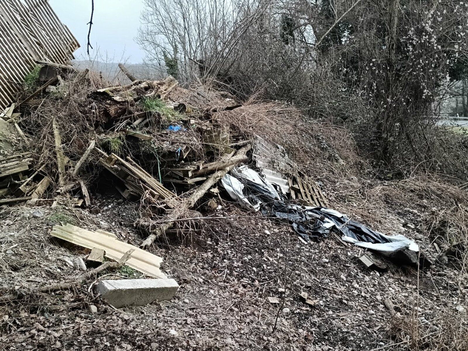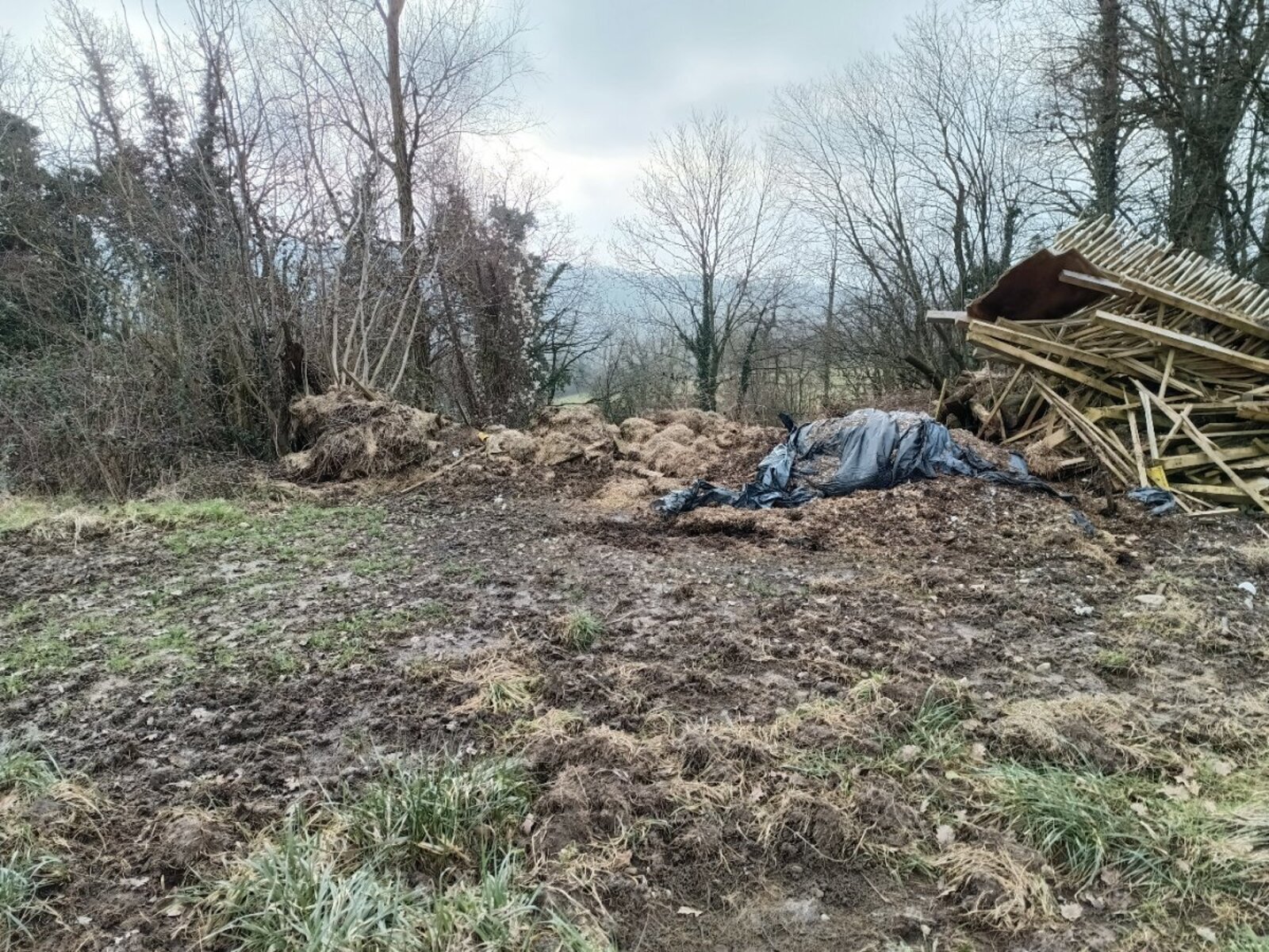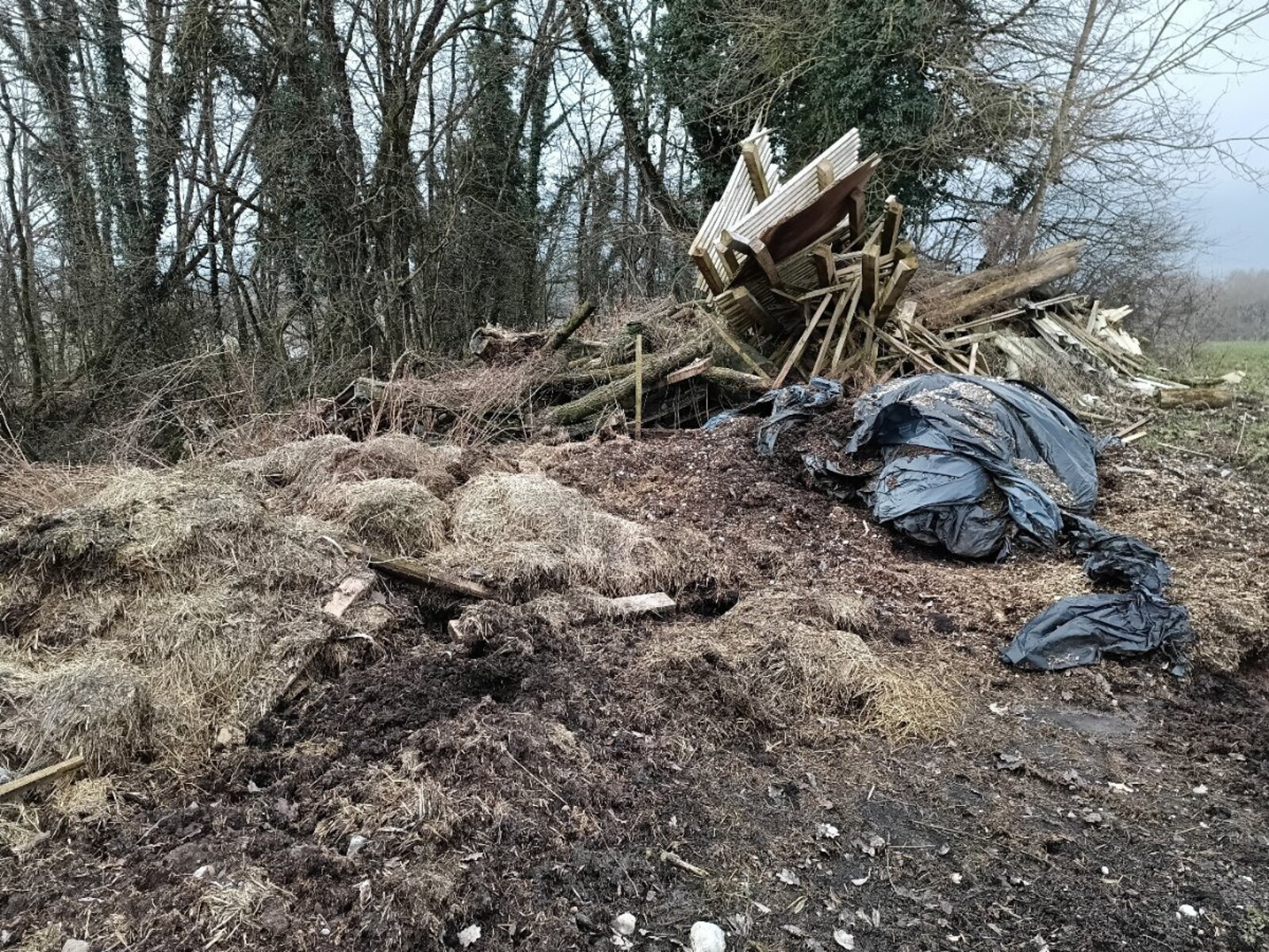 Les déchets sont majoritairement d’origine agricole, comprenant du vieux foin, des plastiques agricoles (bâches de bottes), du bois de démolition, des poteaux, ainsi que du fibrociment potentiellement amianté. L’ensemble dégage une forte odeur et pourrait présenter un risque sanitaire et environnemental, d’autant qu’un blaireau semble avoir creusé son terrier sous le dépôt.