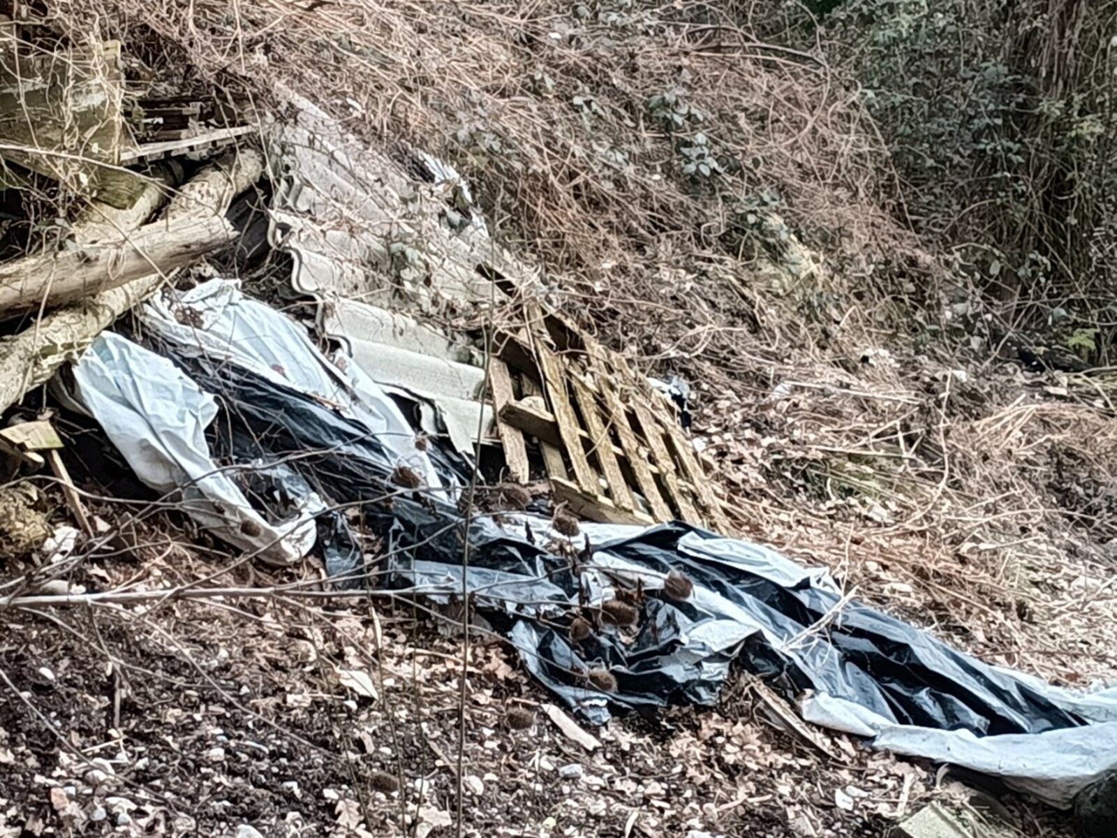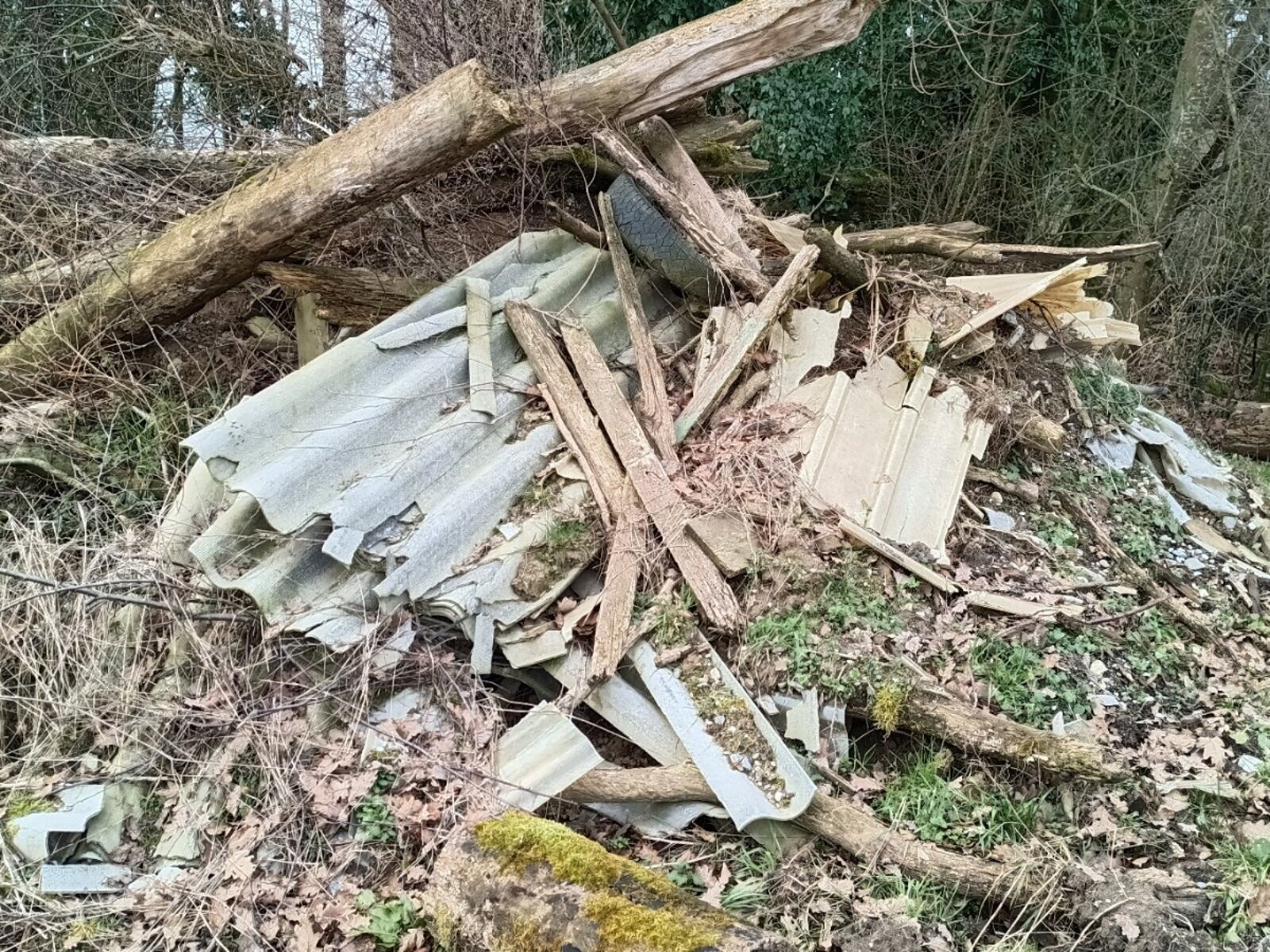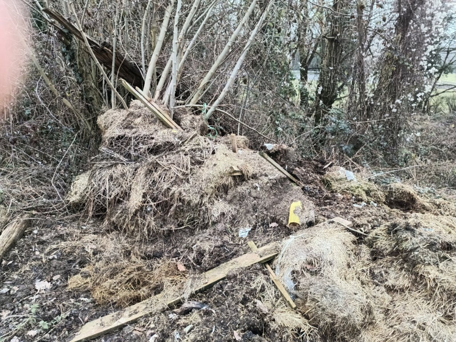 Les déchets sont majoritairement d’origine agricole, comprenant du vieux foin, des plastiques agricoles (bâches de bottes), du bois de démolition, des poteaux, ainsi que du fibrociment potentiellement amianté. L’ensemble dégage une forte odeur et pourrait présenter un risque sanitaire et environnemental, d’autant qu’un blaireau semble avoir creusé son terrier sous le dépôt.