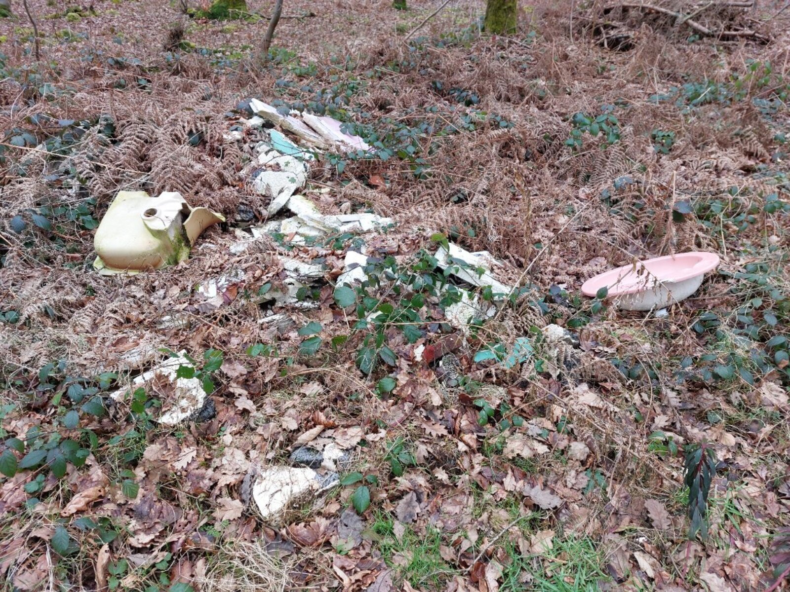 Il s'agit d'un dépôt de restes de chantier de salle de bain datant de plusieurs années, le long du chemin forestier, accessible depuis la route.