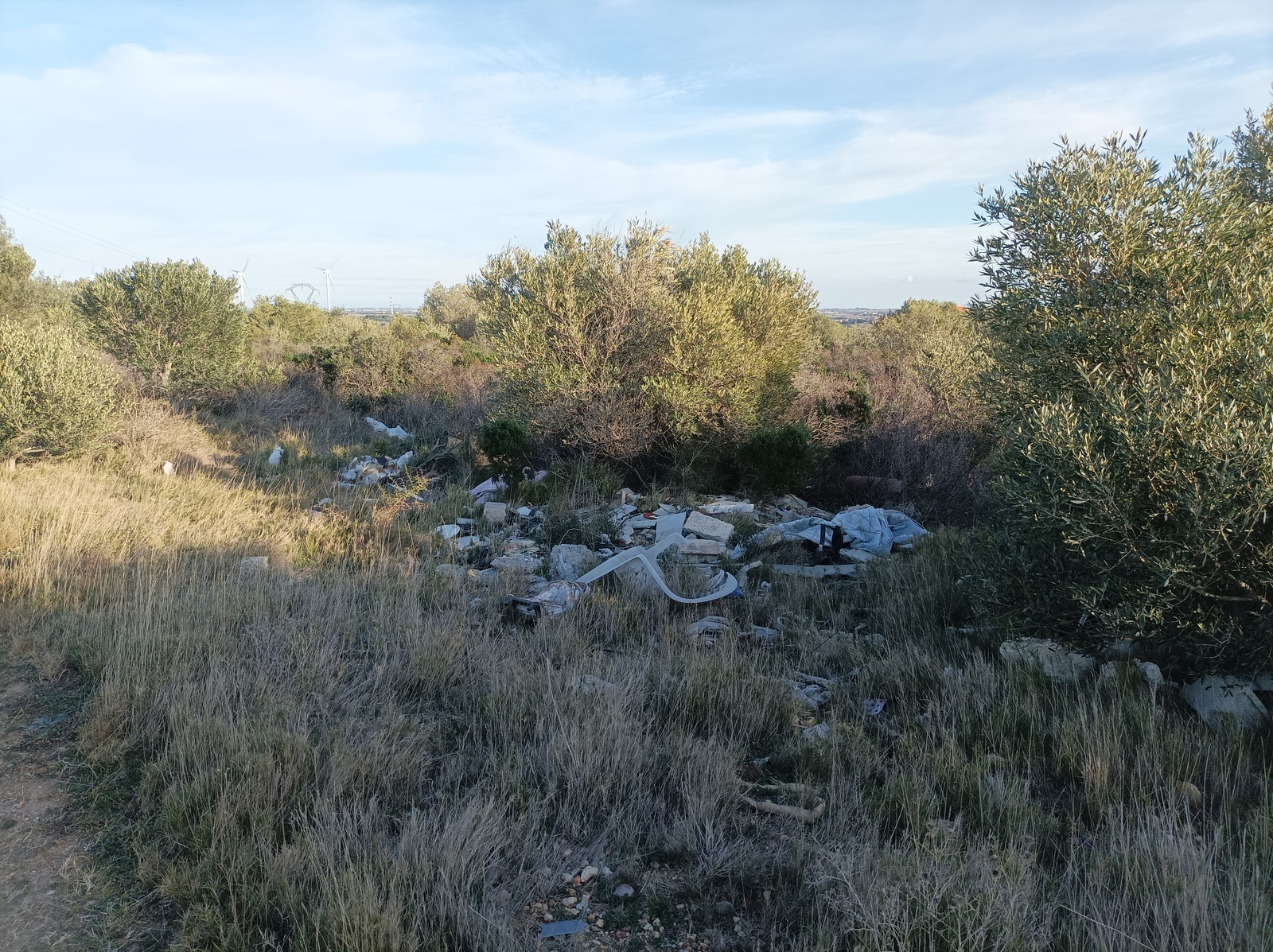 Un dépôt principalement de gravats, comprenant également des plastiques, vêtements... dispersés en garrigue.